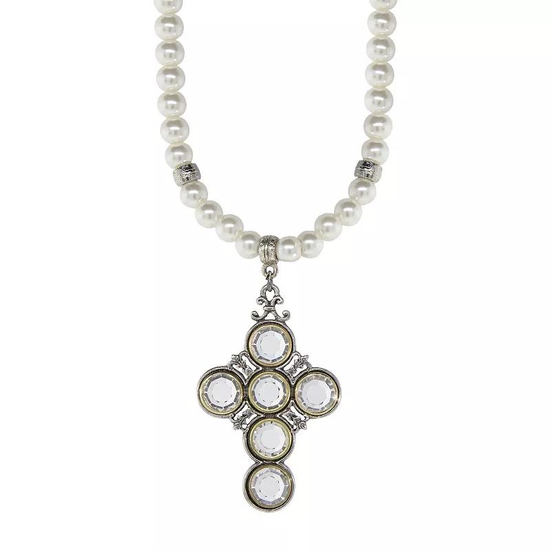 This fashion pearl and gold-tone necklace showcases a gorgeous cross in shimmering clear crystals. With sophisticated elegance and classic design, there's no doubt you"ll Dazzle the crowd with a cross and fashion pearl necklace. A lovely accessory and symbol of life and spirituality, the cross necklace is a reminder of our spiritual selves and of the opportunities that faith gives us. Experience this cross as a blessing all while wearing a strand of pearls - the perfect accessory for almost any occasion. | Symbols Of Faith Pewter Cross Faux Pearl Clear Swarovski Crystal Necklace - 15" Adj, White