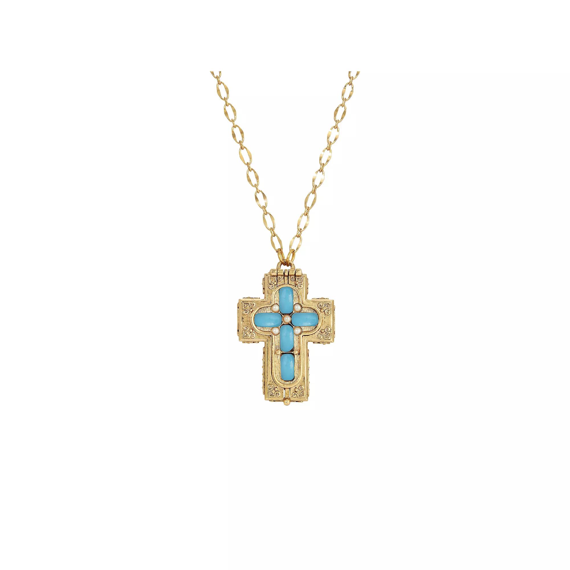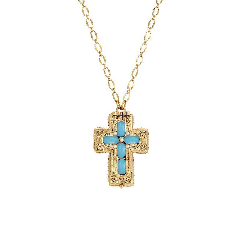Display your spirituality proudly with this lovely blue moonstone-embellished gold tone cross locket necklace from Symbols of Faith. Display your spirituality proudly with this lovely blue moonstone-embellished gold tone cross locket necklace from Symbols of Faith. FEATURES Pendant size: 2.1 in. x 1.4 in. Chain length: 32 in. Clasp: lobster-claw Metal: alloy Plating: gold tone Finish: polished 1 photo opening Material: moonstone Nickel safe Not appropriate for children 14 years old and younger. Size: One Size. Color: Green. Gender: female. Age Group: adult.