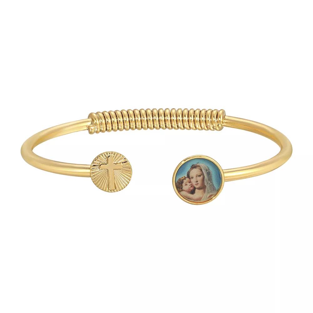 This delightful 14K Gold-Dipped Spring Hinge Bracelet with Cross and Mary and Child Decal Accent. This delightful 14K Gold-Dipped Spring Hinge Bracelet with Cross and Mary and Child Decal Accent. Metal: Alloy Length: 7 in. Plating: Gold tone Material: Acrylic Not appropriate for children 14 years old and younger. Size: One Size. Color: Multi. Gender: female. Age Group: adult.