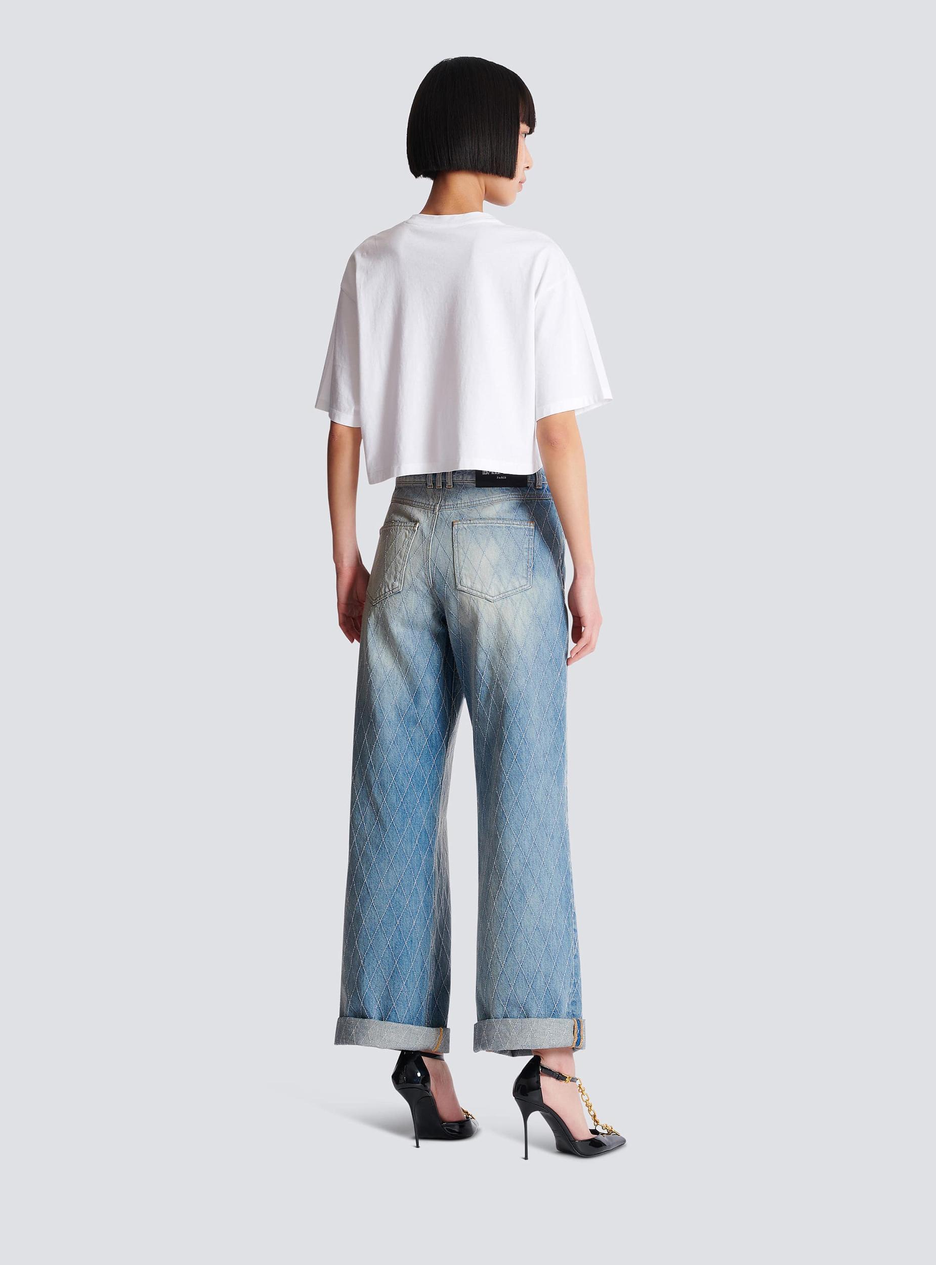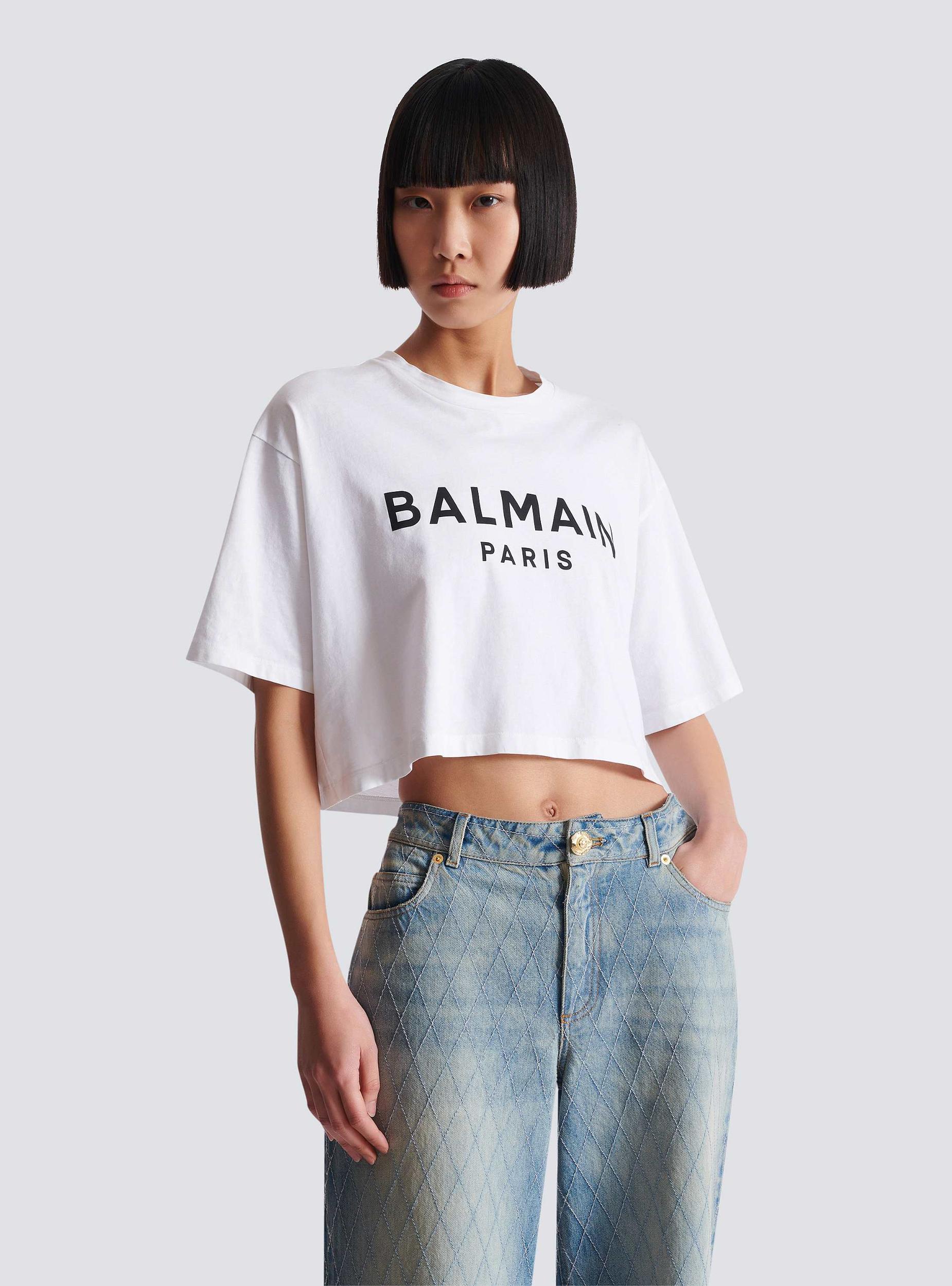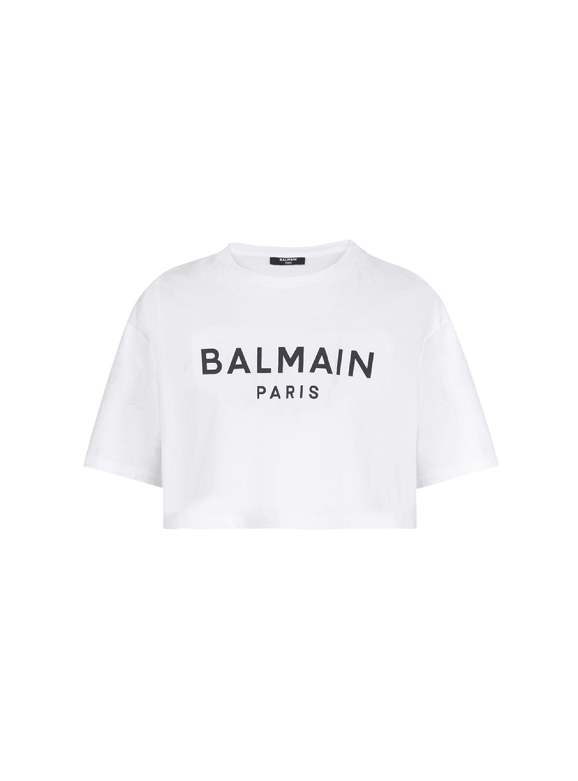 T-shirt with Balmain Paris printCropped, relaxed fitRound neck with ribbed trimShort sleevesContrasting Balmain Paris logo printed on the frontModel measures 180cm and wears a size SMain material: 100% cottonMade in PortugalItem: BF1EE020BB02100% of the cotton fibres used to make this garment are certified and organically farmed