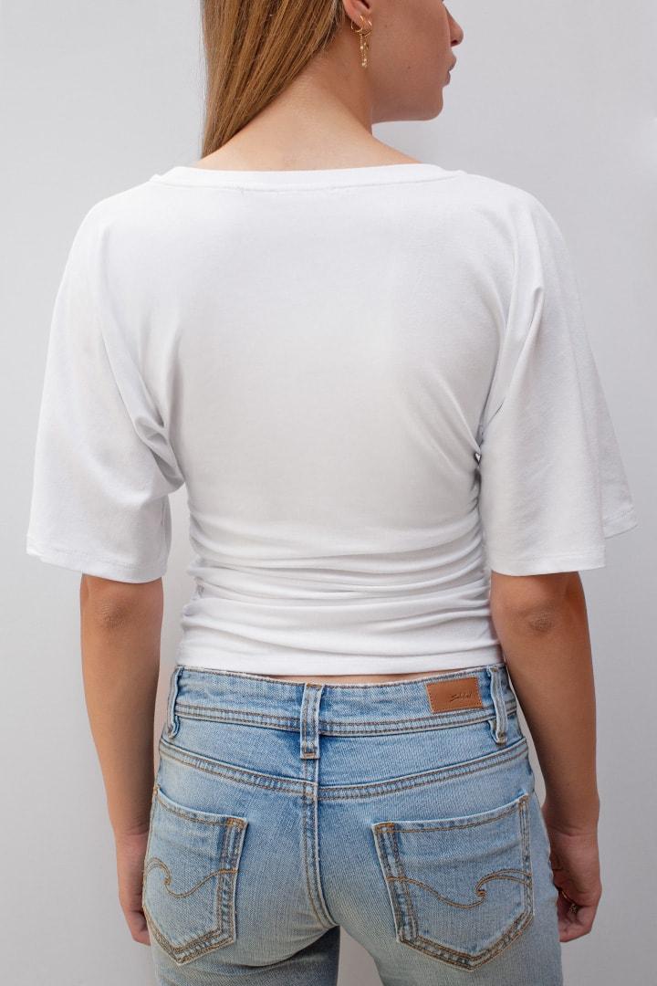 Crew neckline t-shirt, with side ruffle, short sleeves larghe, regular length, slim fit.