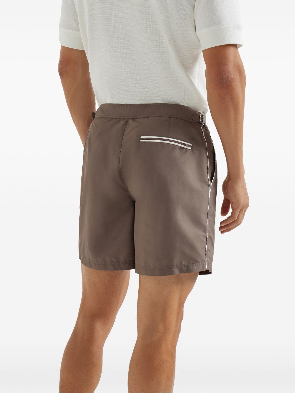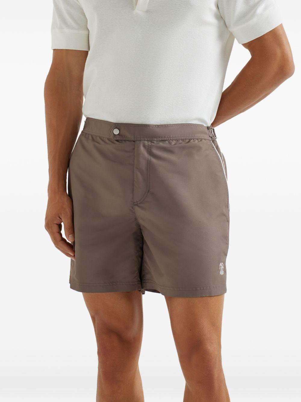 Brunello Cucinelli tabbed waistband piping swim shorts | Brown | hazelnut | piping | tabbed waistband | logo detail | back pocket | Be mindful to try on swimwear over your own garments. | Polyester/Nylon | Swim & Board Shorts | Swimwear | Clothing | Men