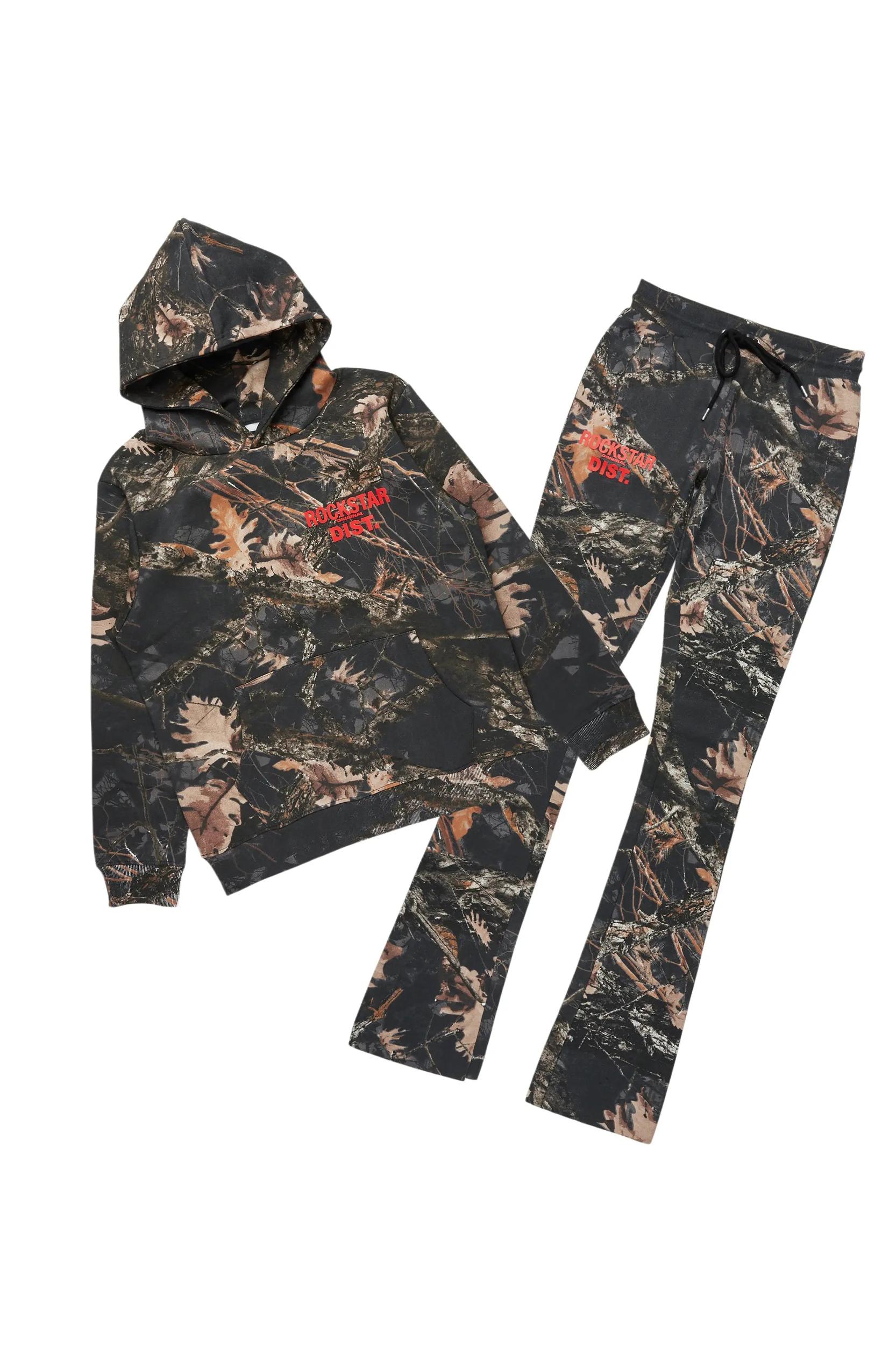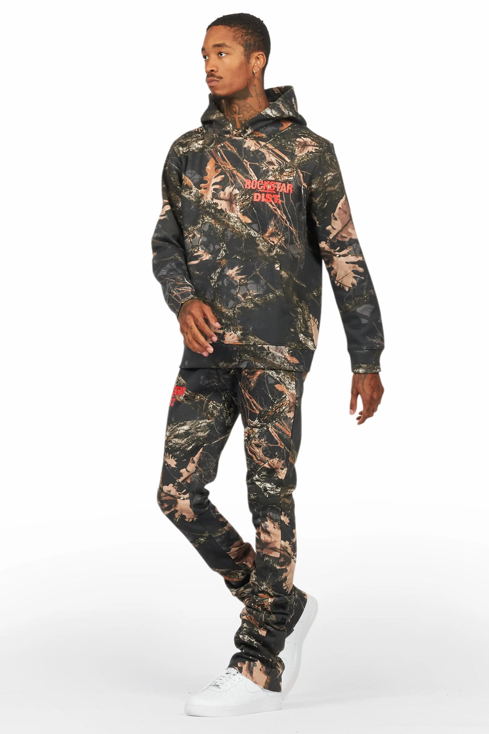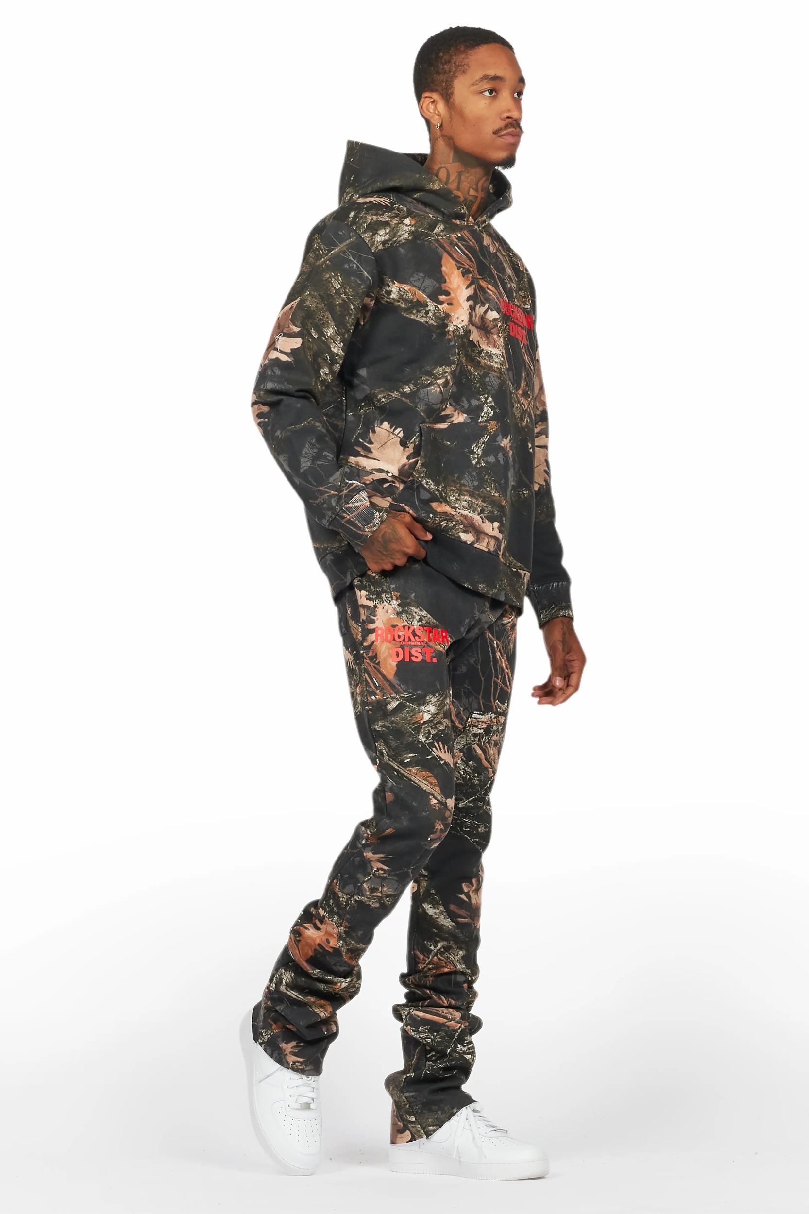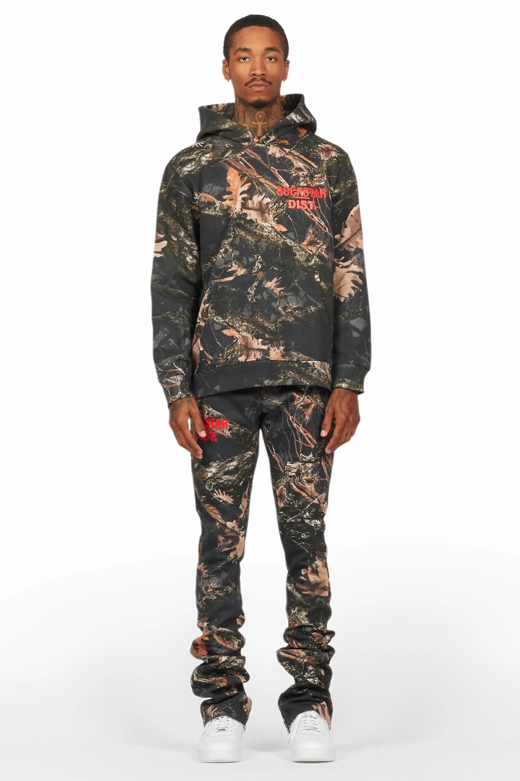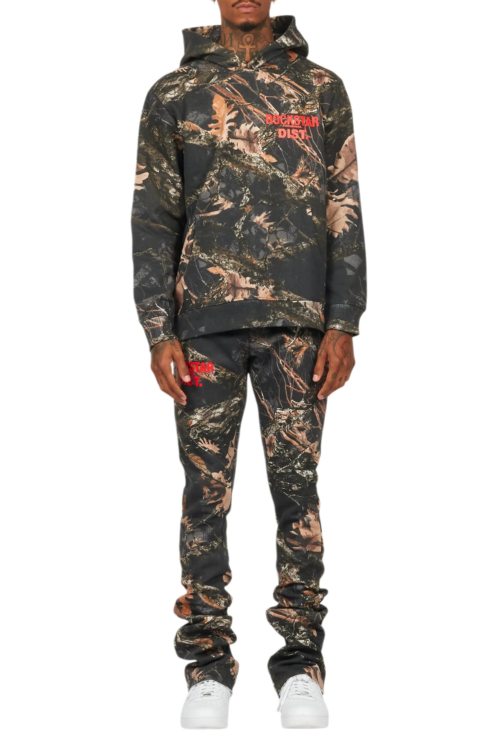 An urban two-piece hoodie and stack track pant set for men in black tree camo. Designed with organic cotton and custom detailing for a must-cop streetwear set. Drawstring hood Kangaroo pocket Ribbed knit trims Drawstring waistband Dual slant pockets Stacked construction Flare leg openings Custom RSO logos 35.75" seams *NOTE: These pants are purposefully designed with extra long legs so the fabric properly bunches at the hem, creating the stacked flare style.
