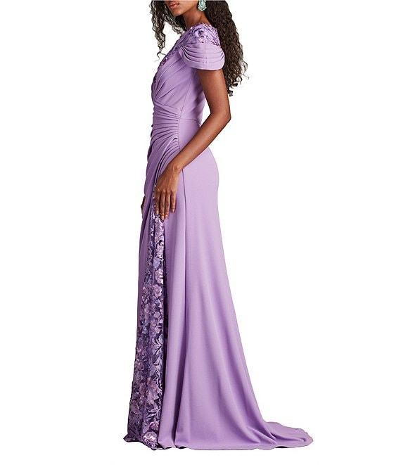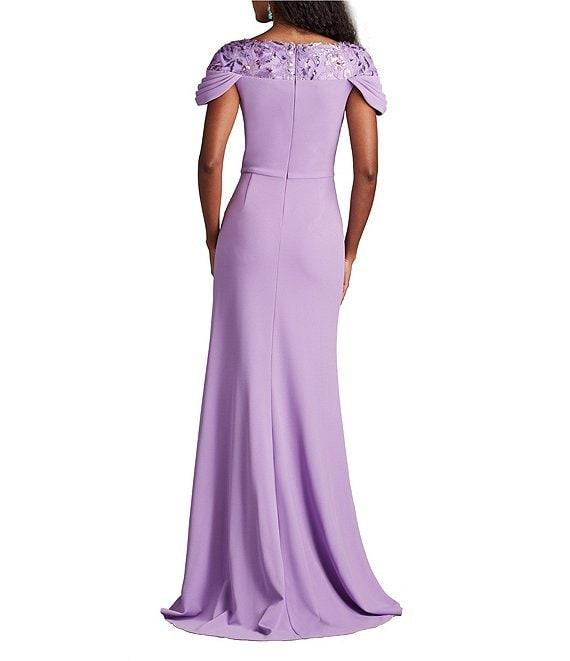 Tadashi Shoji Crepe Embroidered Sequin V Neck Short Sleeve Sheath Gown
