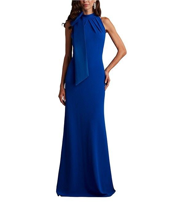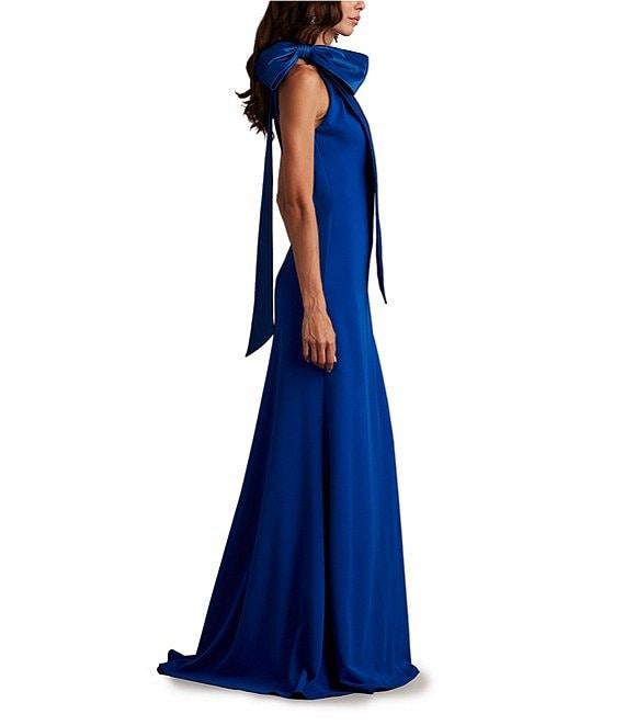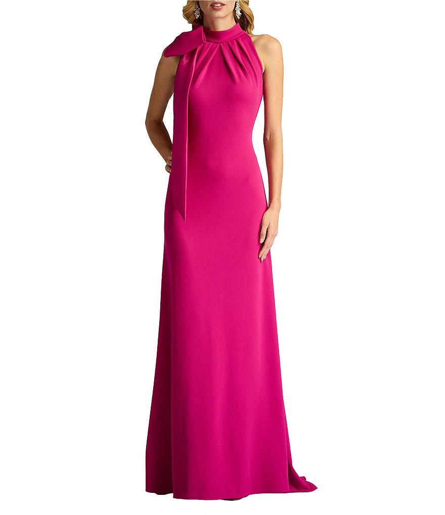 Tadashi Shoji Crepe Halter Mock Neck Taffeta Bow Sleeveless Gown