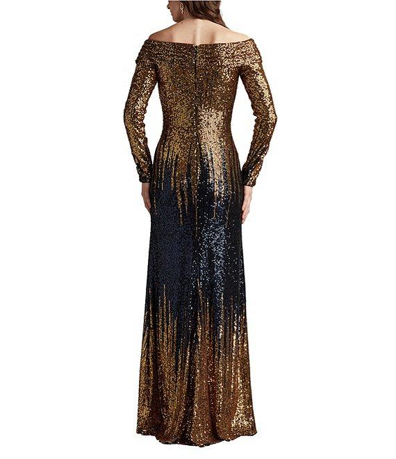 From Tadashi Shoji, this dress features: Sequin fabrication Sheath silhouette Off the shoulder neckline Long sleeves Ombre Zip back closure Approx. 63.25" length Polyester/Spandex Dry clean Imported.