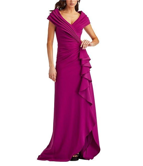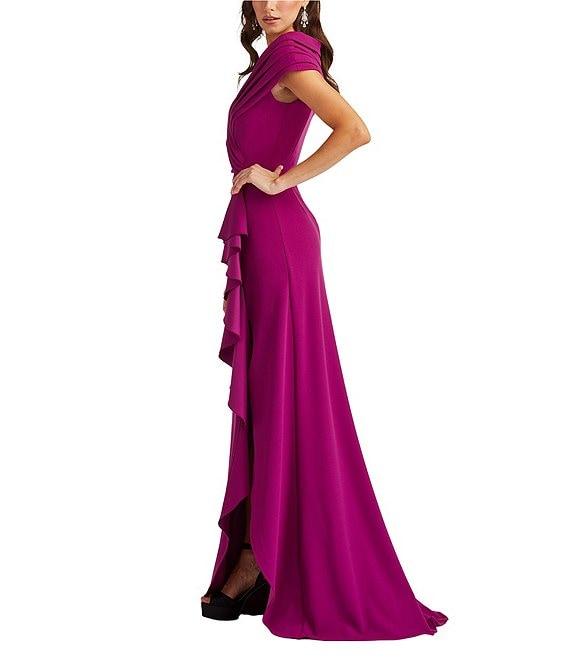 From Tadashi Shoji, this gown features: Sheath silhouette Crepe fabrication Pleated portrait collar Cap sleeves Ruffle front detail Front slit Zip back closure Lined Approximate length 63.25" Polyester/Spandex Dry clean Imported.