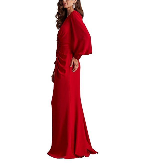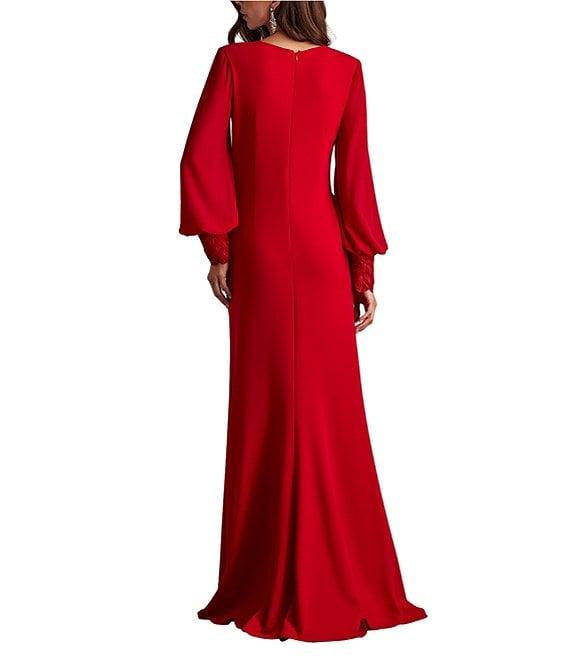 From Tadashi Shoji, this gown features: Column silhouette Crepe fabrication V-neckline Long bishop sleeves with lace cuffs Pleated bodice Floral lace applique at center front Front slit Zip back closure Lined Approximate length 63.25" Polyester/spandex Dry clean Imported.