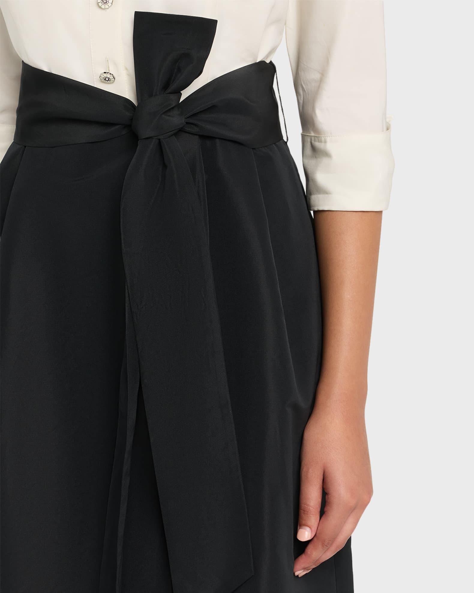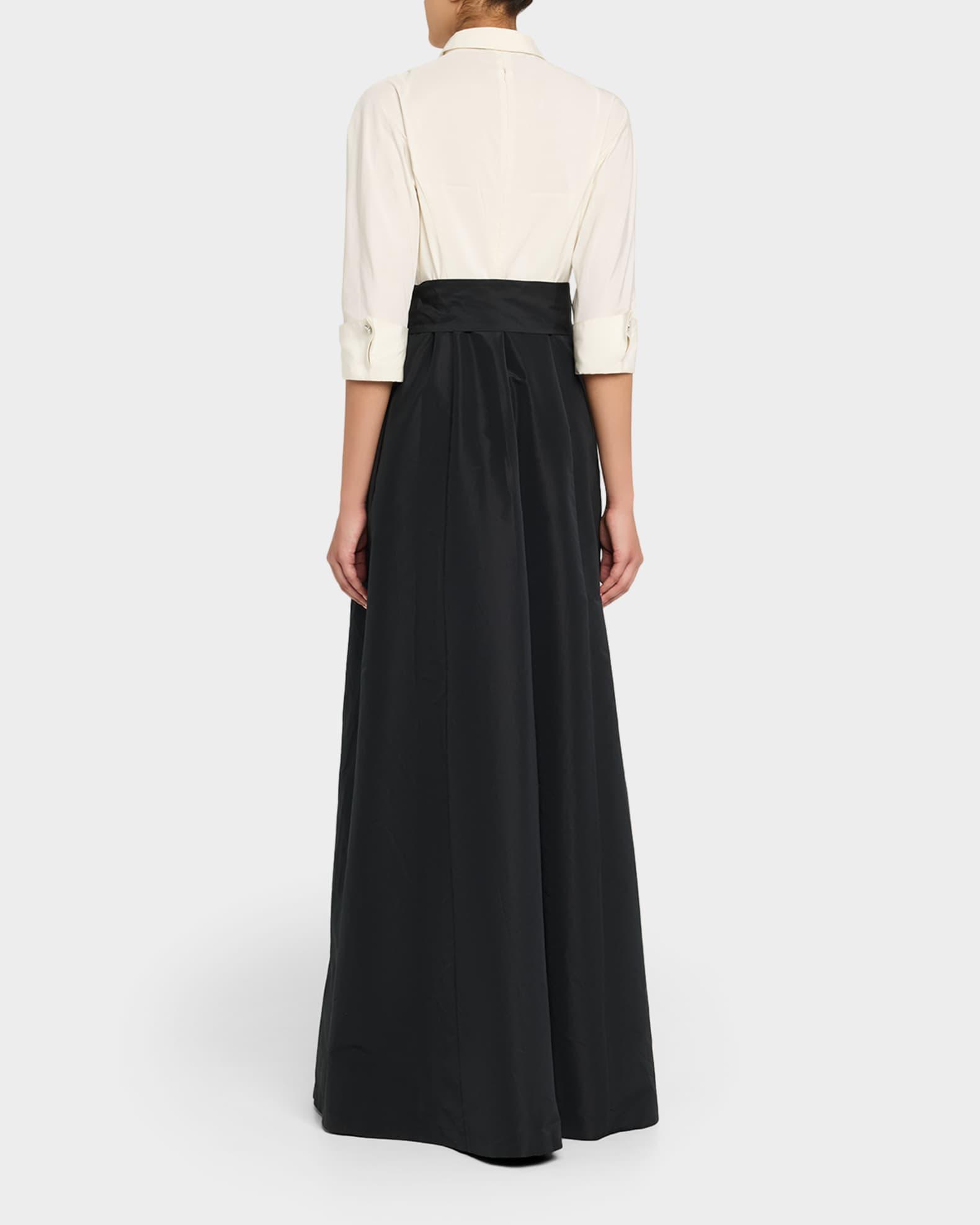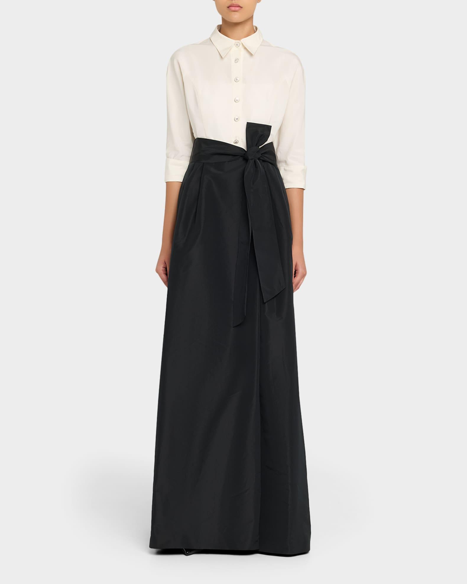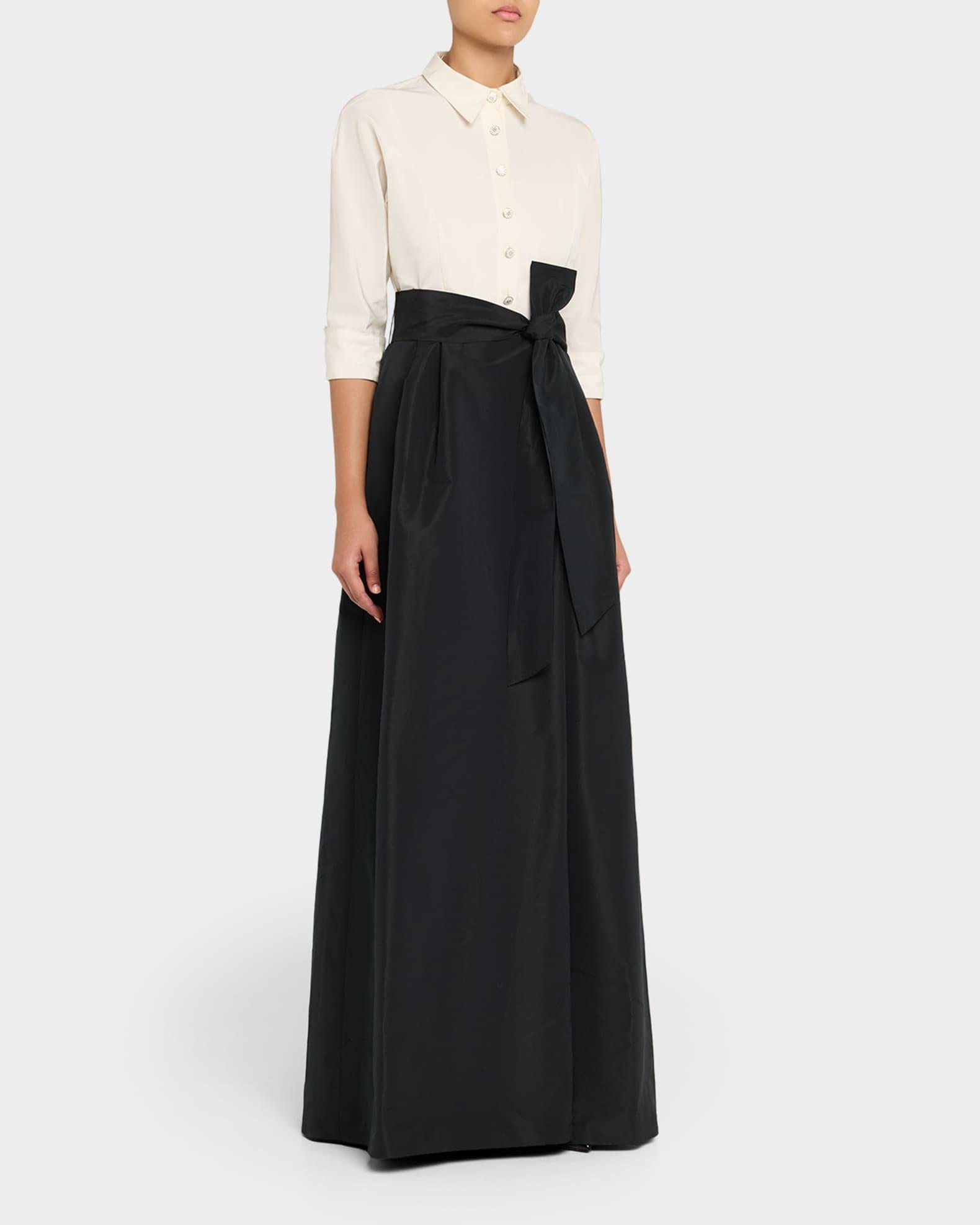 Rickie Freeman for Teri Jon taffeta faille gown enhanced with jeweled buttons Point collar; button-front bodice Elbow-length sleeves Self-tie bow waist A-line silhouette Full length Center back zip Polyester Lining: Polyester Dry clean Imported