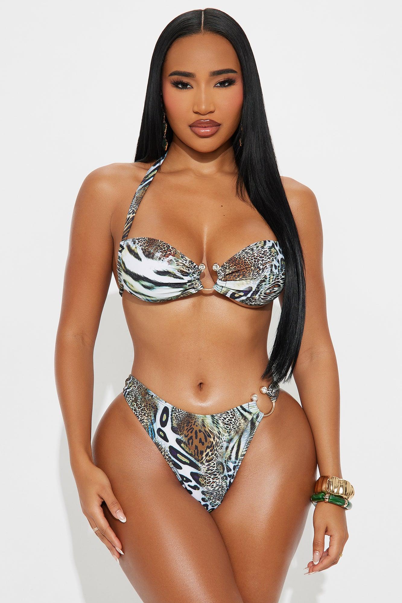 Available In Green/combo, Lime, Multi Color And Tan/Multi. 2 Piece Bikini Mixed Leopard Animal Print Bandeau Bikini Top Halter Neck Ties Rhinestone Hardware Bikini Bottom Cheeky Full Stretch Final Sale Disclaimer: Print Placement May Vary Pair With Summer Muse Cowl Neck Mesh Cover Up Micro Shorts Set To Complete The Look! Self : 92% Polyester 8% Spandex Lining : 95% Polyester 5% Spandex California Proposition 65WARNING: Cancer and Reproductive Harm - www.P65Warnings.ca.gov.