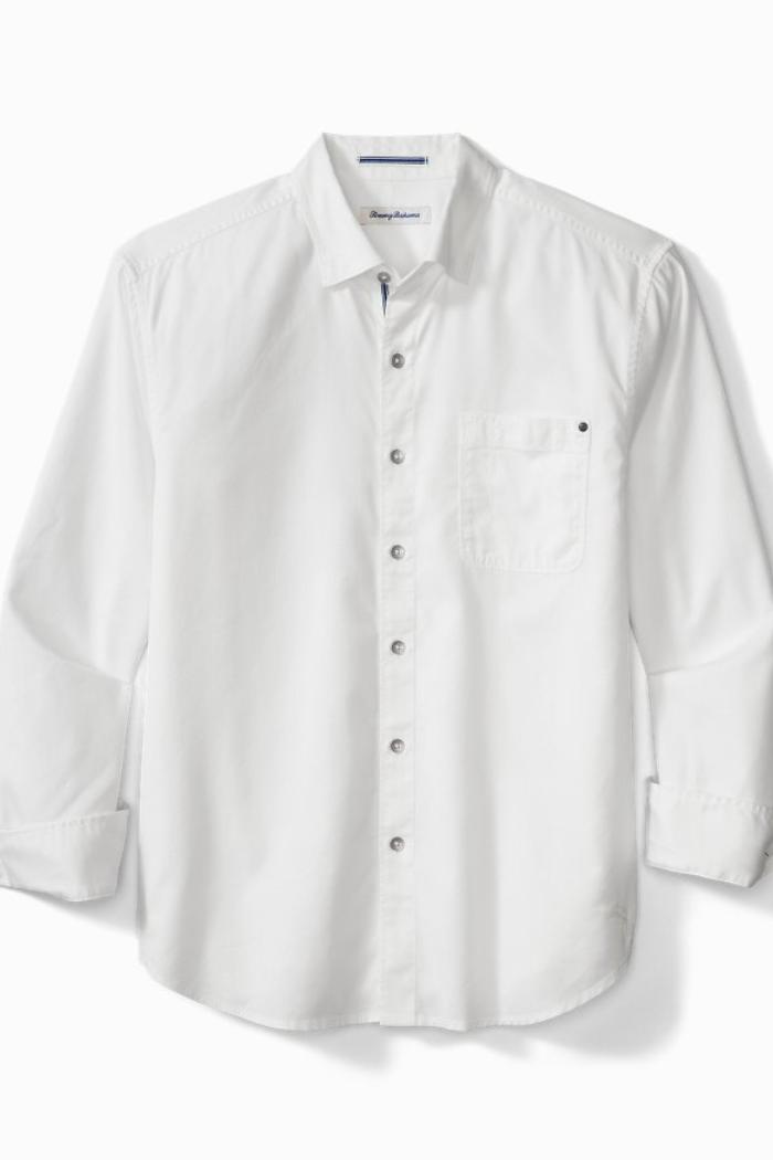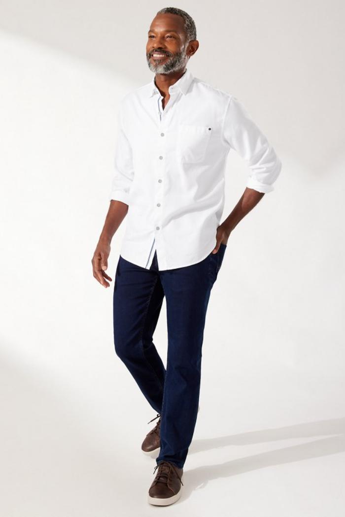 Long-sleeve shirt with craig collar, rounded patch pocket, shirttail hem, and side-seam gussets.