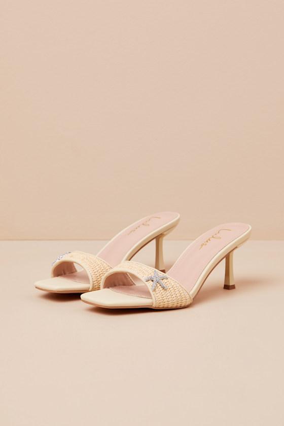 These mermaid-approved lil' heels are ready to strut through your next beachside destination, with a woven raffia construction and an open-toe upper. The trendy square footbed features a tapered vamp strap with a sparkly rhinestone starfish detail at the outstep, all atop a sleek slide-on design.