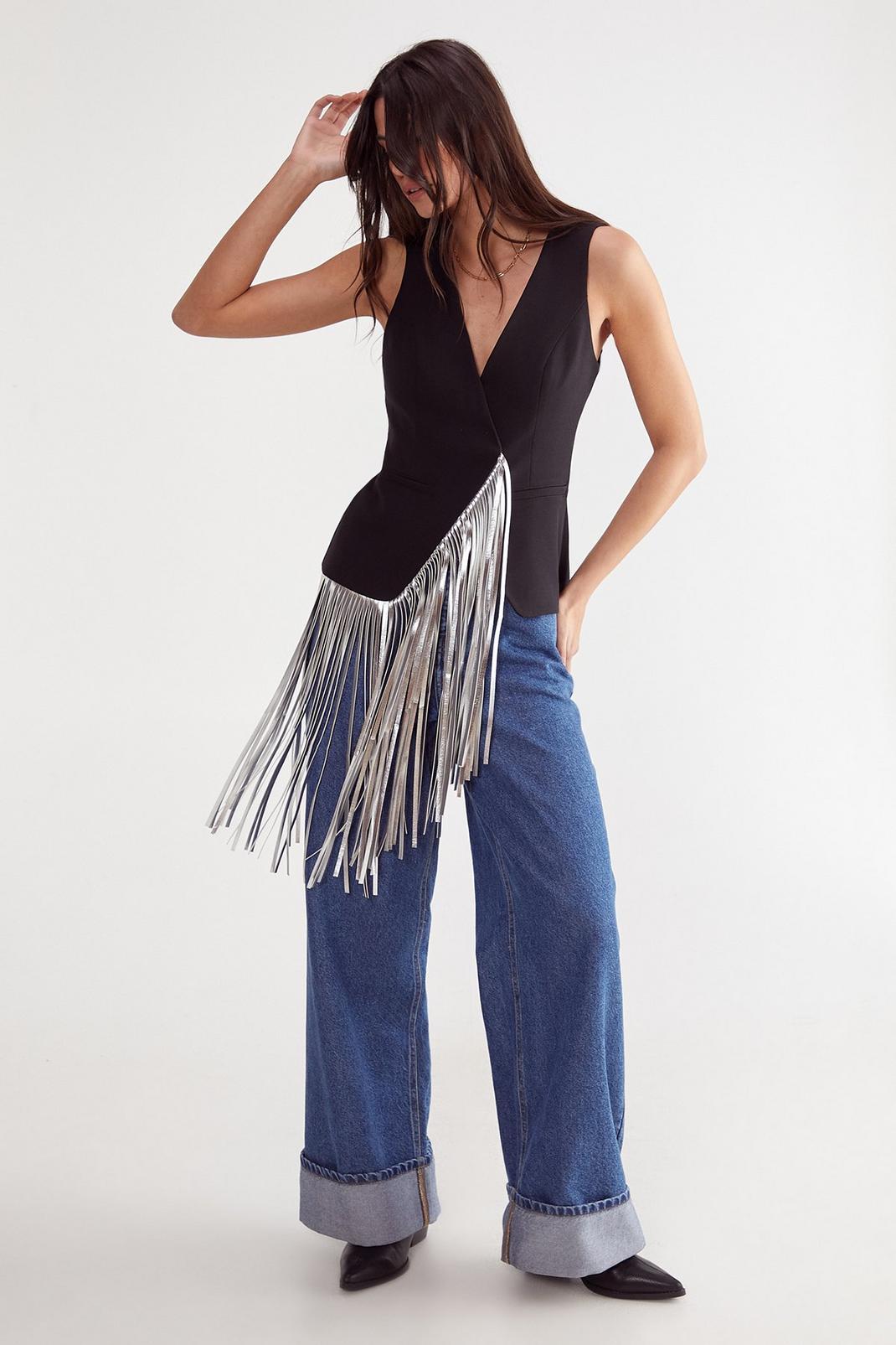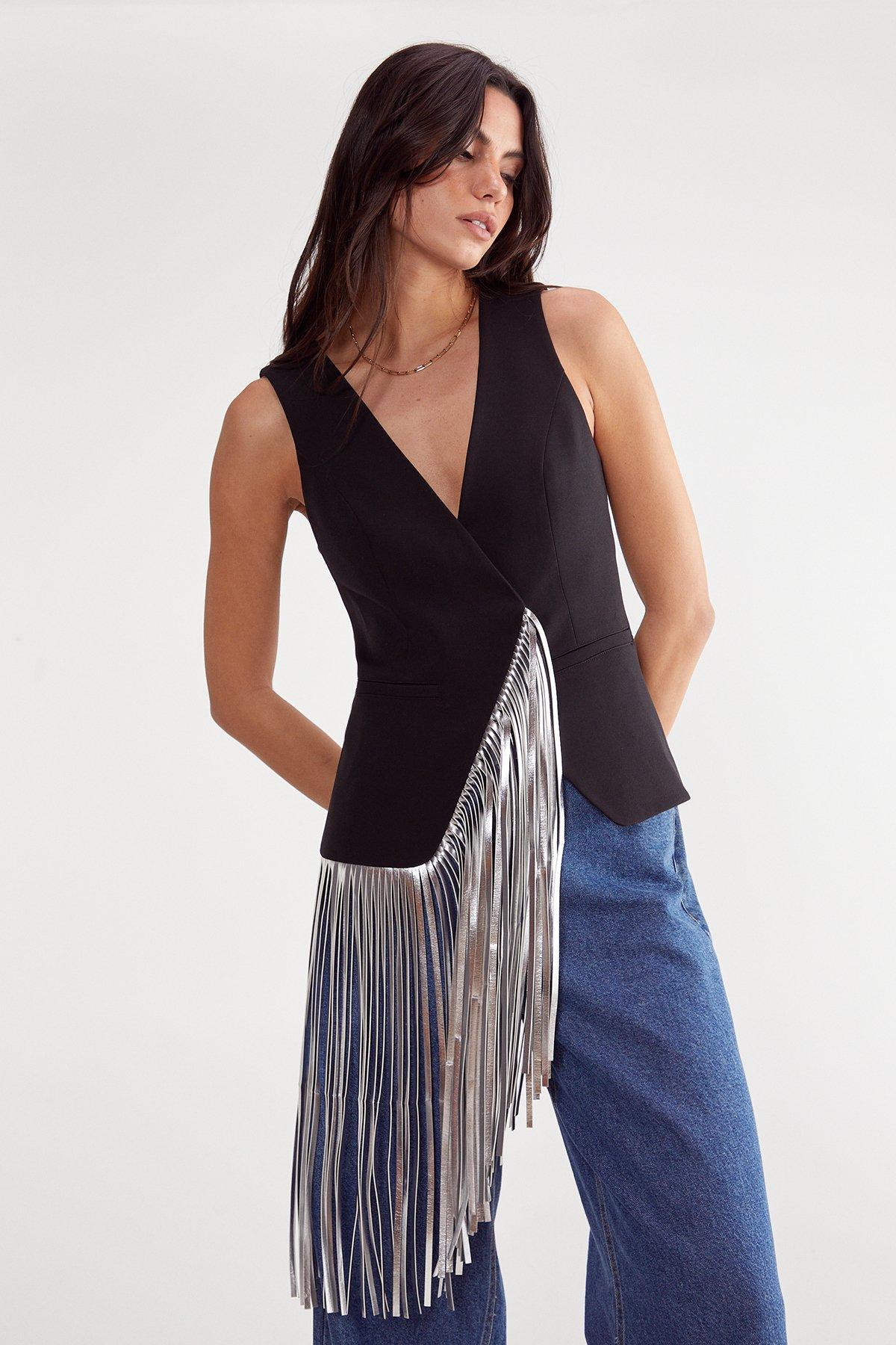 We caught you looking at our Tailored Faux Leather Fringed Top. Click this way to shop your new favorite. Best dressed- secured.