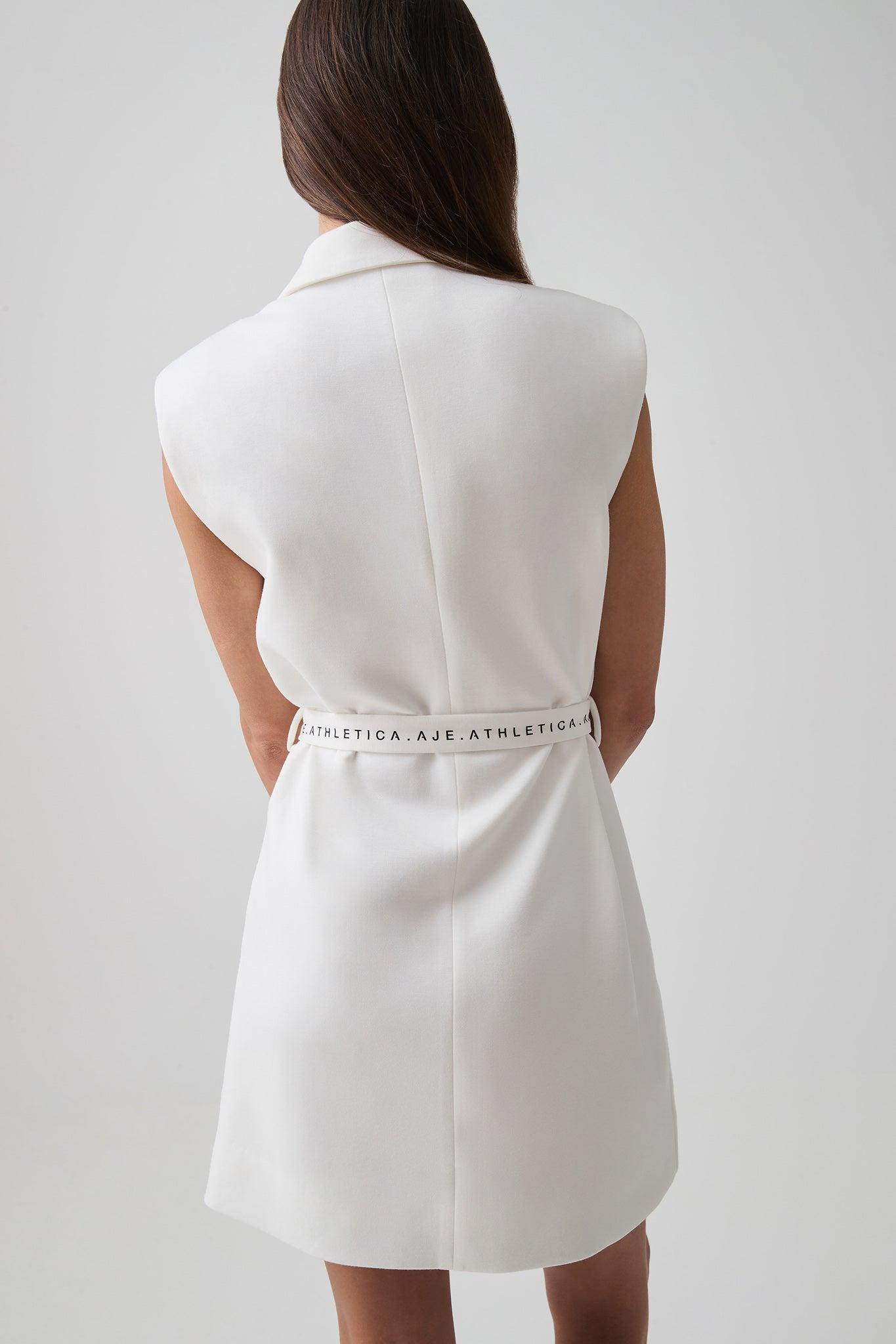 PRODUCT DETAILS Womens blazer dress Sleeveless Double breasted snap closure Mock welt pocket at left chest Signature pleated pocket Logo belt Shoulder pads SIZE & FIT Helena wears a size 8/S and is 173cm/5’8” FABRICATION 50% Recycled Polyester 45% Recycled Viscose 5% Spandex
