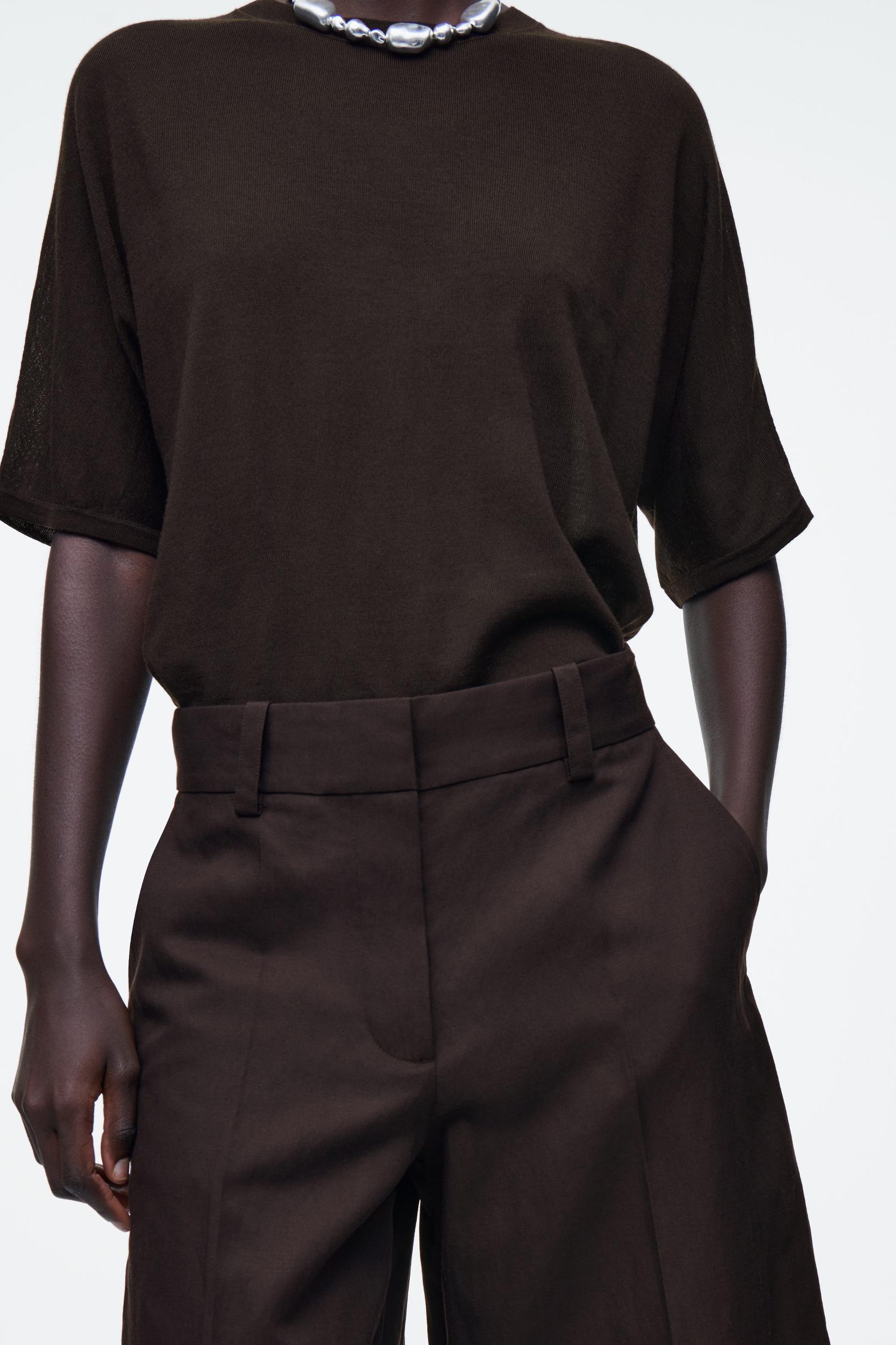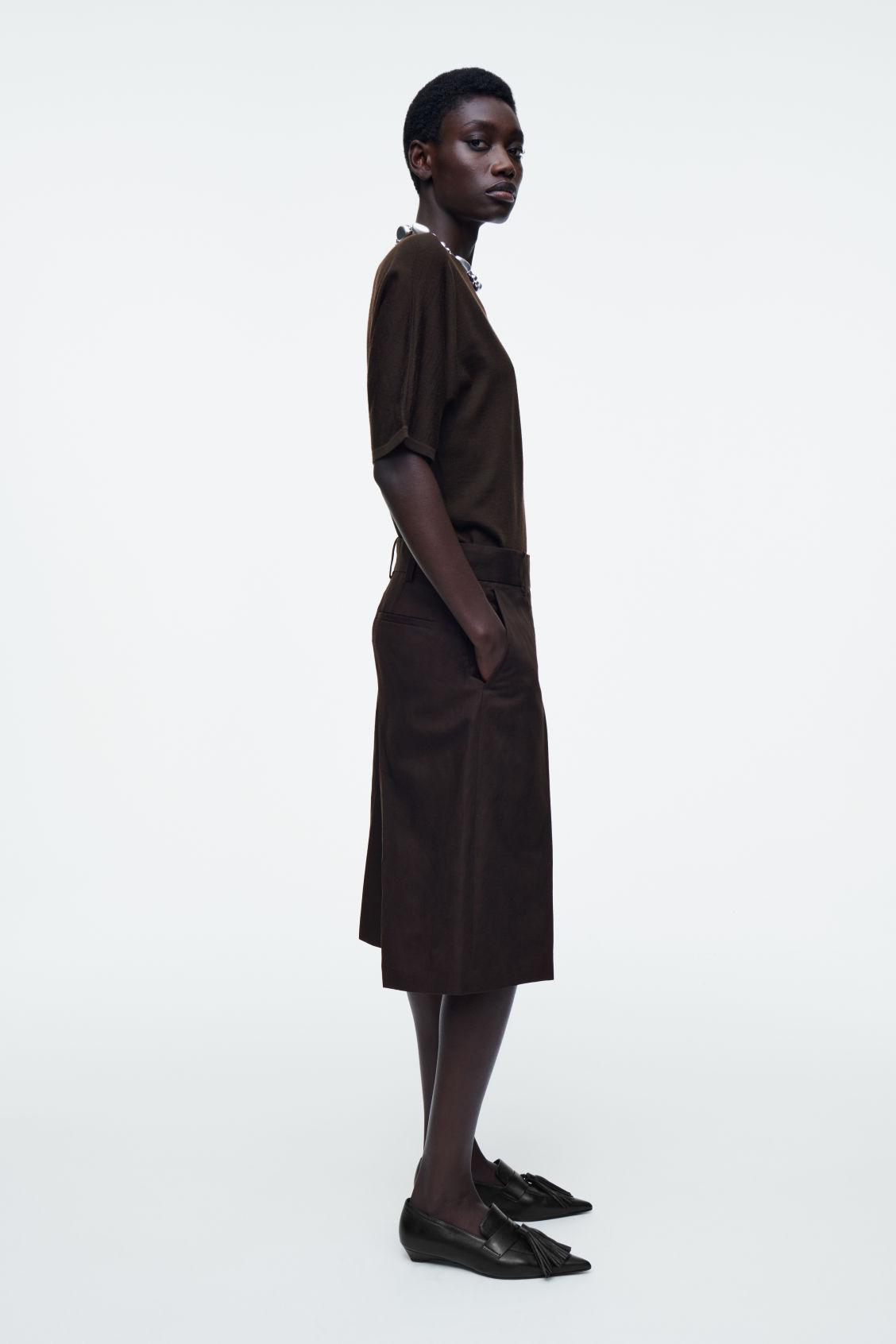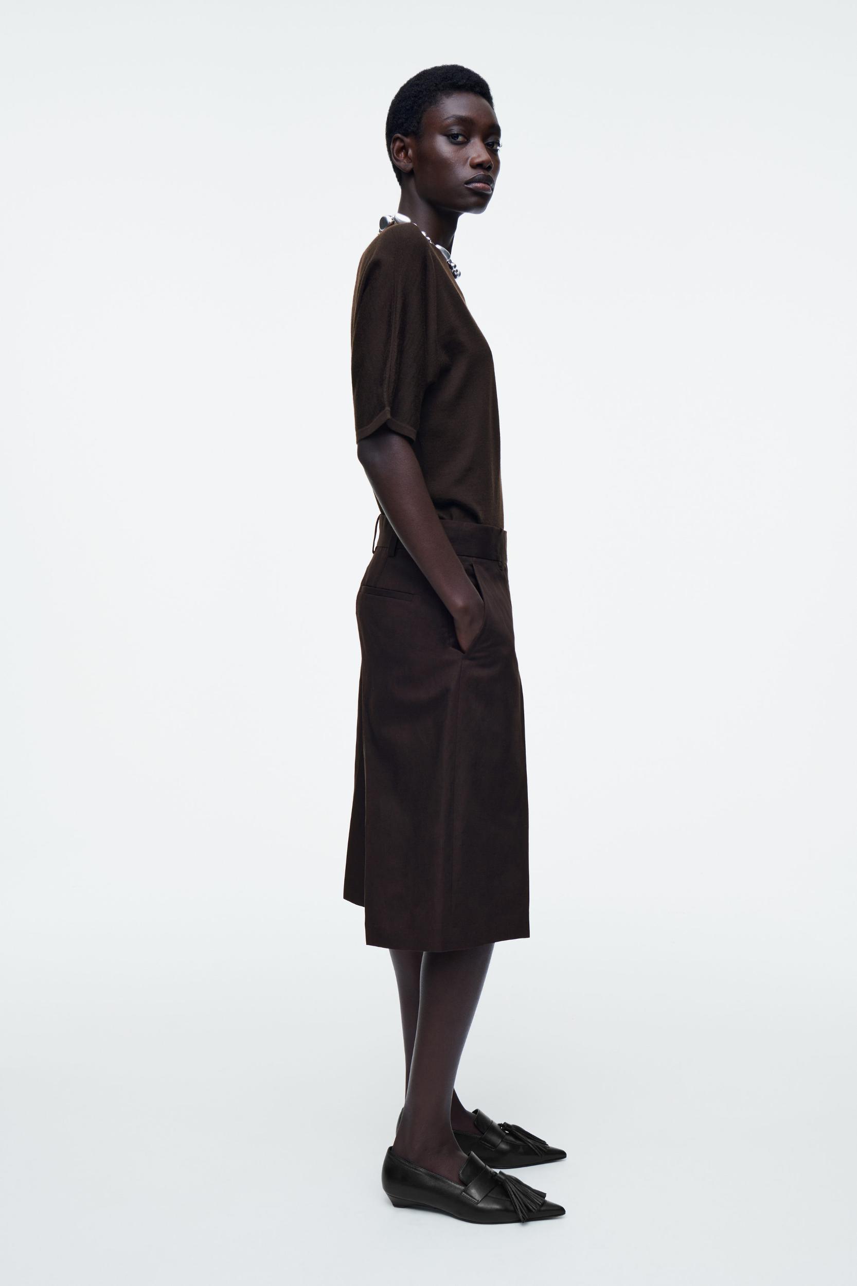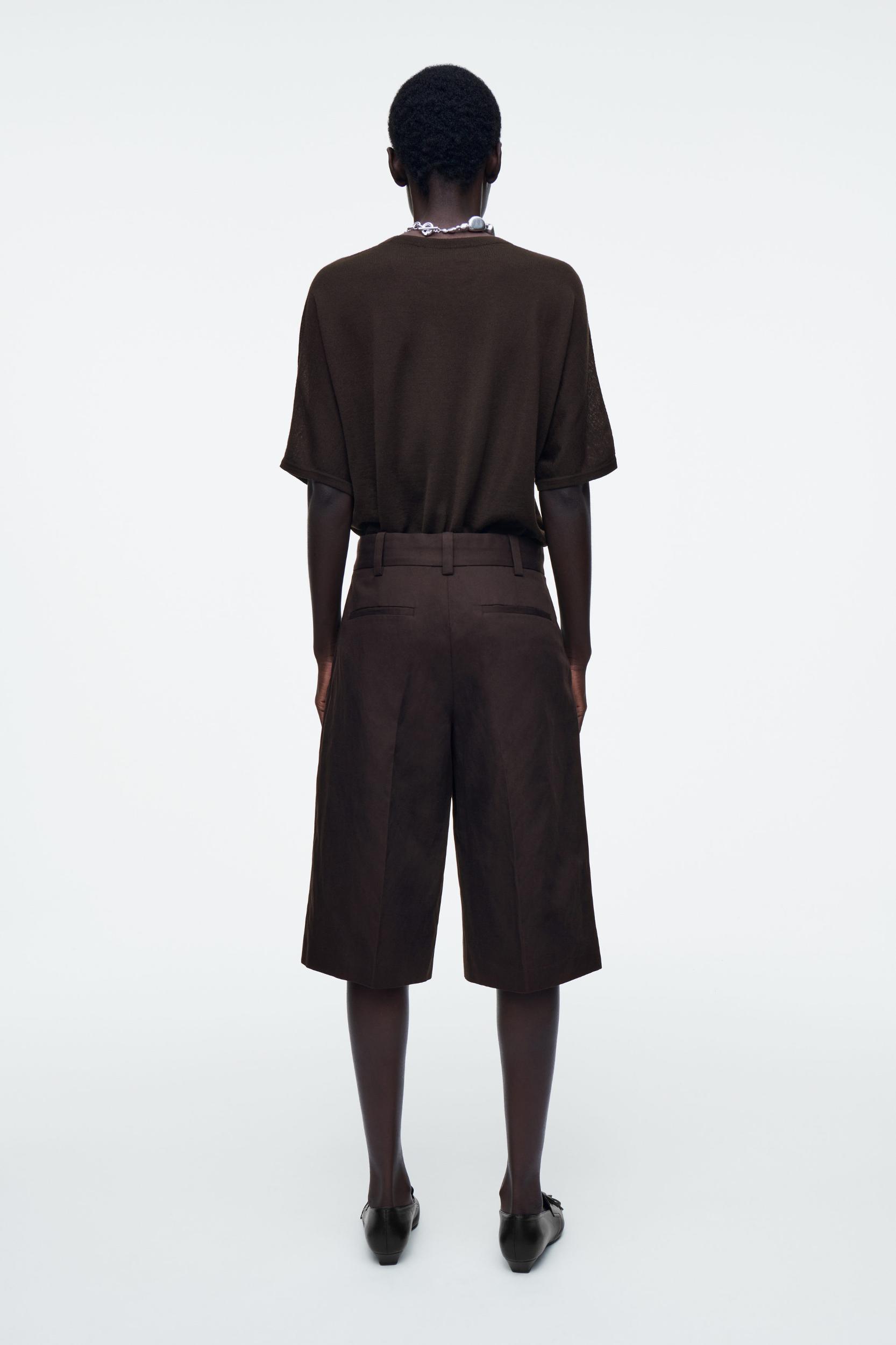 This season, the womenswear team reimagine tailoring codes for balmy weather. These longline shorts are crafted from a lightweight linen blend and designed with wide legs, pressed creases and the signature buttoned tab inside the waistband. Relaxed fitHook-and-bar and zip closureECOVERO™ is a trademark of Lenzing AG. Viscose fibres are derived from certified renewable wood sources using a lower environmental impact process Shell: 61% ECOVERO™ Viscose, 28% Linen, 11% Cotton. Lining: 100% Cotton. Excluding trims / Machine wash Inside leg length of size EU 36 is 38.7cm / Model wears a size EU 36