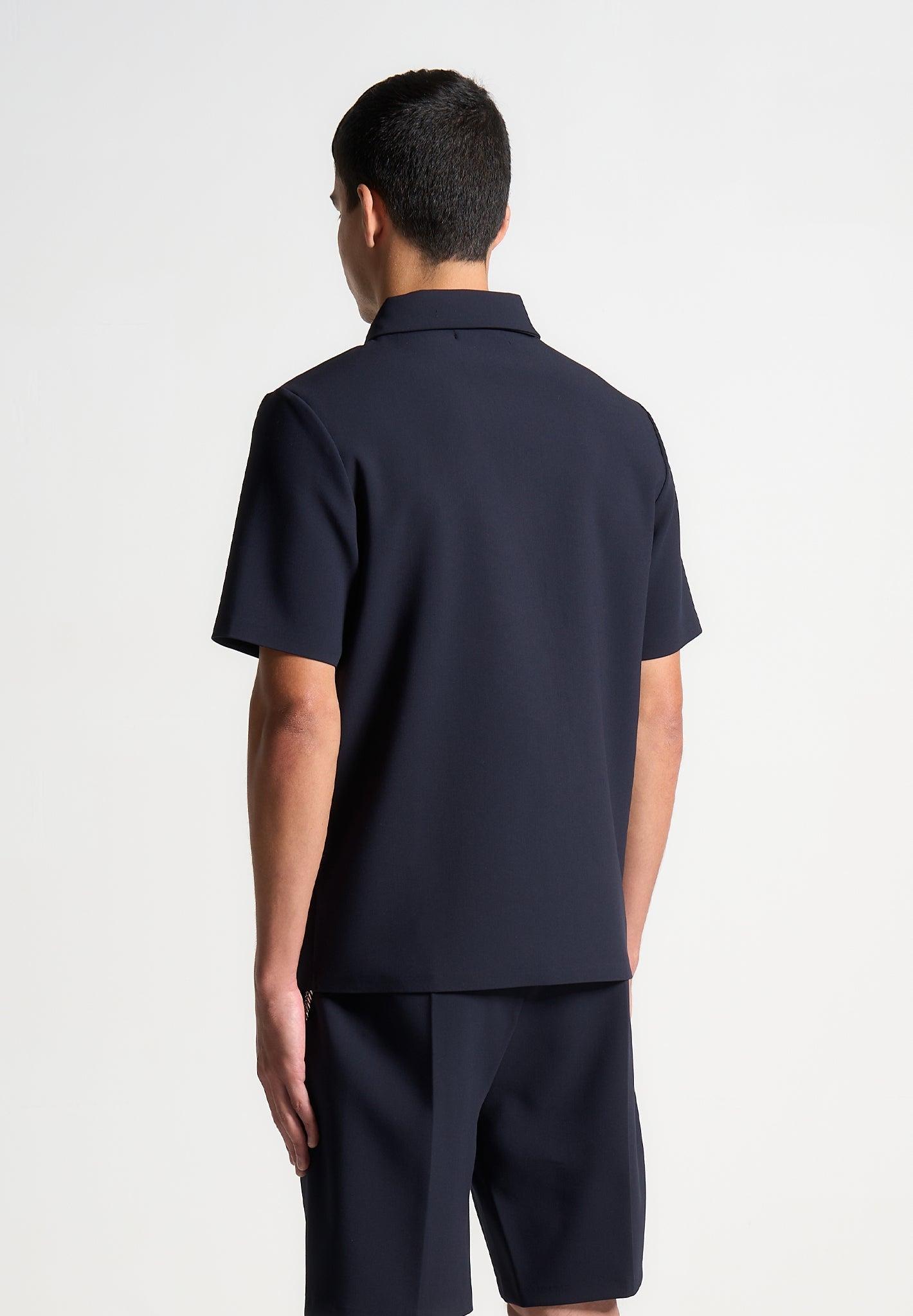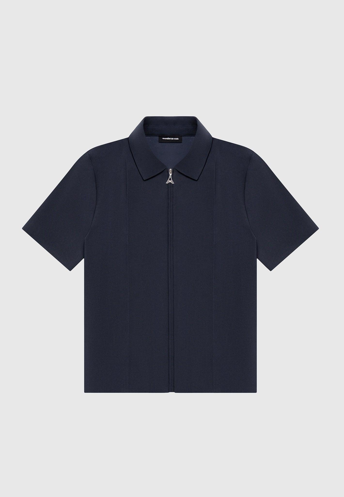 Introducing our Tailored Shirt in Navy, showcasing a discreet central zip and refined collared design for a sleek, polished appearance. Accentuated by the Silver Eiffel zip and subtle pleat detail, it exudes understated sophistication. Designed with a regular fit, this shirt effortlessly combines comfort and style. Fabric: Always check the care label for wash instructions. Model is 6'0", 40" Chest, 30" Waist and Wears Size Medium Based On Size M - Front Length cm/in, Chest cm/in, Sleeve Length cm/in Stretch Factor - /3