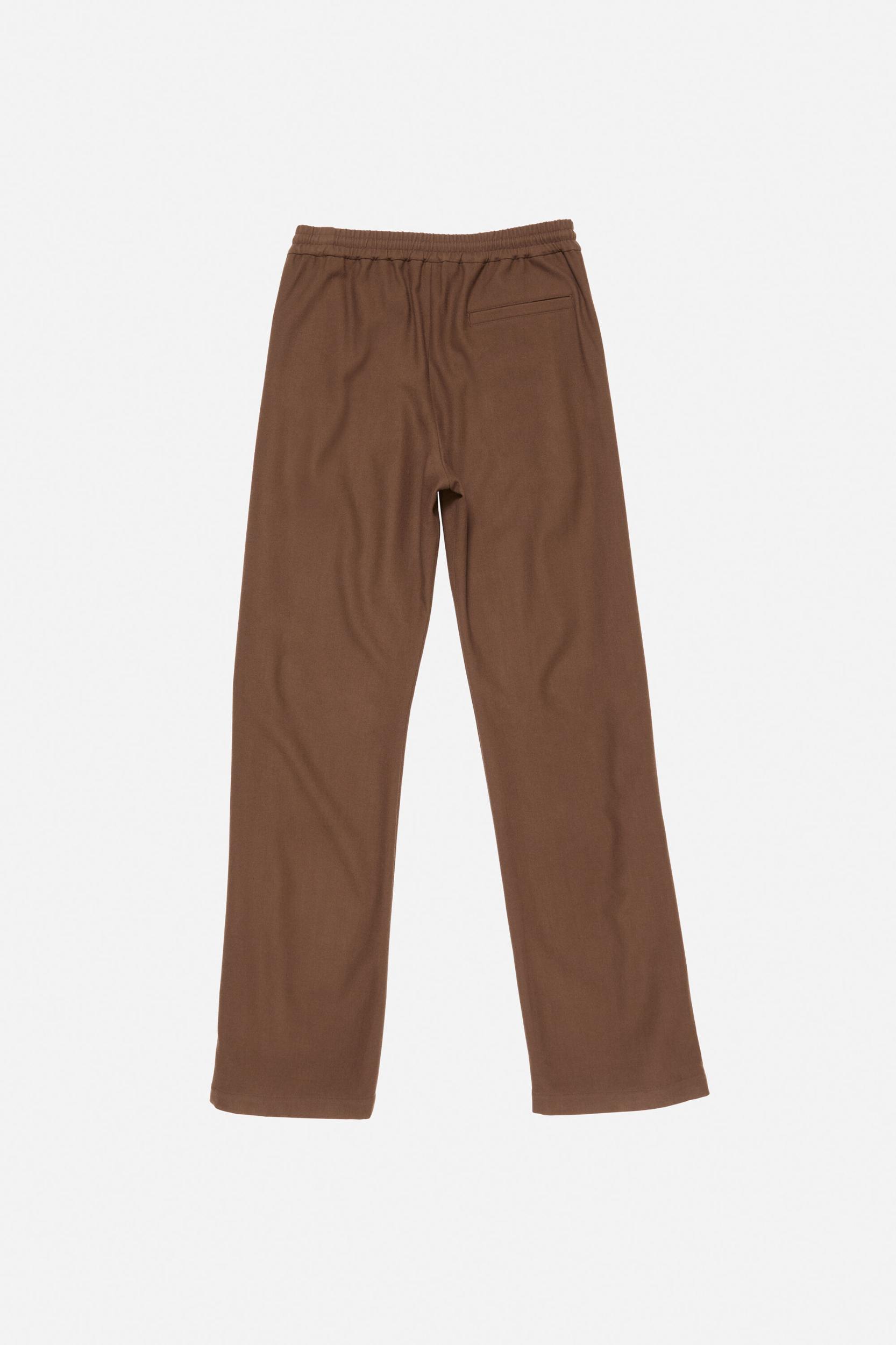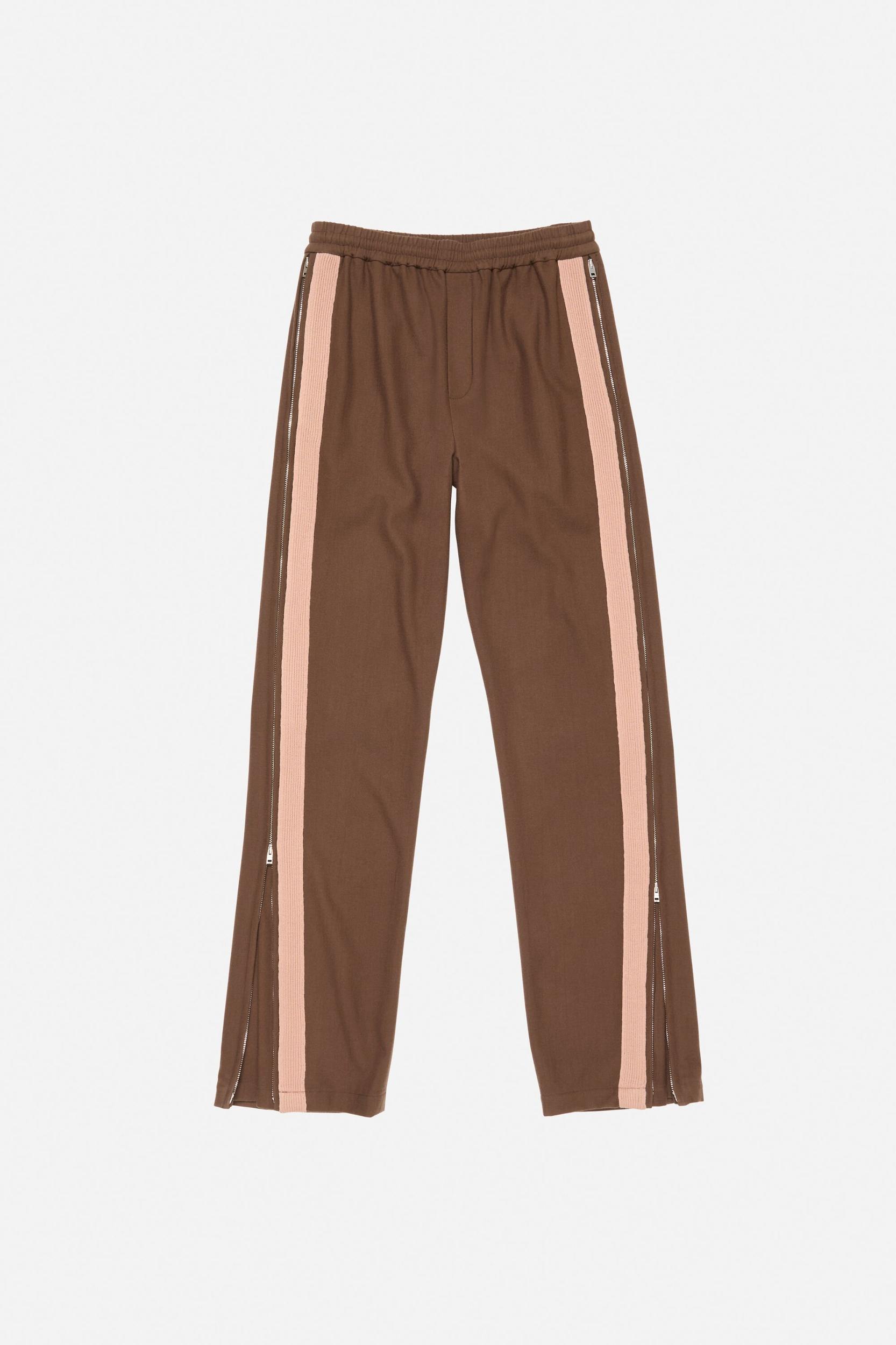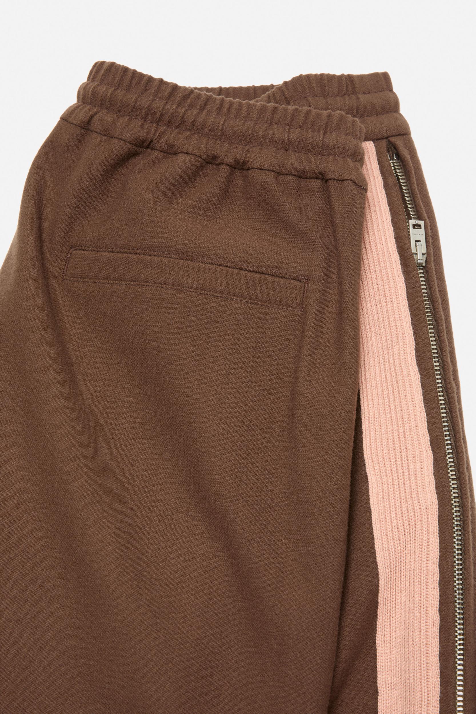 Tailored trousers crafted from classic wool flannel with a soft hand-feel, featuring contrast panels and front zip details that can be unzipped for a wider leg. Complete with an elasticated waistband with internal drawstring, side zip pockets, and a back welt pocket. Cut to a regular fit with a mid waist and a long, straight leg. FN-MN-TROU001112