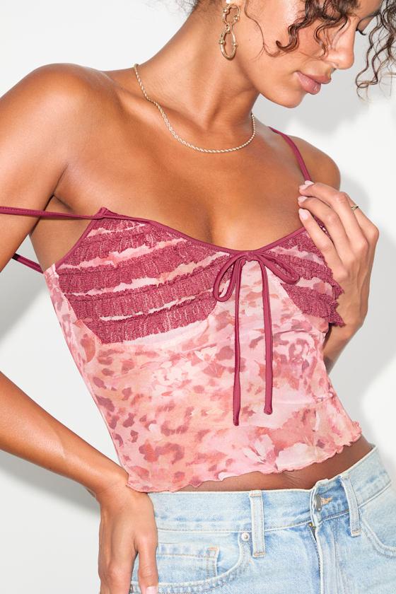 Boasting a modern leopard and floral-inspired print, this mesh knit cami top is more than familiar with hot temps and newfound crushes. Slender adjustable straps support the flattering V-neckline, complete with a center tying detail and seamed, ruffle-adorned cups that lend a fun and flirty effect. Fitted bodice and slightly cropped hem complete the look.