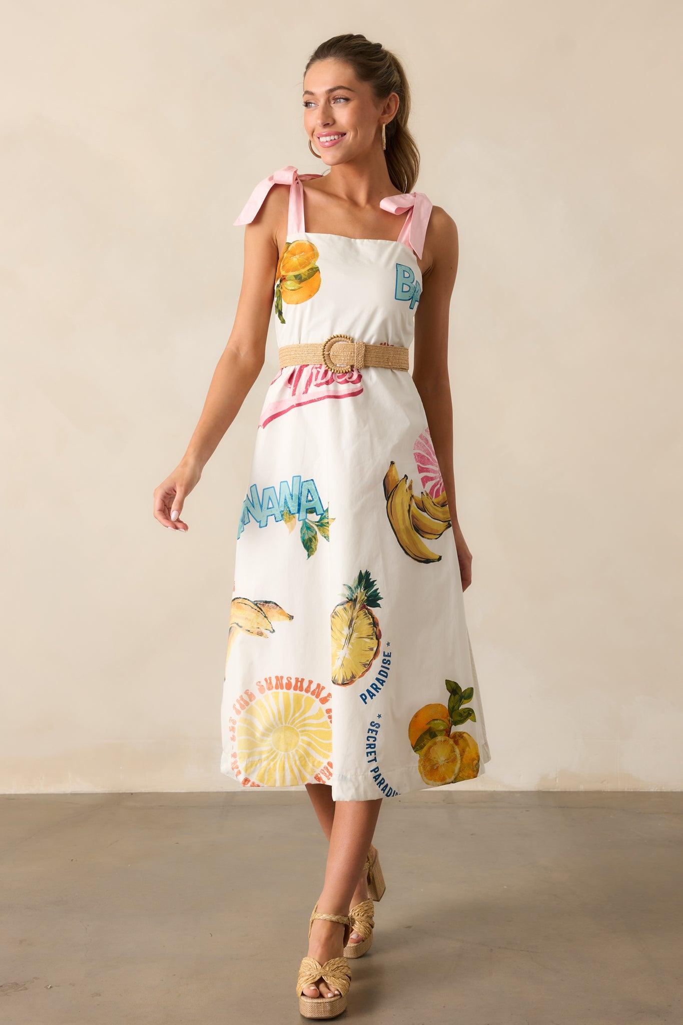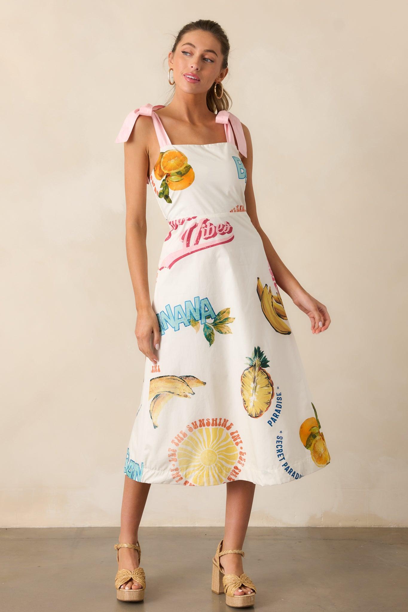 Make a statement in our Take A Chance 100% Cotton Ivory Tropical Fruit Print Midi Dress! Featuring a vibrant tropical fruit print, this midi dress will bring a touch of paradise to your wardrobe. The lightweight fabric makes it perfect for warm weather, while the midi length offers a perfect balance of elegance and comfort. Take a chance on this dress and elevate your summer style! This dress features a square neckline, a beautiful colorful tropical fruit print, smocked back detailing, midi length, and self-tie pink ribbon straps.