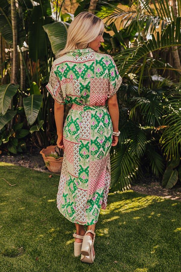 - Be a boardwalk babe with this sweet dress! - Unlined material with patches of blue, purple, pink, and green hued prints - A collared neckline - A button-up front - Short sleeves with rolled cuffs - A waistline with belt loops and an attached tie closure belt - Hidden side pockets - A relaxed silhouette that ends in a straight hemline with side slit accents