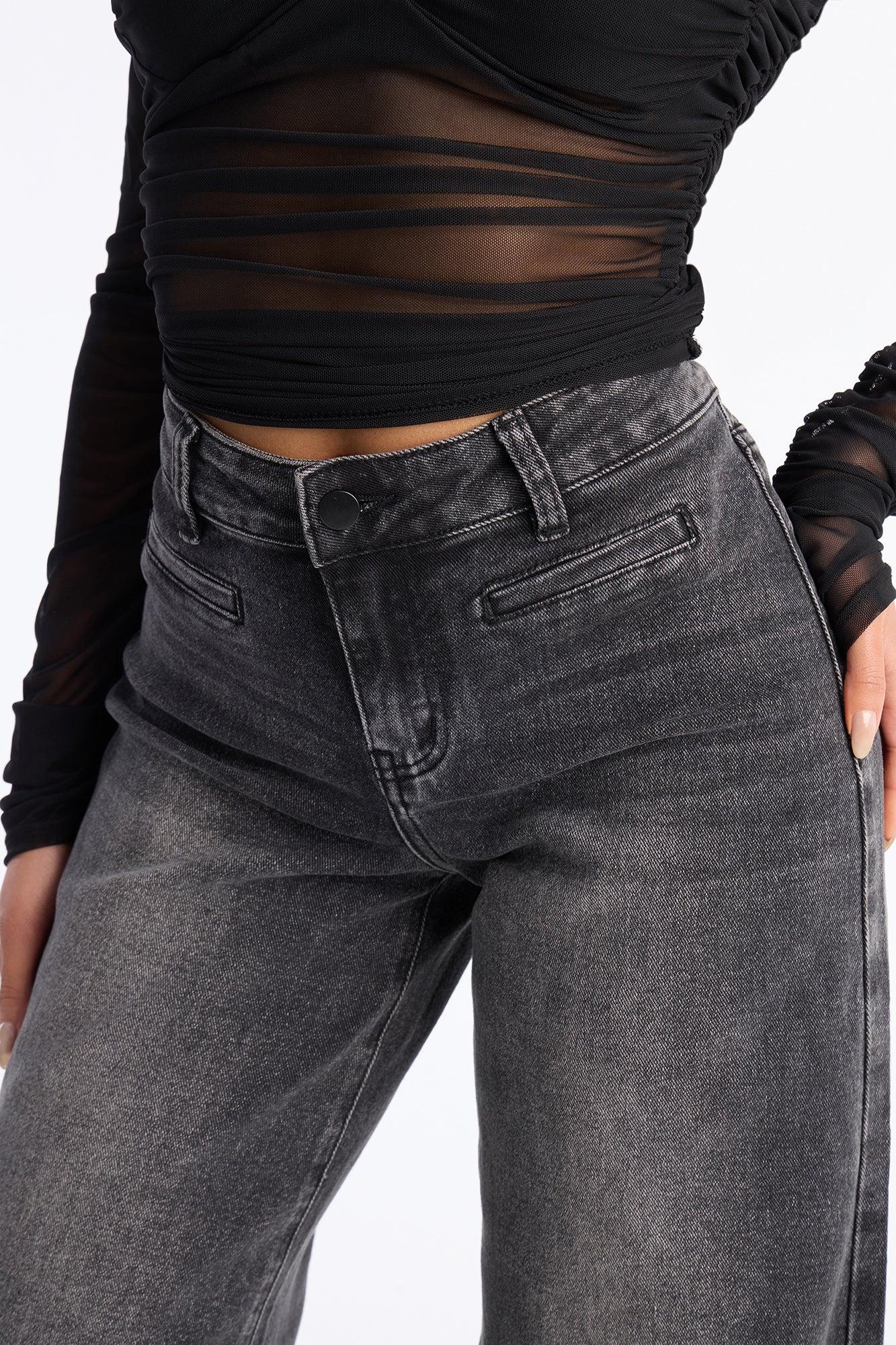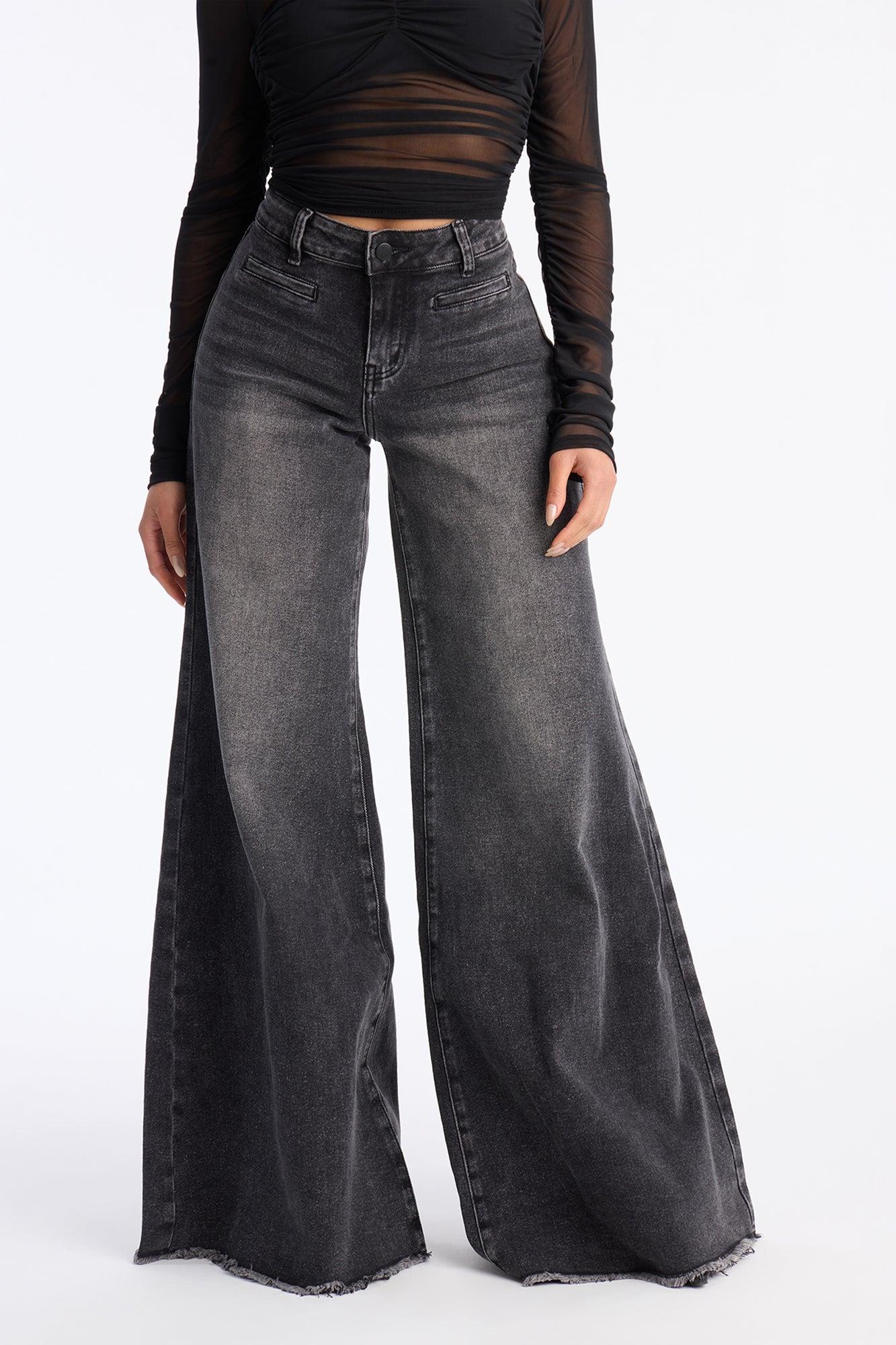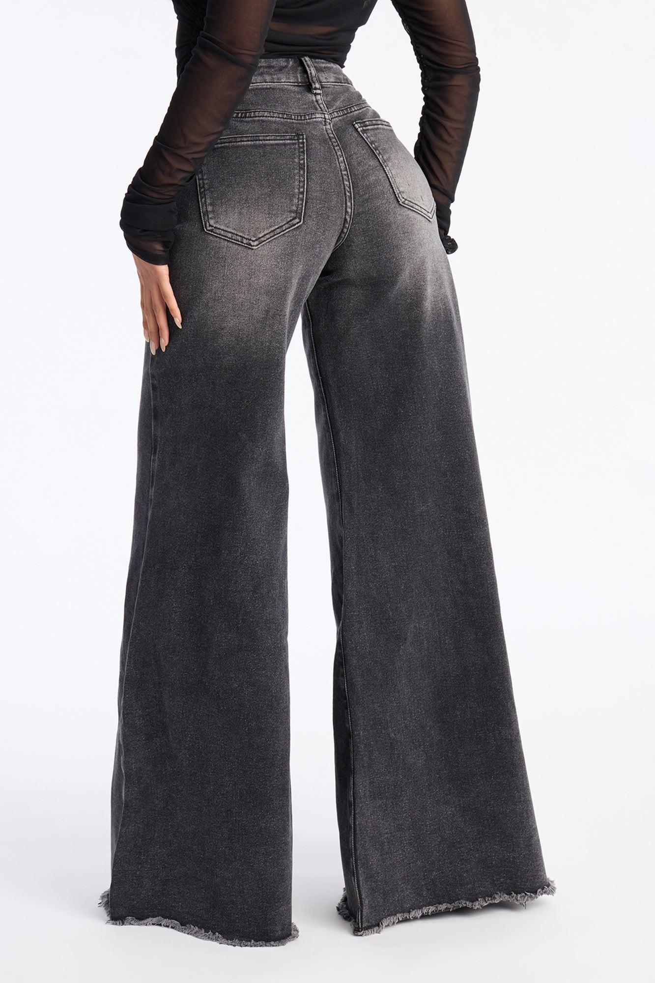 Available In Black Wash. Wide Leg Jean Faux Trouser Pockets Functional Back Pockets Fray Hem 9.5" Rise 35" Inseam Medium Stretch Disclaimer: Due To The Specialized Distressing & Wash Process, Each Garment Is Unique. To Keep The Aesthetic Of This Garment, Please Follow The Care Instructions Carefully. Self: 68% Cotton 30% Polyester 2% Spandex Imported
