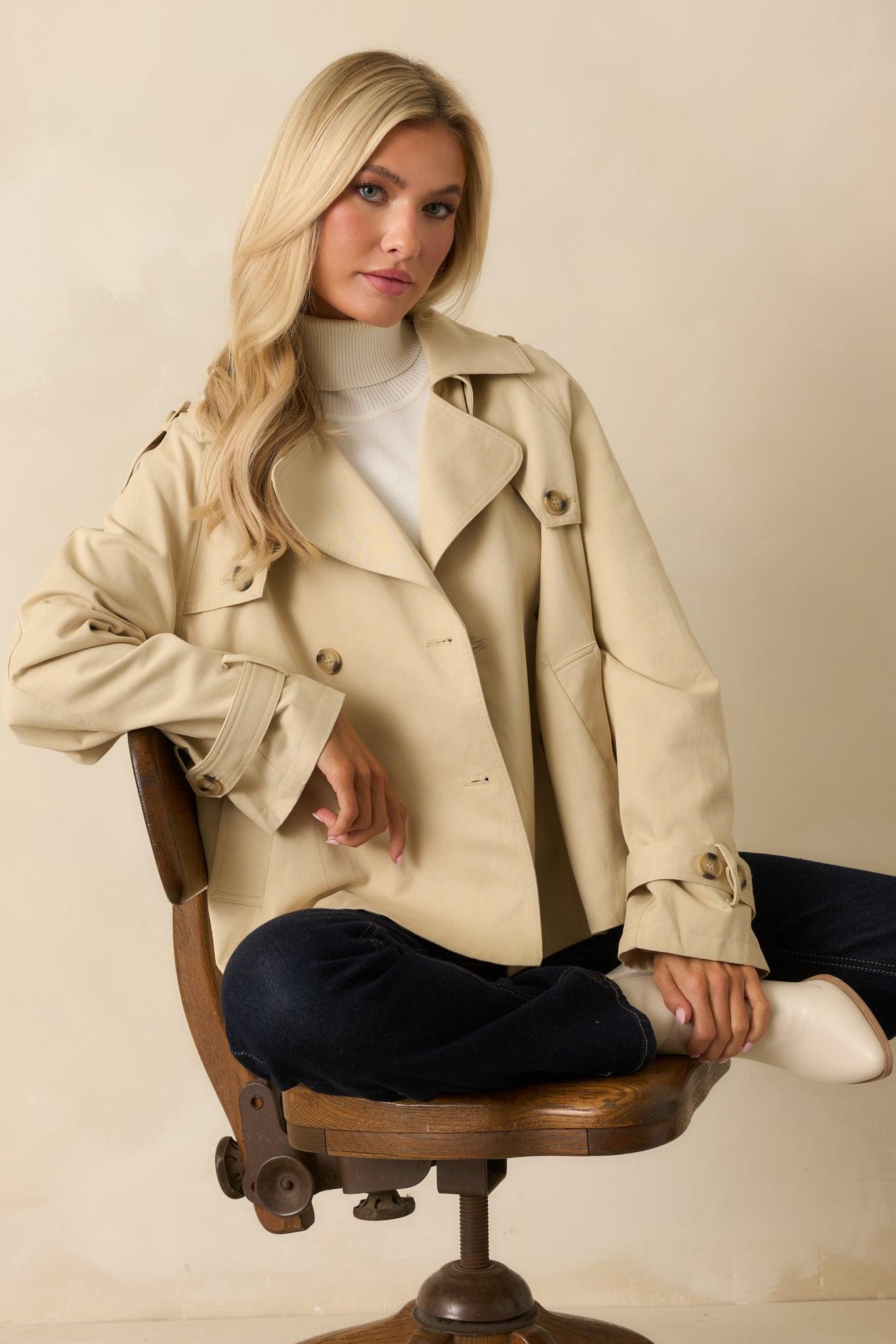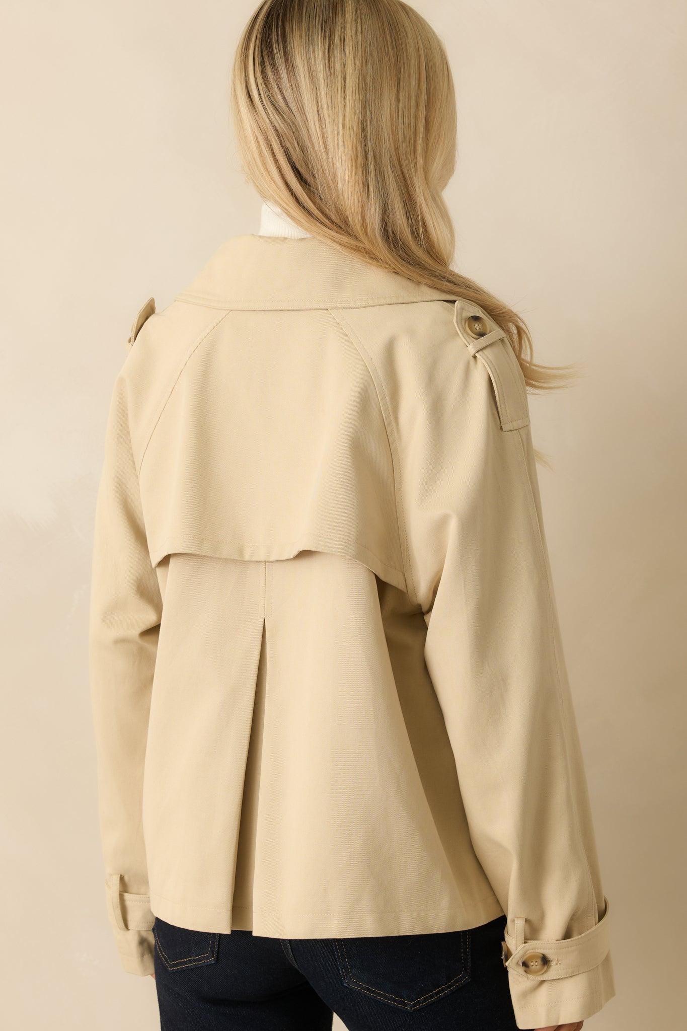 Meet the layer that takes every outfit up a notch. The Take It From the Top Tan Cropped Trench-Style Jacket pairs a classic trench vibe with a modern, cropped silhouette — giving you the polished look you love without any of the fuss. With sleek details, a relaxed shape, and that effortless “I just threw this on” energy, it’s the piece that instantly completes the look… from the top down. This tan cropped trench-style jacket features a double-breasted button front, notched collar, long sleeves with button-tab cuffs, and shoulder epaulets. Designed with functional side pockets and a back storm flap with box pleat, it offers a relaxed fit and hip-length silhouette. 55% Tencel & 45% Cotton Lining: 100% Polyester Hand Wash Cold Manufactured in China Designed in the USA Model is 5'8" and wearing size small