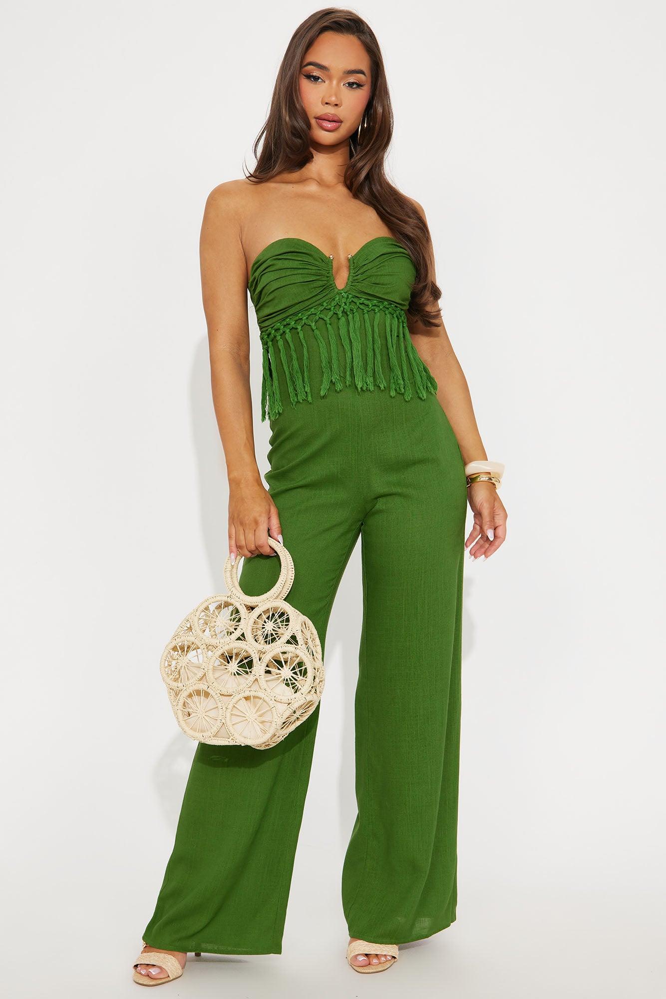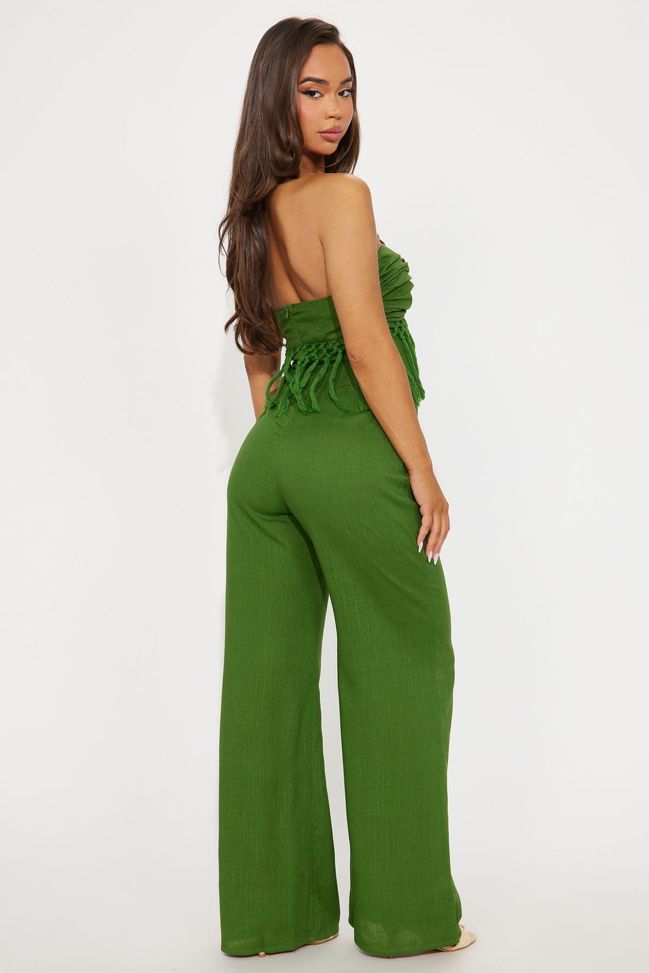 Available In Green And Oatmeal. Linen Jumpsuit Strapless Sweetheart Neckline Hardware Ruched Fringe Trim Hidden Back Zipper Wide Leg Non Stretch Inseam= 34" Self : 100% Polyester Lining : 100% Polyester Imported California Proposition 65WARNING: Cancer and Reproductive Harm - www.P65Warnings.ca.gov.