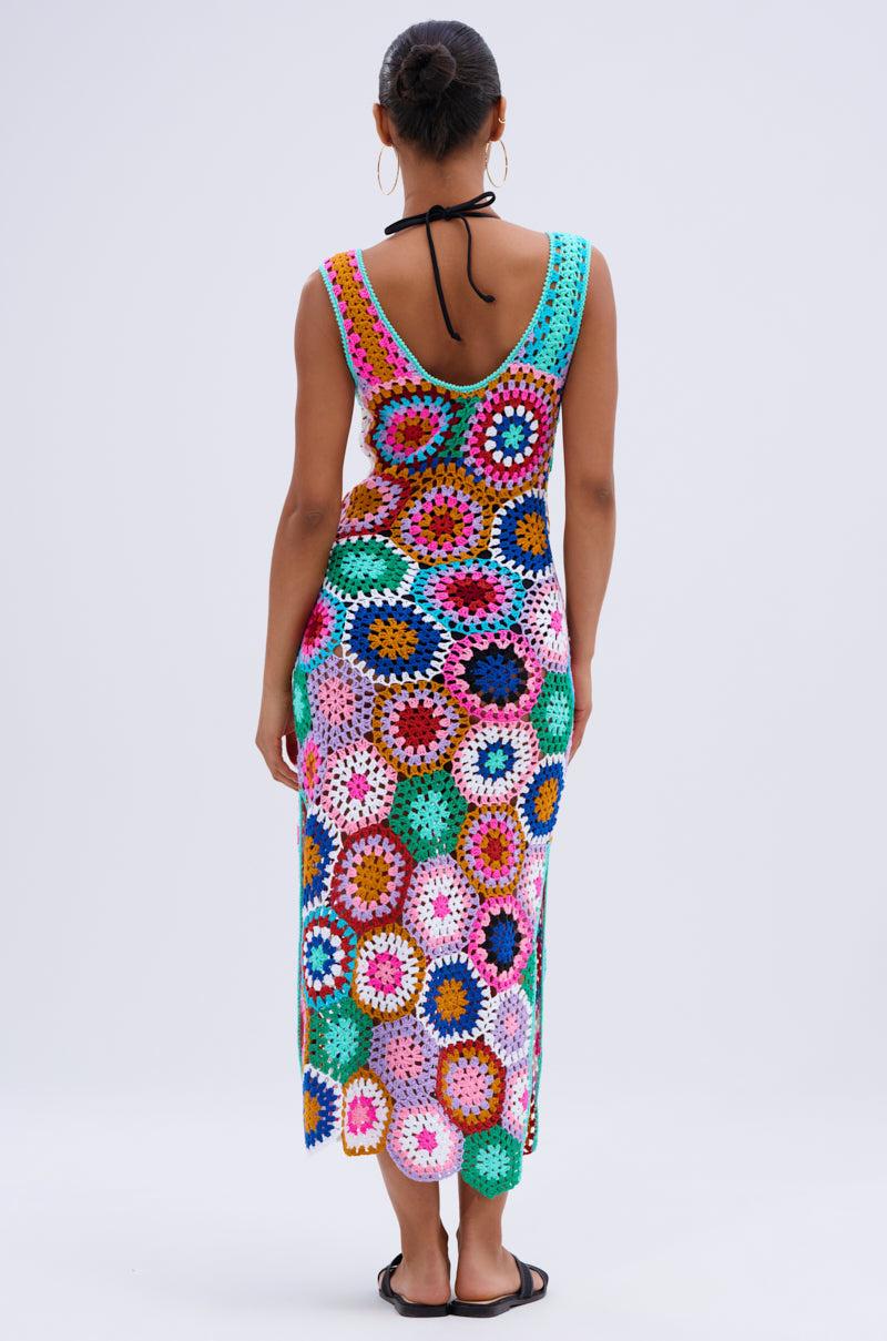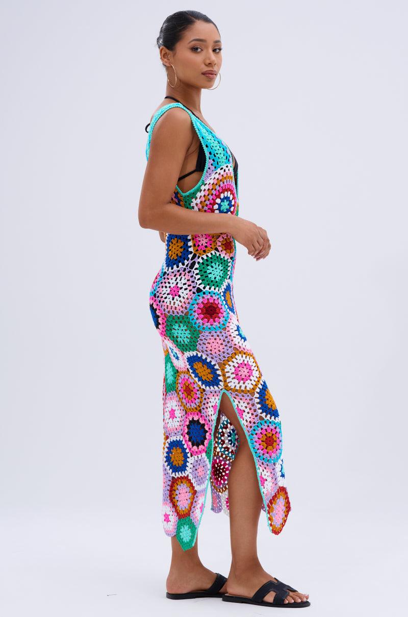 The AKIRA Label Take Me To The Beach Crochet Midi Dress was made for tan lines and ocean breeze. Crafted from an unlined crochet knit base with a colorful, patchwork design, this summery throw-on features a plunging V-neckline, thick tank straps, and sultry slits on each side of the bottom hem. Complete with a midi length and an effortless, slip-on fit. Pair with a bikini and platform sandals for your next coastal getaway. - Shell: 100% Acrylic- Slight Stretch- Imported (all measurements approximate from size small)- 54” Shoulder to Hem- 21” Strap Length- Model is 5’8” and is wearing size smallProduct ID: 1038917 (all measurements approximate from size 1X)- 58” Shoulder to Hem- 25” Strap LengthProduct ID: 1038921