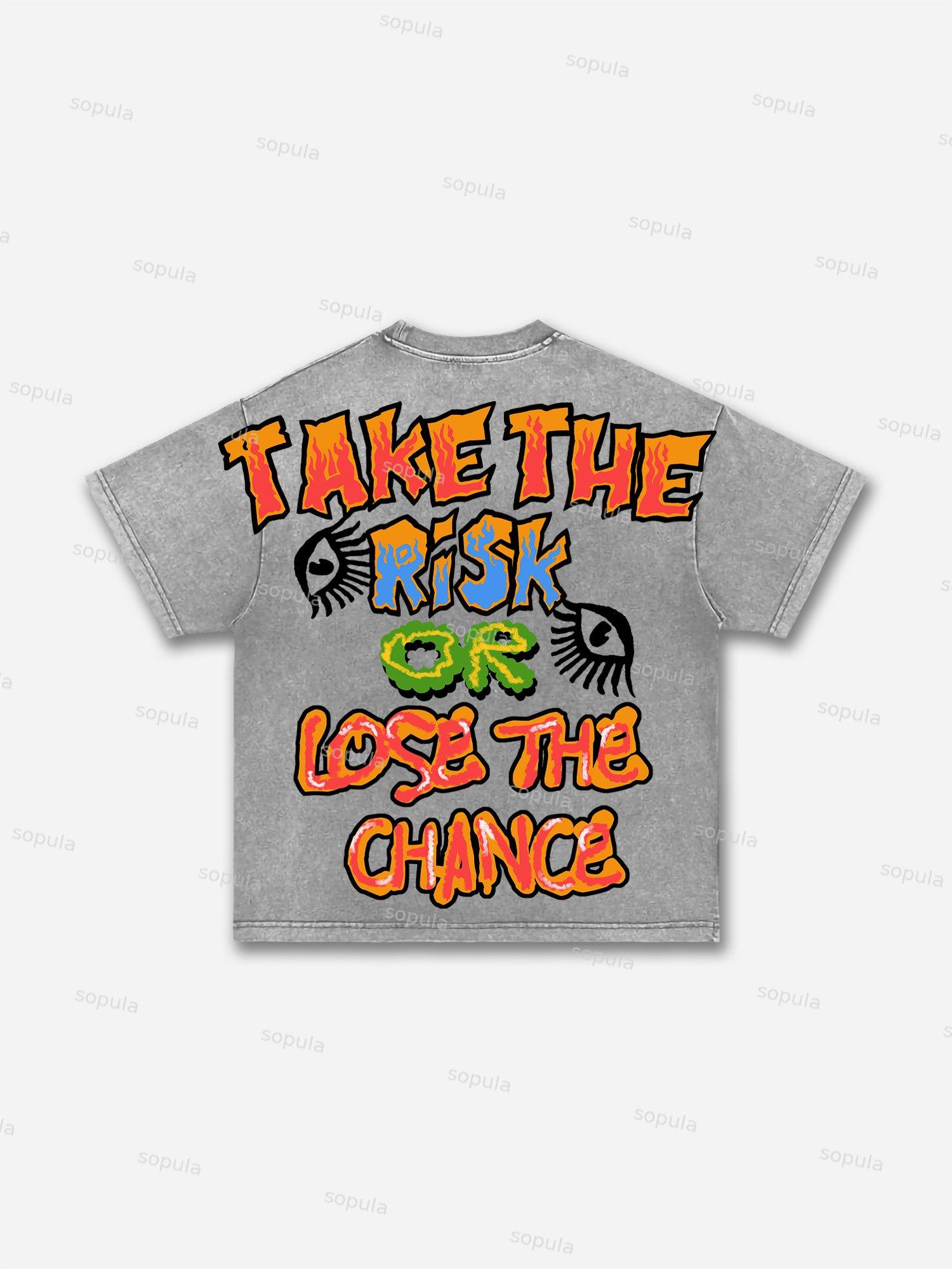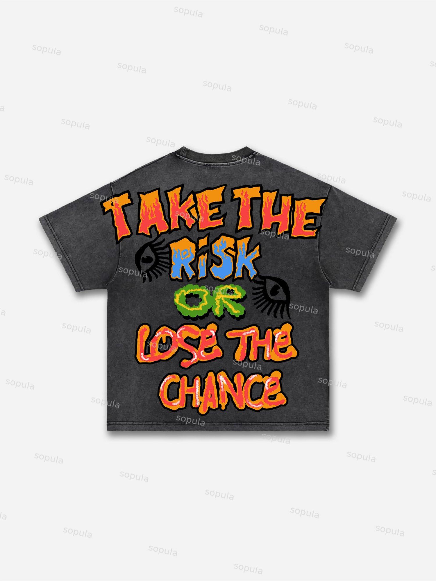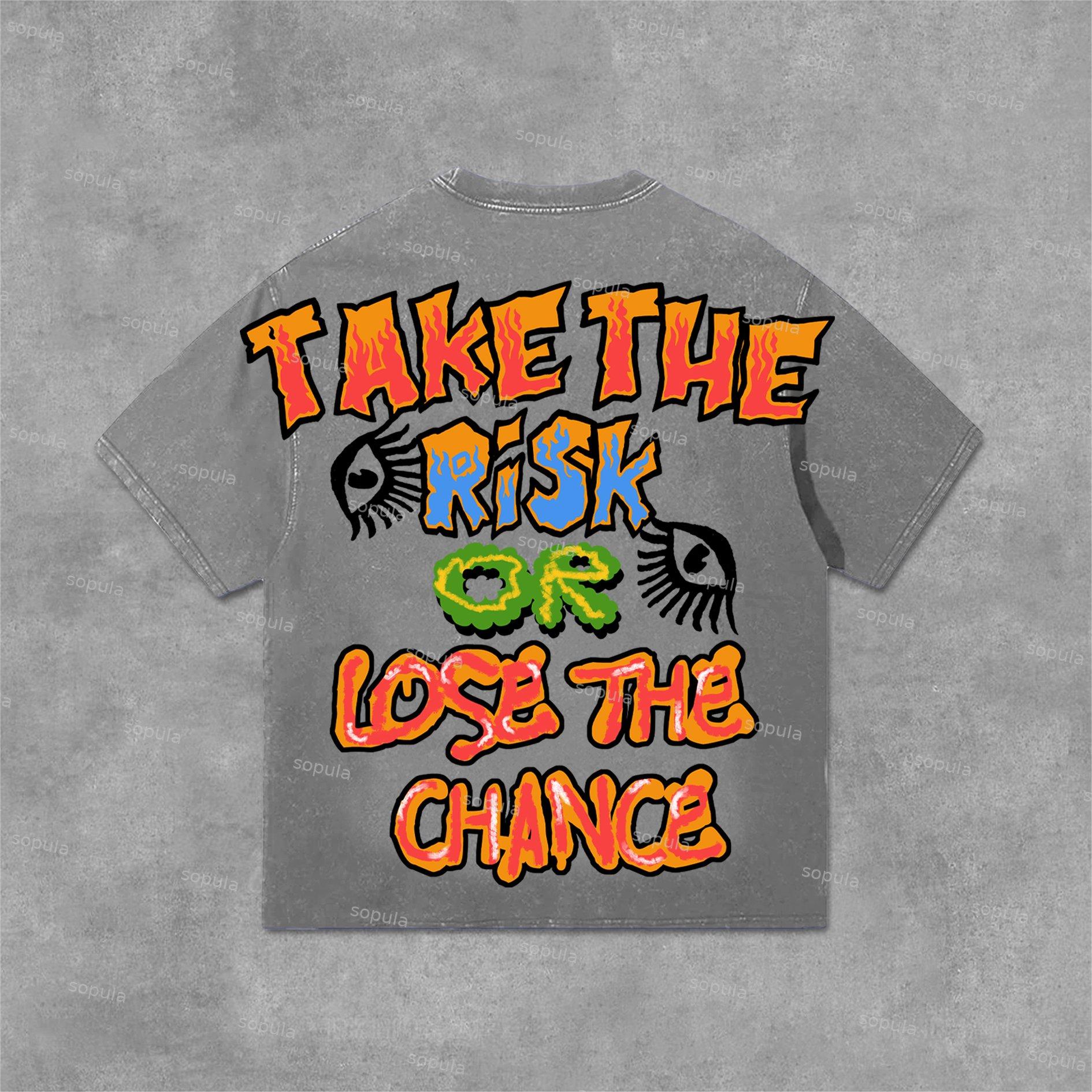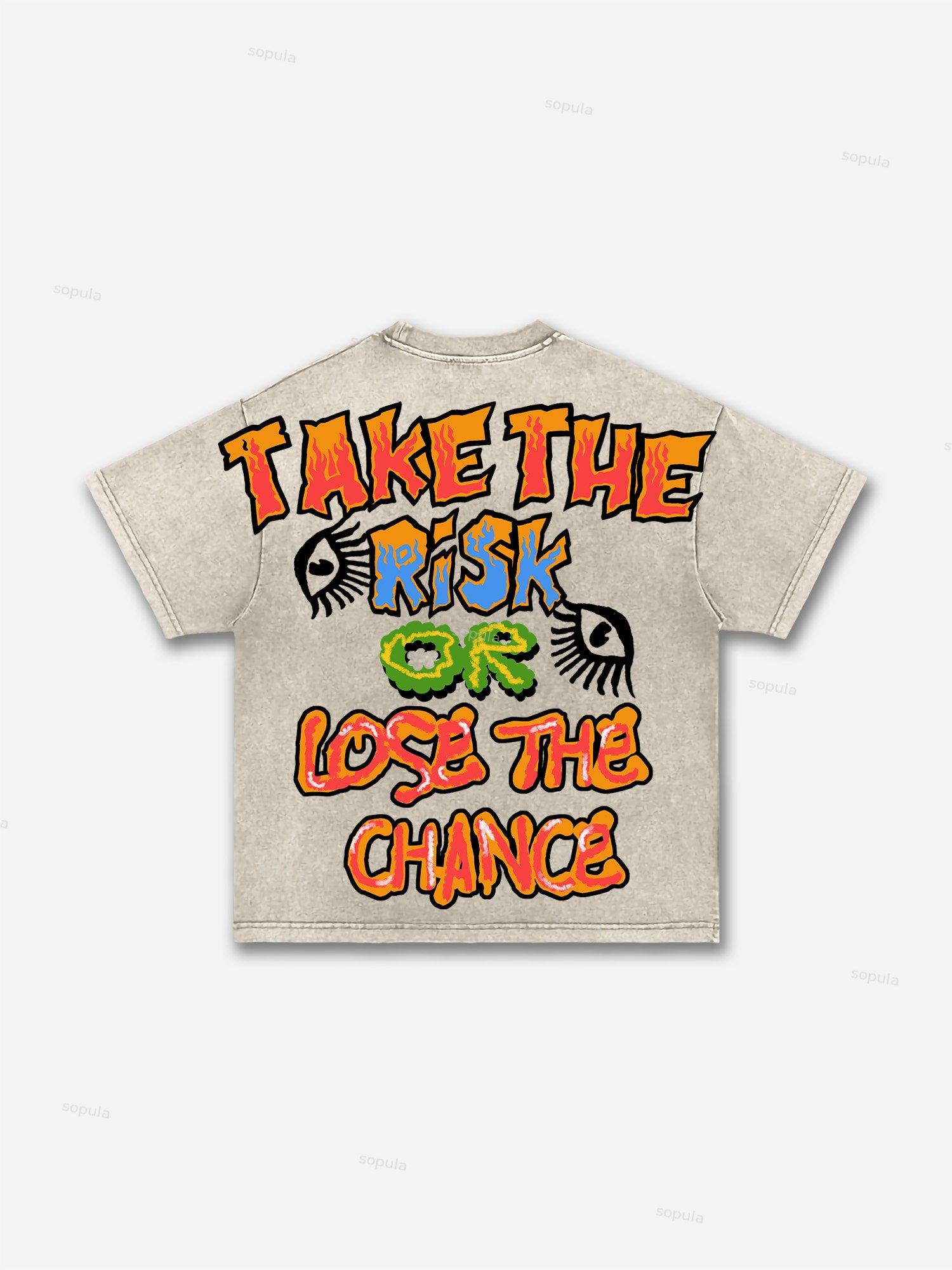 Take The Risk Or Lose The Chance Graphic Print Acid Washed T-Shirt. SPU: CP-154076-ZYL Fabric Name: 100% Cotton Wax-Dyed Fabric Pattern: "Take The Risk" Or "Lose The Chance" Graphic Process: Printed Style: Retro Length: Regular Collar: Round Neck Popular Elements: Acid Washed Sleeve Type: Short Sleeve Occasion: Daily, Street Theme: Summer