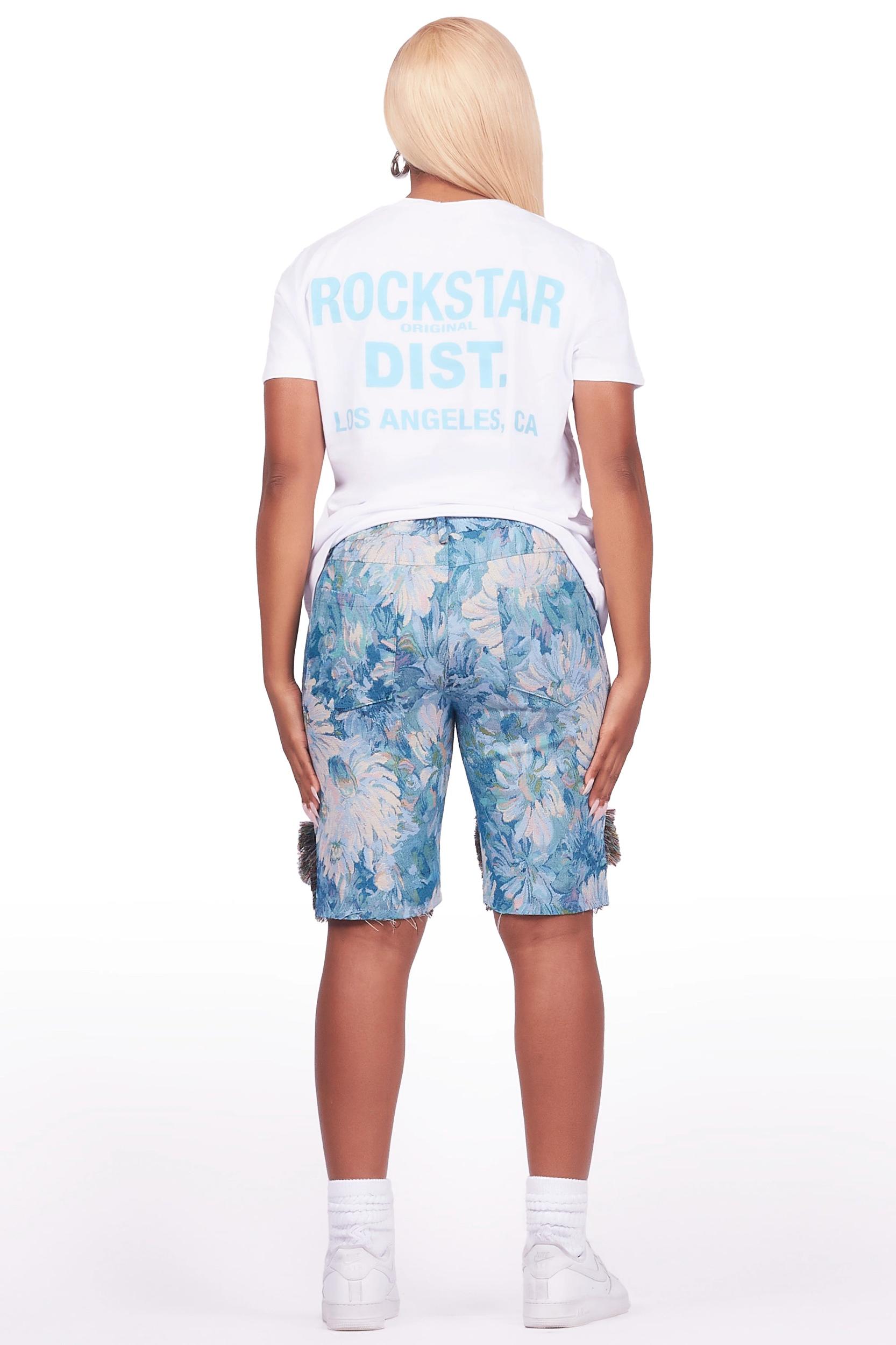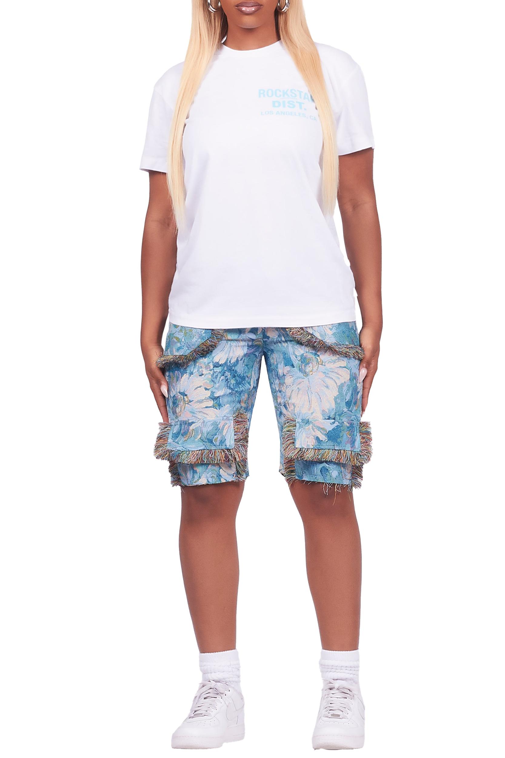 An urban two-piece tee and denim tapestry cargo short set for women. Designed with organic cotton and custom detailing for an essential everyday set. Crew neckline Short sleeves Pullover style Relaxed-fit Printed RSO graphics Zip fly with button closure Mid-rise waist line 6-pocket build Custom woven tapestry designing Deconstructed hem Figure-framing silhouette Barrel-leg trousers