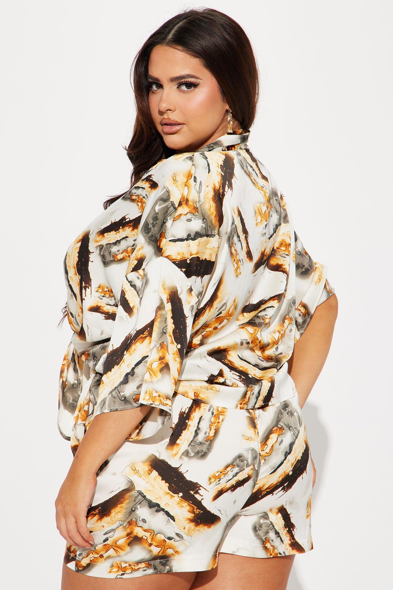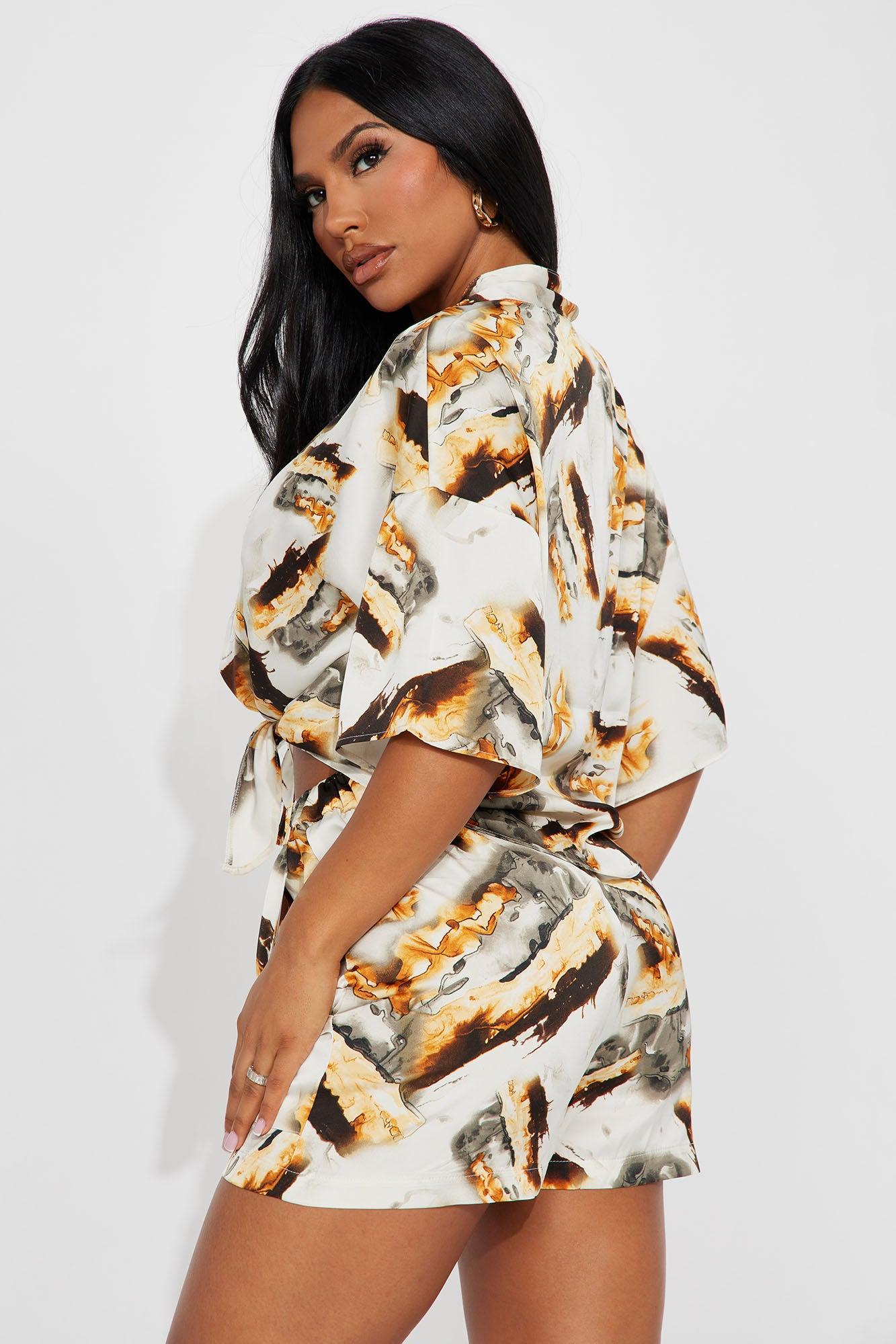 Available In Cream/combo. Short Set Short Sleeve Top Front Tie Short Front Adjustable Drawstring Pockets Partial Stretch Disclaimer: Print Placement May Vary Shell: 97% Polyester 3% Spandex Imported