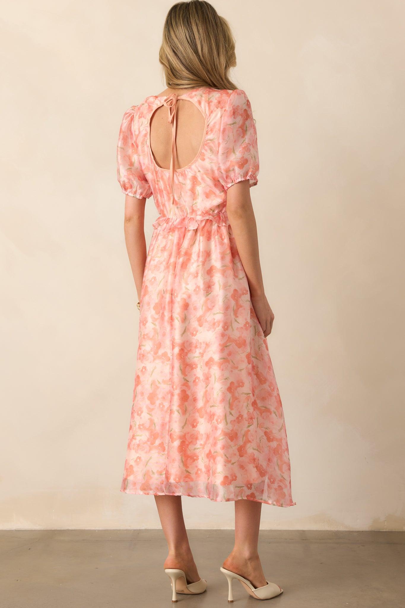 The Tale As Old As Time Light Orange Floral Midi Dress is a romantic choice for embracing timeless elegance. It's perfect for those moments when you want to feel classic and charming, with a sense of enchantment that makes every day feel like a fairytale. This midi dress features a light orange floral print, short puff sleeves, elastic cuffs, round neckline, self-tie bow back, ruffle waist, and a hidden side zipper.