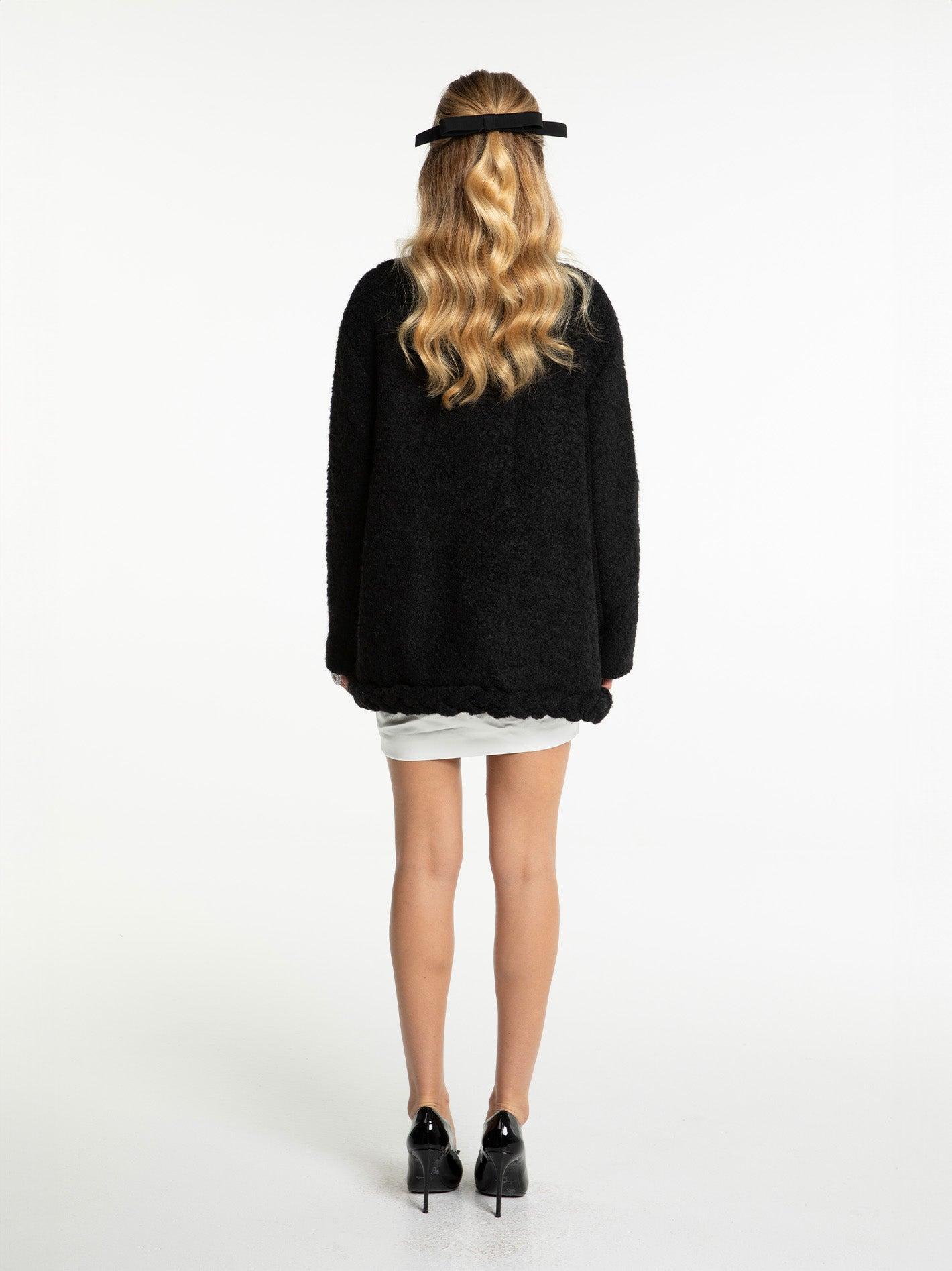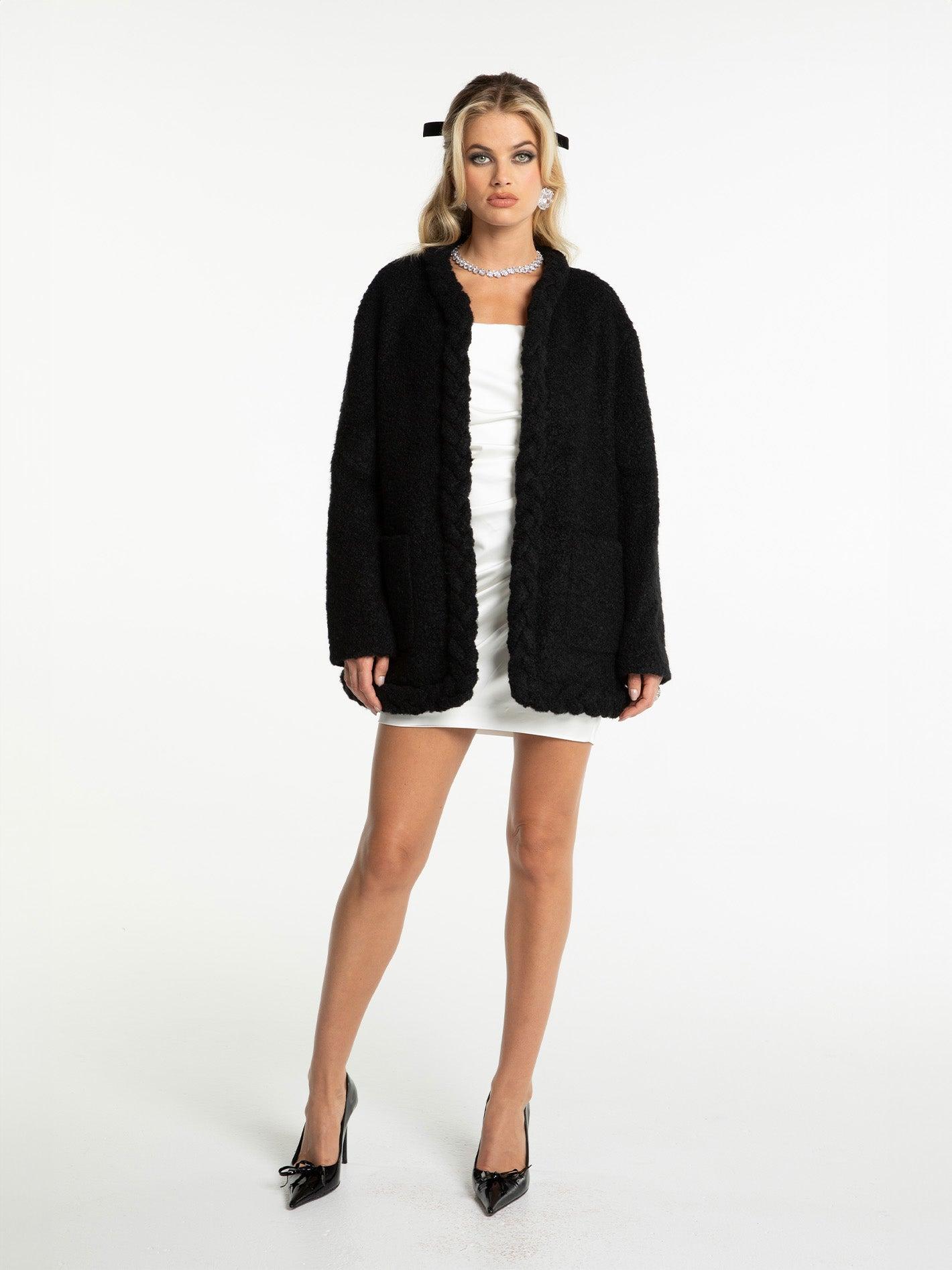 The Talia coat combines comfort with chic detailing, crafted from soft terry fabric for a cozy yet stylish look. Its handmade braid decoration along the placket adds a touch of femininity and dimension, while the custom check-hook design ensures easy wearability. With a loose, off-shoulder silhouette, this short coat effortlessly complements a range of outfits. Available in black, white, and pink, it strikes the perfect balance between fashion-forward and comfortable. Soft terry fabric for a luxurious feel Handmade braid decoration for added texture and femininity Custom check-hook design for easy on and off Loose off-shoulder silhouette for versatile styling Available in black, white, and pink for multiple styling options Dry clean only