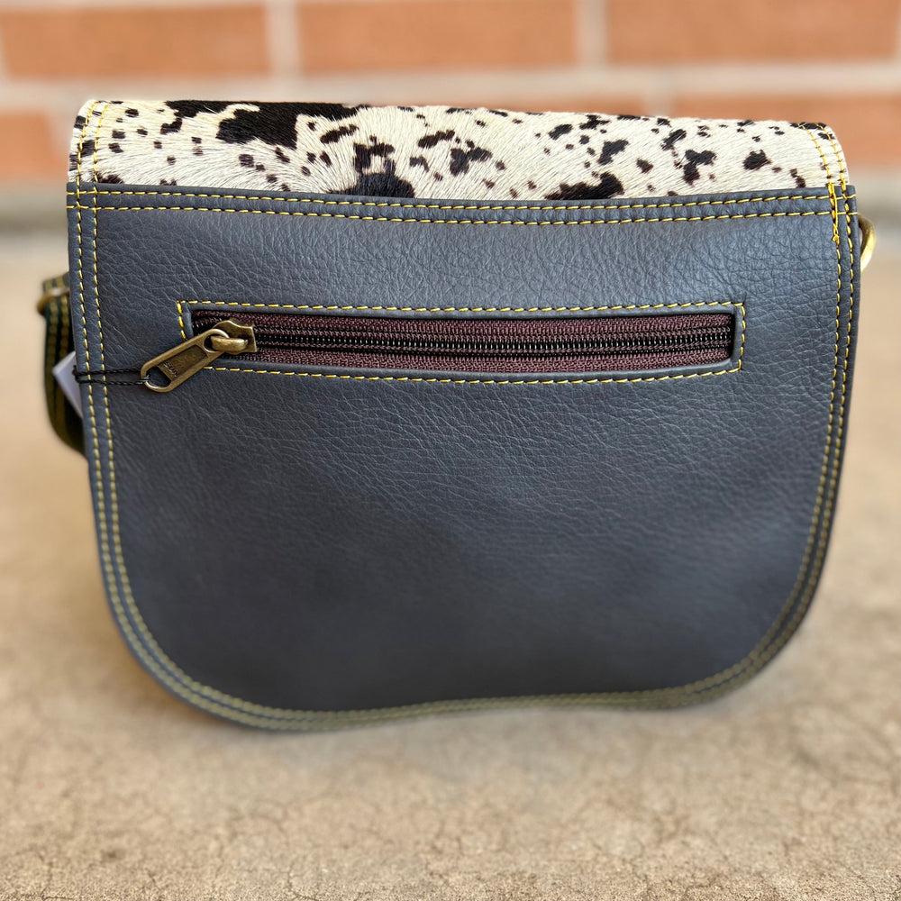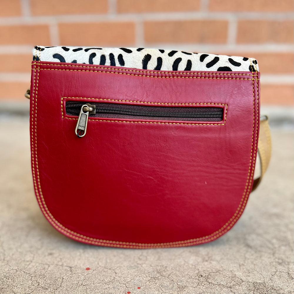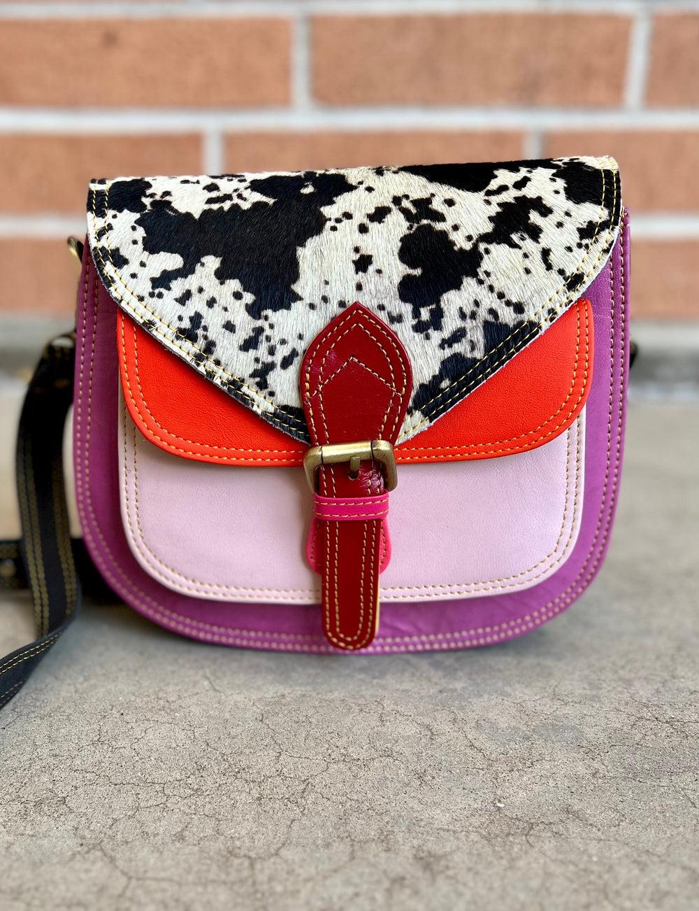 Let your style shine with our Talia Crossbody Bag! Featuring an eye-catching explosion of colors and textures with 36" adjustable/removable strap, multi color leather strip detail, hair on hid fold over flap and so absolutely colorful. You'll be the envy of everyone you encounter with this showstopper accessory! 1 inside compartments with an inside back zipper pocket, and a snap front pocket to hold all your essentials! 8.5" W X 7" H in size.