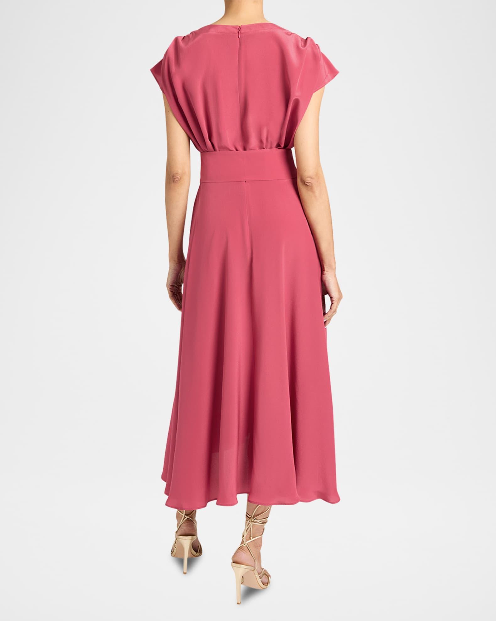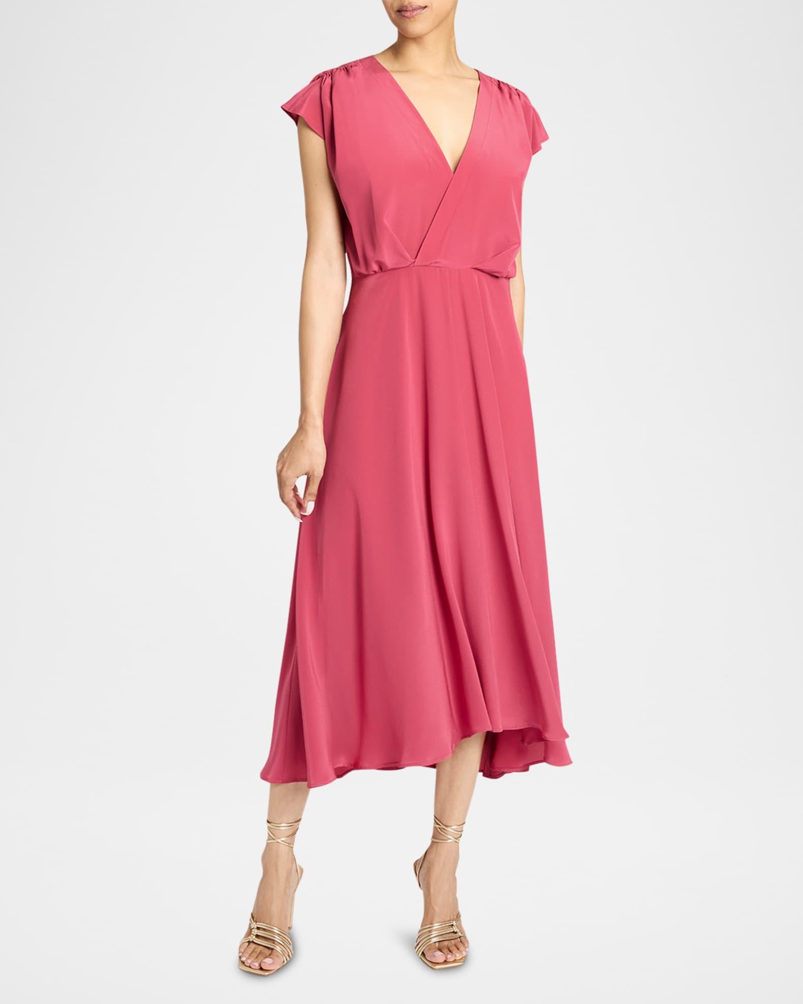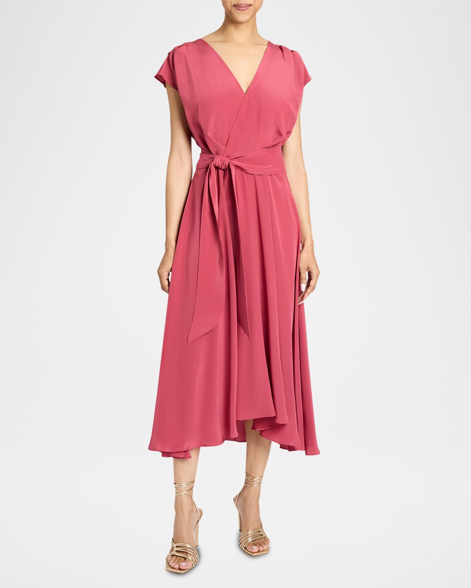 Santorelli "Talia" faux-wrap midi dress crafted in fluid silk crepe de chine Approx. 48"L from shoulders to hem Surplice neckline Ruched shoulders Short sleeves; approx. 3"L Waist self-tie Hem falls below the knee A-line silhouette Invisible back zipper Silk Unlined Dry clean Made in Italy