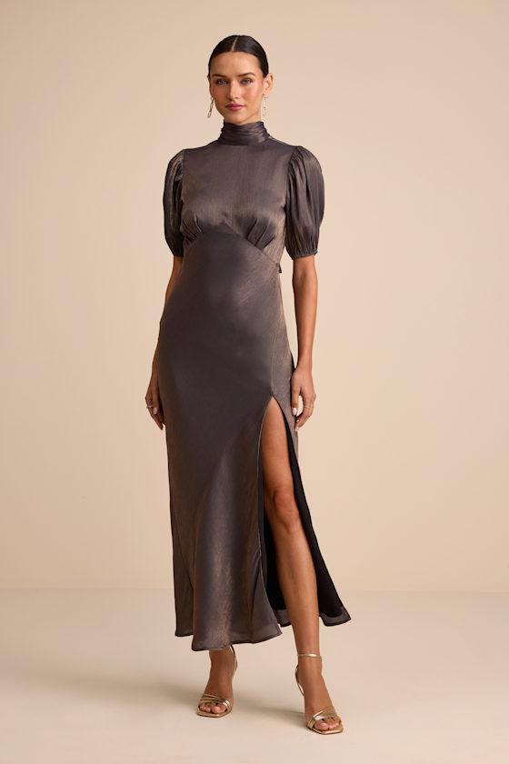 Make a sophisticated entrance that demands attention, all thanks to the alluring details of this textured satin maxi dress. Luminous gold Lurex threading lends effortless shine to the figure-skimming silhouette, which falls from a chic mock neckline that's framed by elbow-length puff sleeves. The lightly pleated bodice features an inverted V-waist that flows into a slip skirt with a strut-ready side slit, while a draping sash bow detail ties at the back atop a flirty cutout for a memorable finish. Hidden back zipper/clasp.