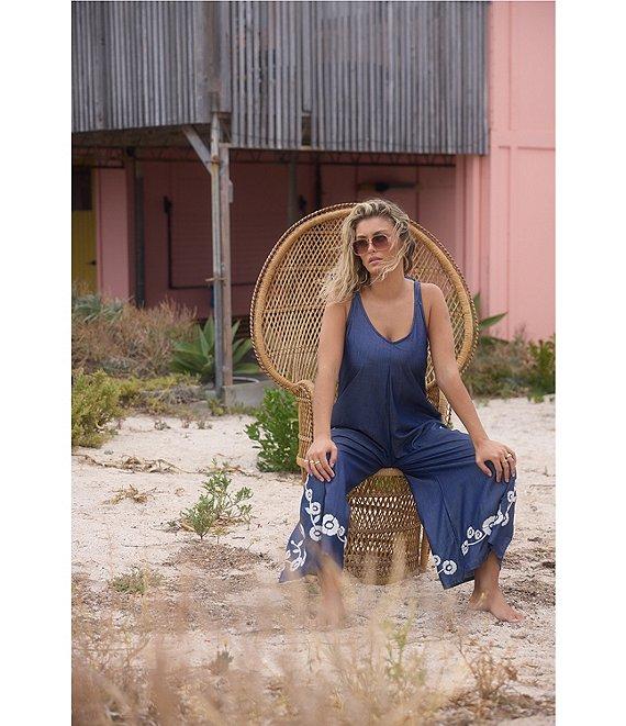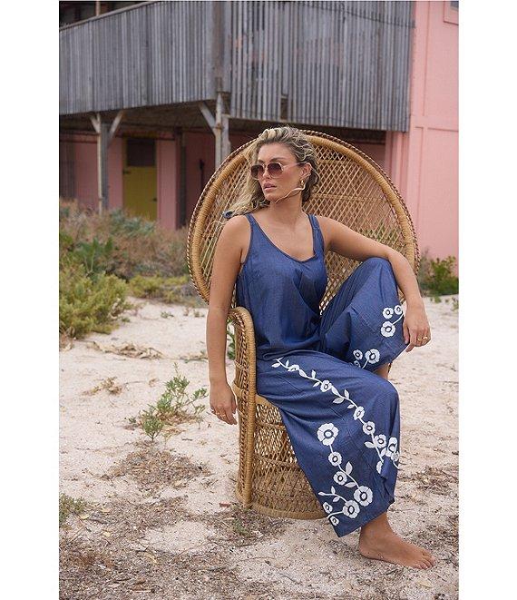 From Talisman, this jumpsuit features: V-neckline Sleeves with tie straps Floral embroidery Side seam pockets Wide leg silhouette Pullover construction Approx. 40" length Viscose Hand wash Imported.