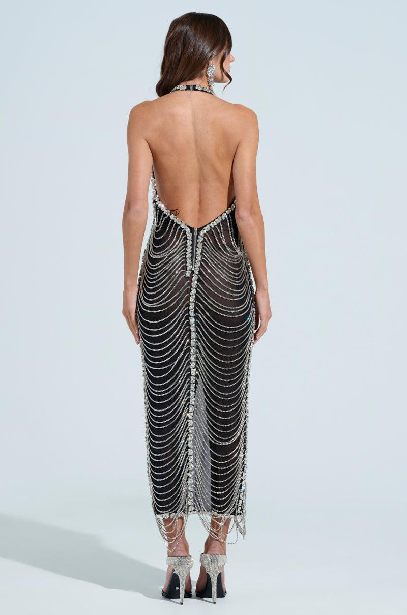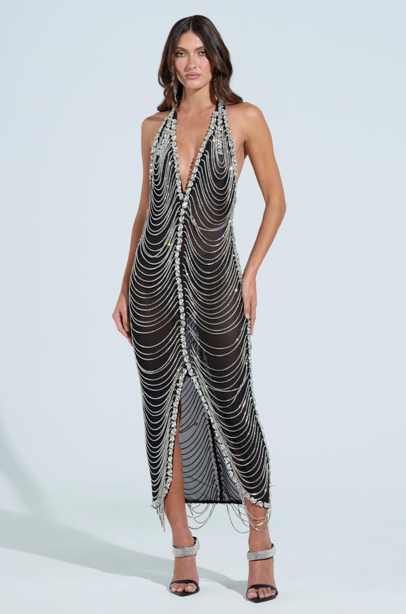 You’re obviously the main character — what else is there to discuss? The AKIRA Label Talk It Over Maxi Dress is a glamorous, floor-grazing gown crafted from a sexy, semi-sheer mesh fabrication. This scintillating stunner boasts a curve-skimming silhouette, a plunging V-neckline, sturdy halter straps with a metal clasp closure, an open upper back, a modest, mid-calf front slit, and a metallic zip back closure. Clusters of jaw-dropping silver jewels adorn the trim throughout, and innumerable, elegantly draped rhinestone links ornament the bodice for a resplendent finish. Style with sleek black stilettos, a coordinating clutch, and dangling earrings to shine like the super star you are. Please note that due to the delicate nature of the rhinestone detailing, there may be some imperfections. FRAGILE, HANDLE WITH CARE. - 92% Polyester, 8% Spandex- Dry Clean Only- Stretchy- Imported (all measurements approximate from size small)- 51” Shoulder to Hem- 15” Slit - Model is 5’9” and wearing a size smallProduct ID: 469593