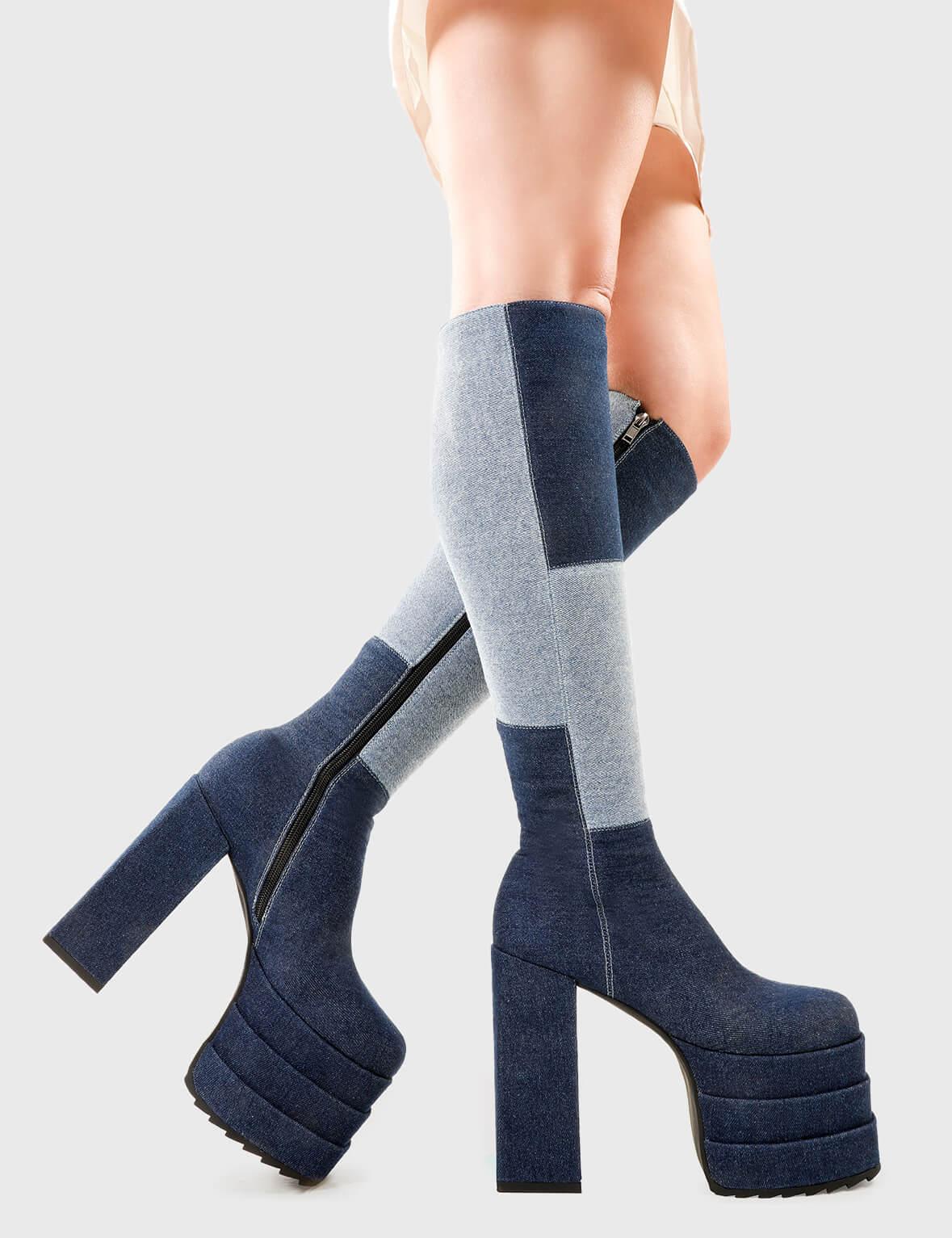 Denim DollsTalk Of The Town Wide Calf Platform Knee High Boots in Denim. These platform boots feature our iconic Denim finish on a double stack platform sole, take center stage with these jaw dropping boots. Made with eco-friendly materials and 100% cruelty-free, these platform boots are as ethical as they are Jaw dropping.- Platform Height- Heel Height- Wide fit - Black Zip - Knee high length- Shark's teeth grip- Chunky Platform sole- Round Toe - 100% vegan SKU: LMF 2701 - Denim - WIDE FIT