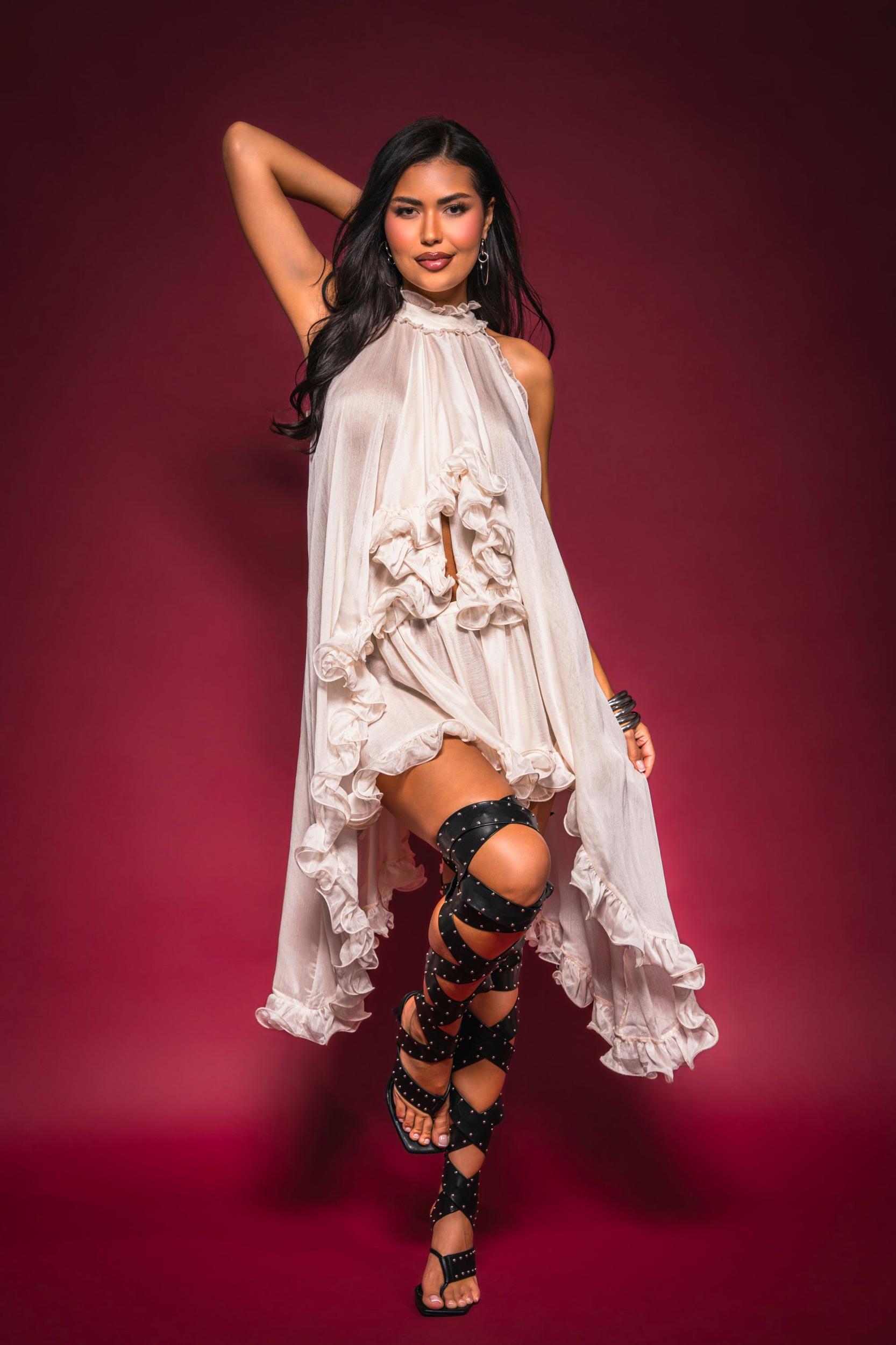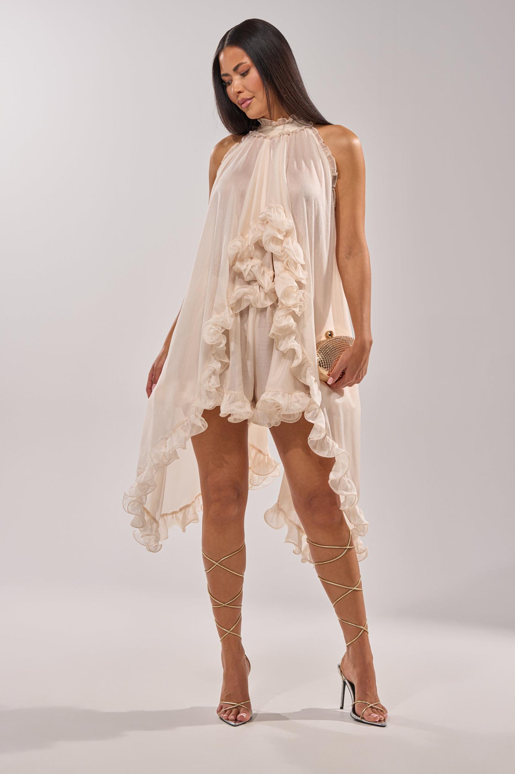 Ivory ruffled chiffon high-low blouse designed for romantic layering and statement dressing, perfect for special occasions, editorial styling, and elevated evening looks. Featuring a high gathered neckline with a pearl button closure, sheer lightweight chiffon construction, cascading asymmetrical ruffle trim, and a flowing draped silhouette, this blouse delivers dramatic movement with an ethereal finish. Style with the coordinating AKIRA Label Talk to Me Mesh Shorts for a beautiful matching look. - 100% Polyester- Hand Wash Cold- No Stretch- Imported (all measurements are approximate from size S/M)- 17” Shoulder to Front Hem- 51” Shoulder to Back Hem- 9” Shoulder to Shoulder- Model is 5’9” and wearing size smallProduct ID: 1077499 (all measurements are approximate from size 1X/2X)- 17” Shoulder to Front Hem- 51” Shoulder to Back Hem- 12” Shoulder to ShoulderProduct ID: 1077501