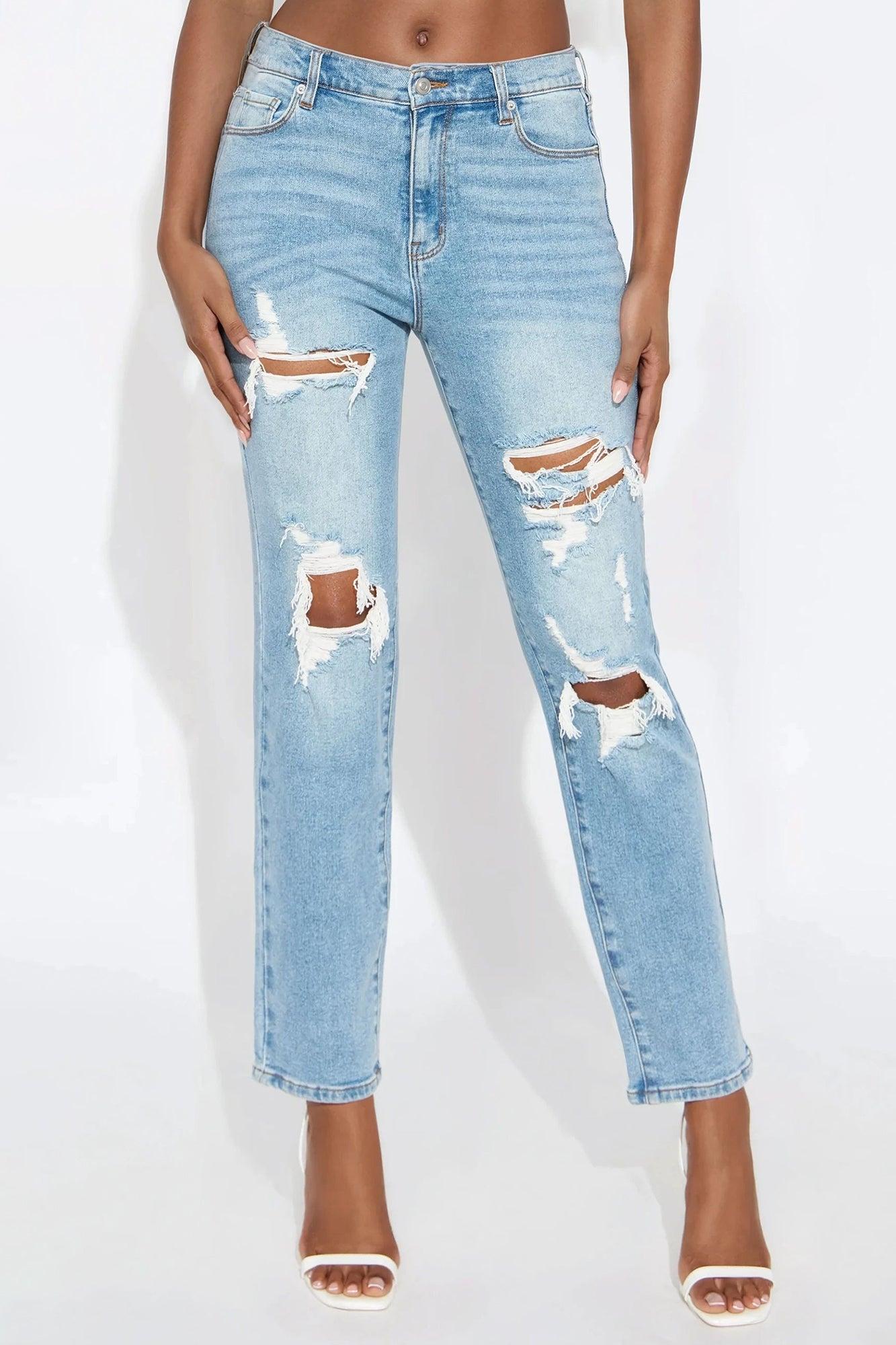 Available In Medium Blue Wash. Mom Jean Available In Medium Blue Wash. Low Stretch Ripped 5 Pocket 32" Inseam 11.5" High Rise Disclaimer Due To The Specialized Wash Process, Each Garment Is Unique. 98% Cotton 2% Spandex Imported California Proposition 65WARNING: Cancer and Reproductive Harm - www.P65Warnings.ca.gov.