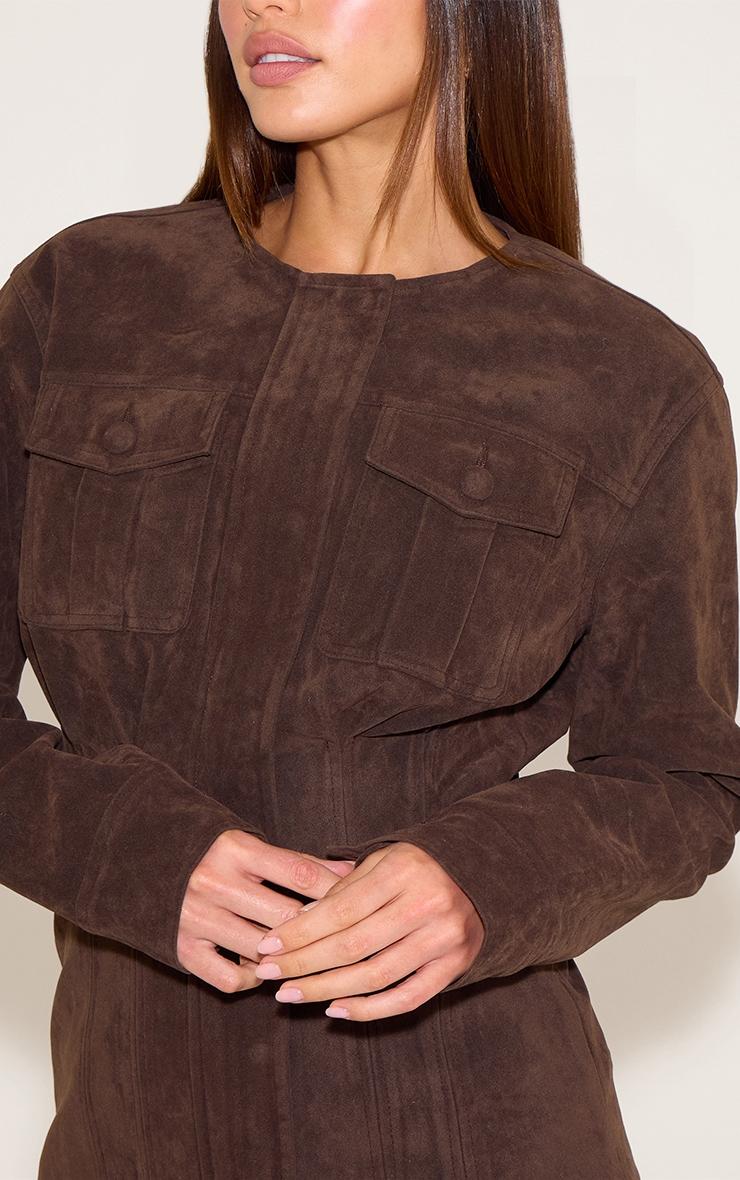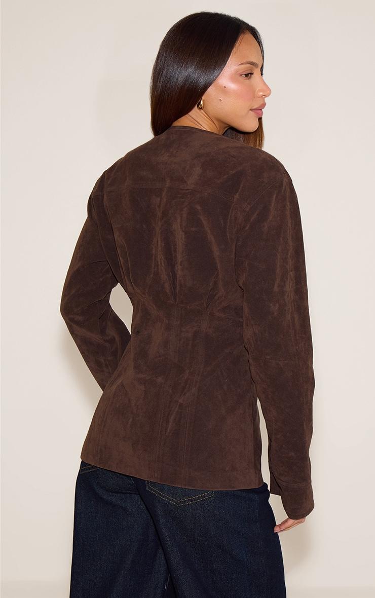 Elevate your layering pieces with this tall chocolate faux suede covered button cinch waist jacket. Crafted from a chocolate faux suede material with covered button detailing and a cinched waist fit, it creates a flattering structured silhouette. Style with tailored pants and boots for a refined finish.Length approx 63.5cm/25inch (Based on sample size US 4)Model wears size UK 8/ EU 36/ AUS 8/ US 4Model Height - 5ft 9inchp]:!mb-4inch>Brand: PrettyLittleThingCategory: OuterwearProduct type: JacketColor: ChocolateMaterial: Faux LeatherNeckline: CrewSleeves: LongOccasion: Day