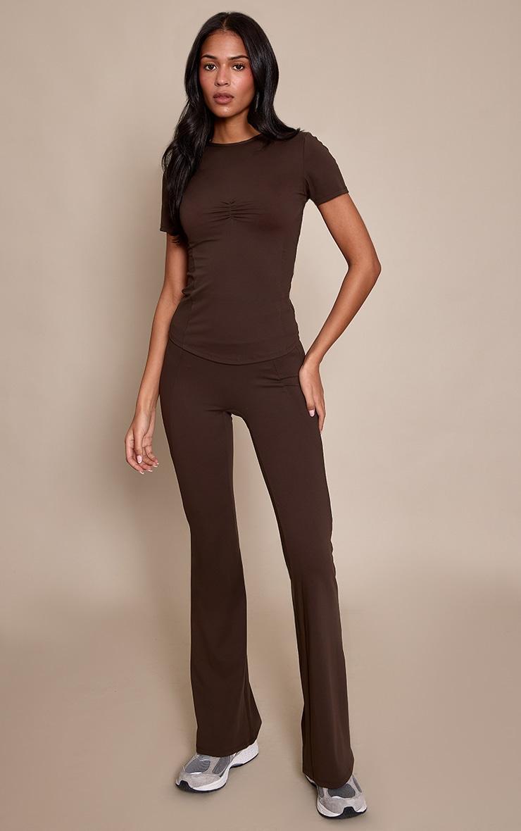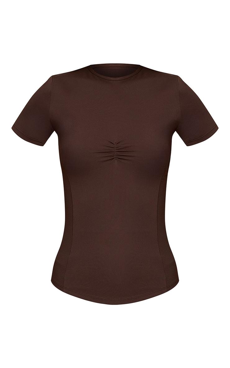 Perfect your gym rotation with the tall chocolate sculpt rib panel ruched front gym top. This fitted top features a crew neck, short sleeves, ribbed panels, and a ruched front. Delivering style and comfort for workouts or coffee runs. Pair with matching leggings and sneakers, adding minimal accessories for a cohesive style.Length approx 58.5cm/23inch (Based on sample size US 4)Model wears size UK 8/ EU 36/ AUS 8/ US 4Model Height - 5ft 10inchp]:!mb-4inch>Brand: PrettyLittleThingCategory: AthleisureProduct type: T-ShirtColor: ChocolateMaterial: Contour RibOccasion: Day