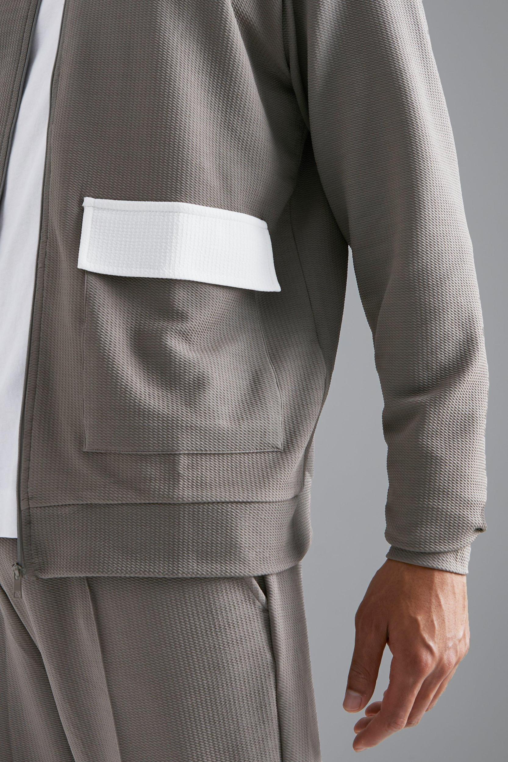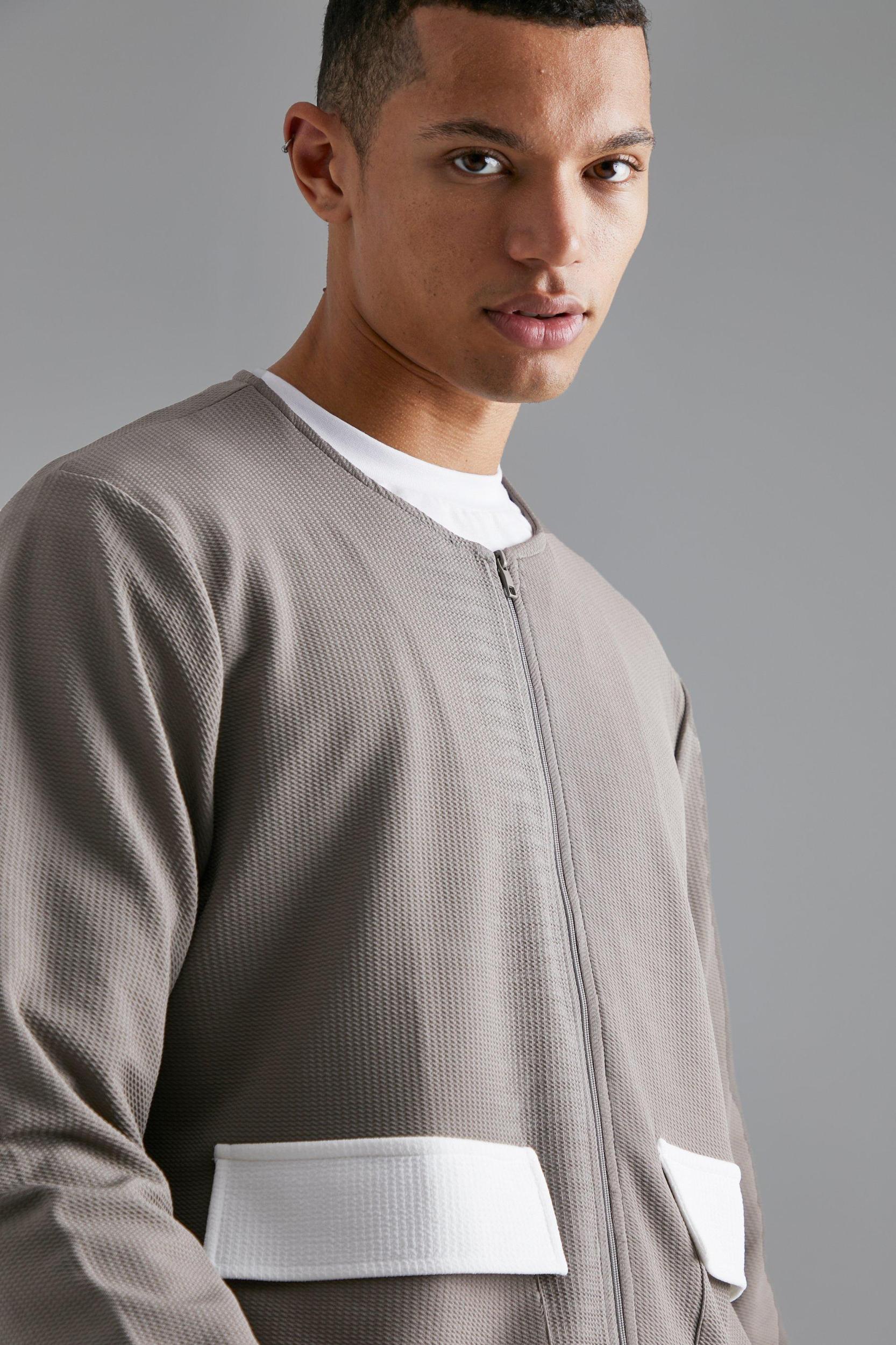 Keep out the chill while looking slick in a boohooMAN coat. Rev up your outerwear inventory this season with our unrivalled collection of coats and jackets for men. Whether you're looking for a heavy coat to combat the low temperatures, or a lightweight jacket to stand out while having fun at your favourite festival, we've got the trendiest designs to finish off your outfit with. Puffers, parkas and borg jackets are the perfect choices if you want to bundle up without sacrificing on style, and they look great when teamed up with chunky knitwear, denim and boots. Bombers and overcoats are beyond versatile and can turn any getup from laid-back to dapper in no time. Denim and Harrington jackets can't be missing in your trans-seasonal wardrobe, while cagoules and coach jackets will keep out the chill while you're out and about.Style: Bomber JacketDesign: Fabric InterestFabric: JerseyLength: RegularFit: RegularSleeve Length: Long Sleeve