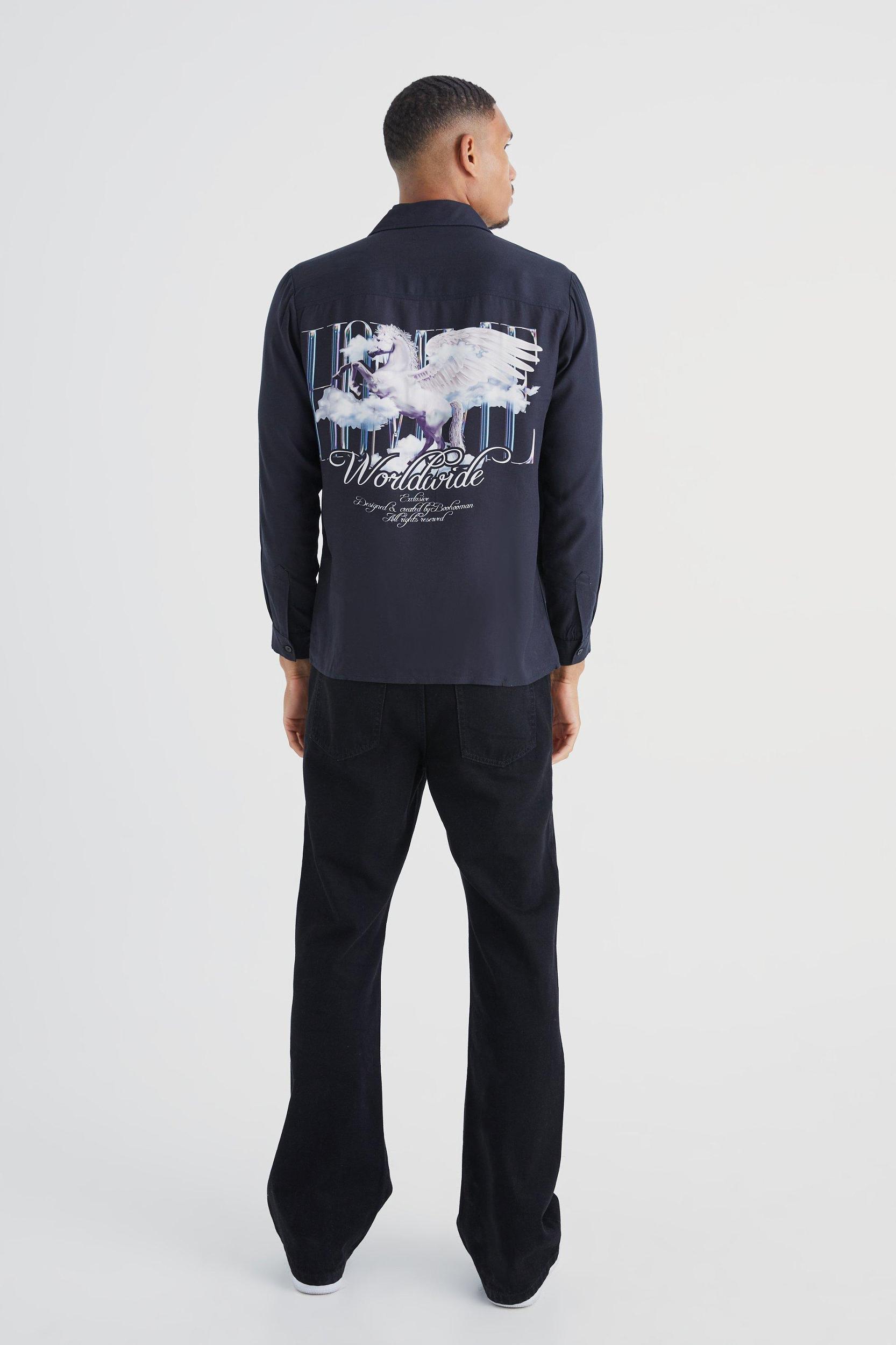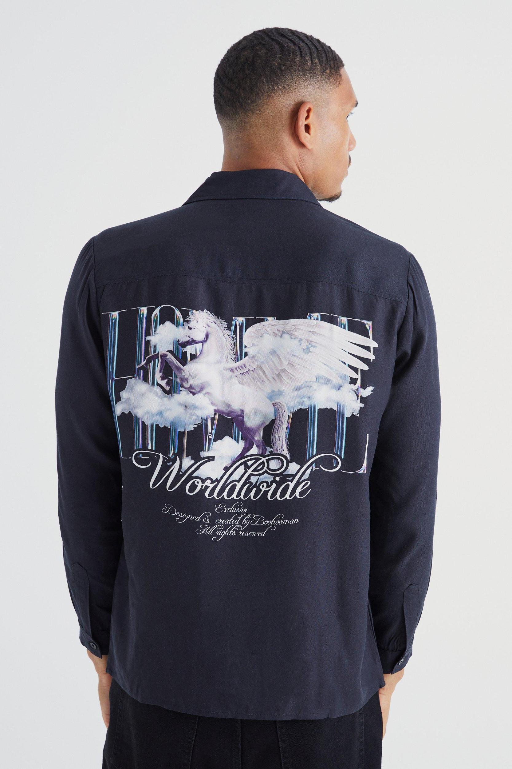 Introduce some subtle dapperness into your day-to-day lineup with a shirt. You'll be surprised at how easy it is to throw together a sophisticated ensemble with a plain shirt from our extensive range. If you want to look sharp by keeping it simple, pair a checked shirt with a blazer and skinny jeans. Finish off with a pair of brogues or Chelsea boots for an outfit that delivers dapperness from the office to the bar. f you are looking for the ultimate summer outfit, our selection of printed shirts will make sure you'll get noticed.Style: Printed ShirtDesign: GraphicFabric: PolyesterDetail: Placement PrintLength: RegularNeckline: CollaredFit: RegularSleeve Length: Long Sleeve