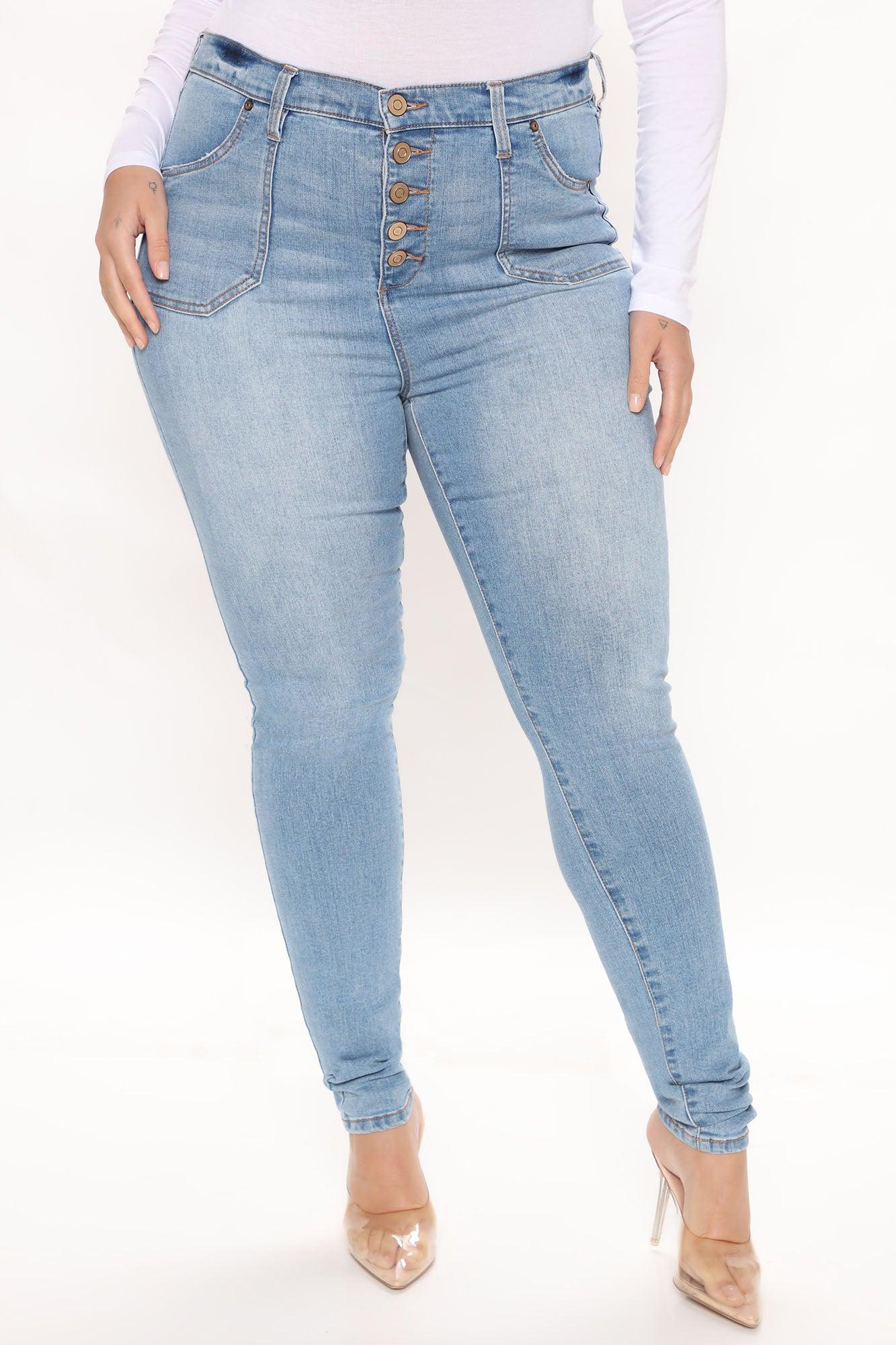 Available In Light Blue Wash. Skinny Jean Medium Stretch Exposed Button Fly Pork Chop Pockets Back Pockets 11" High Rise Available In Light Blue Wash. Disclaimer: Due To The Specialized Wash Process, Each Garment Is Unique. 42% Cotton 32% Polyester 24% Rayon 2% Spandex Imported California Proposition 65WARNING: Cancer and Reproductive Harm - www.P65Warnings.ca.gov.