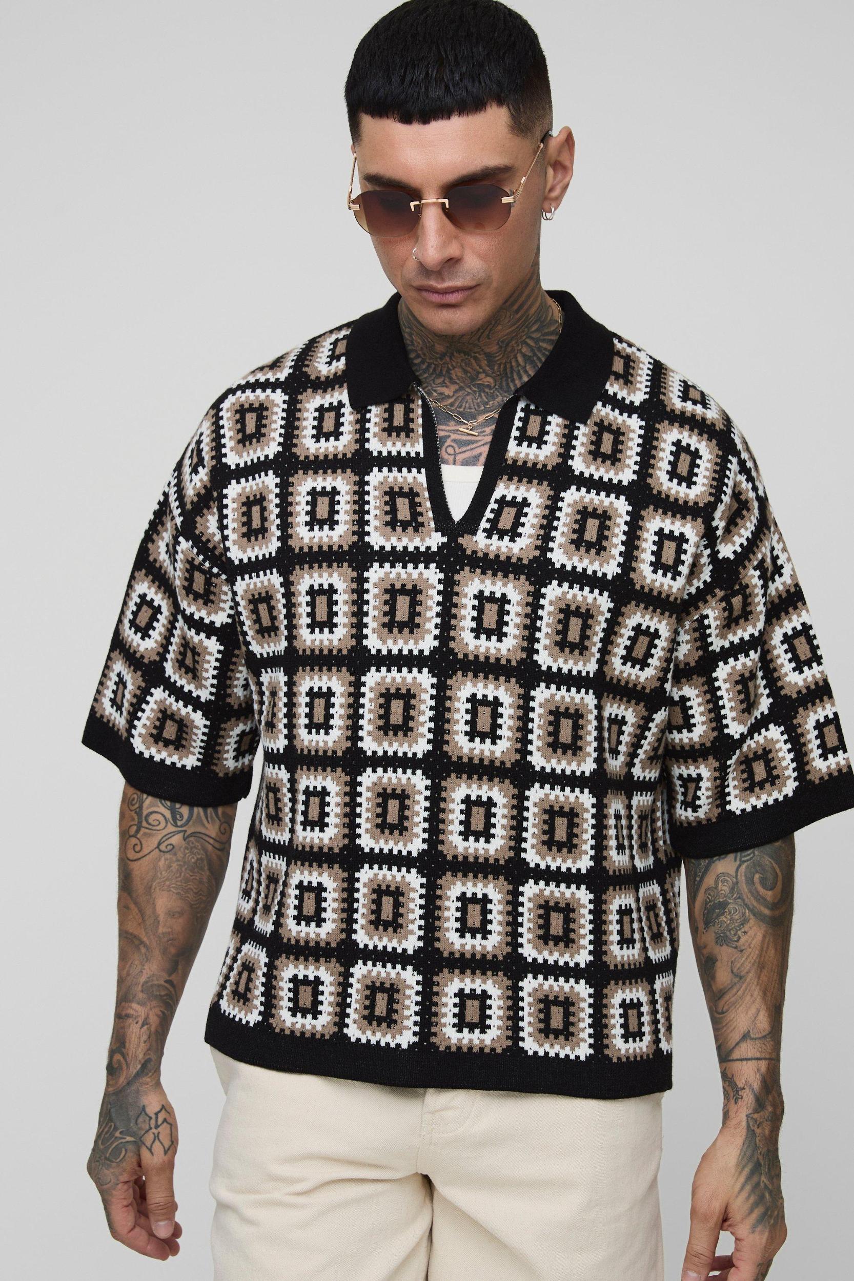 Tall Oversized Boxy Crochet Knit Polo In Black | boohooMAN USA