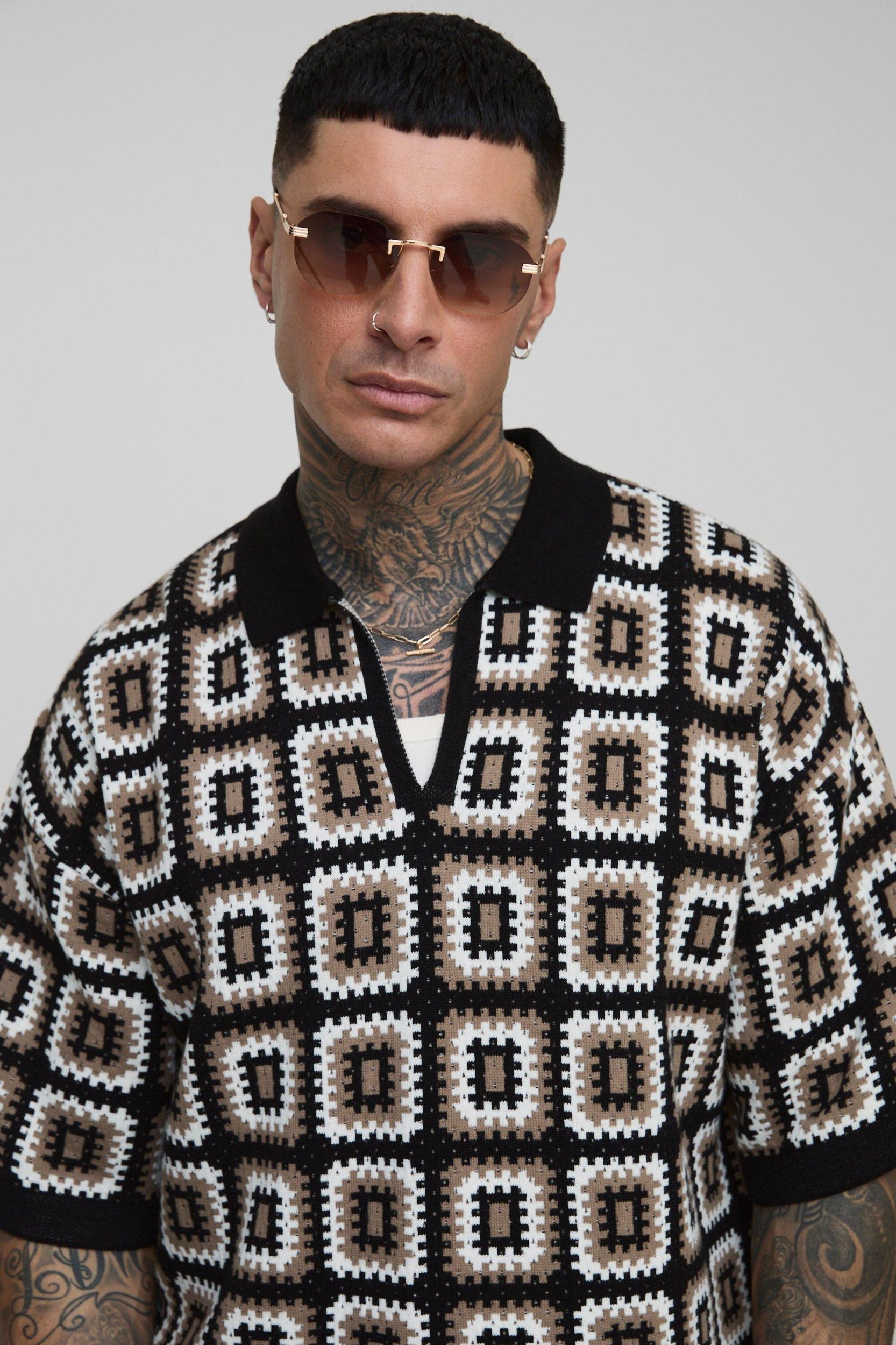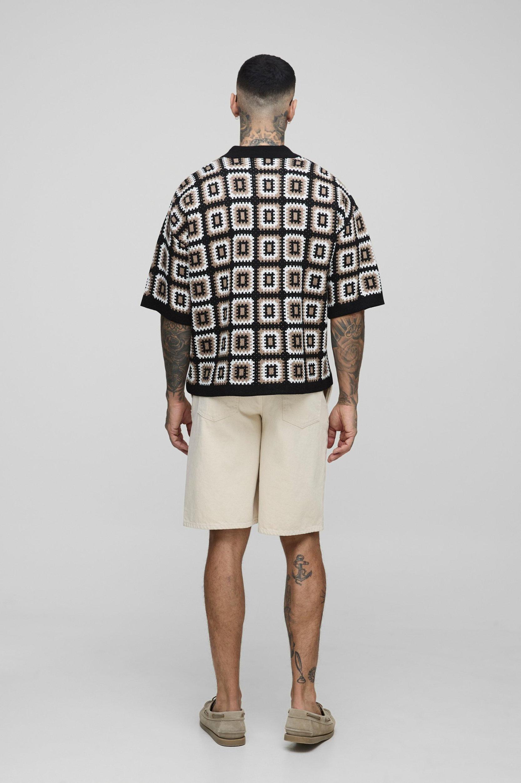 Tall Oversized Boxy Crochet Knit Polo In Black | boohooMAN USA Product Image
