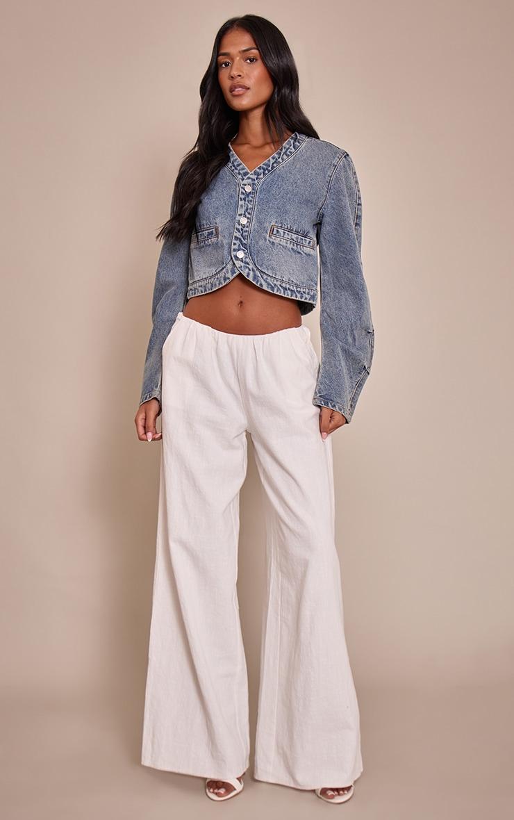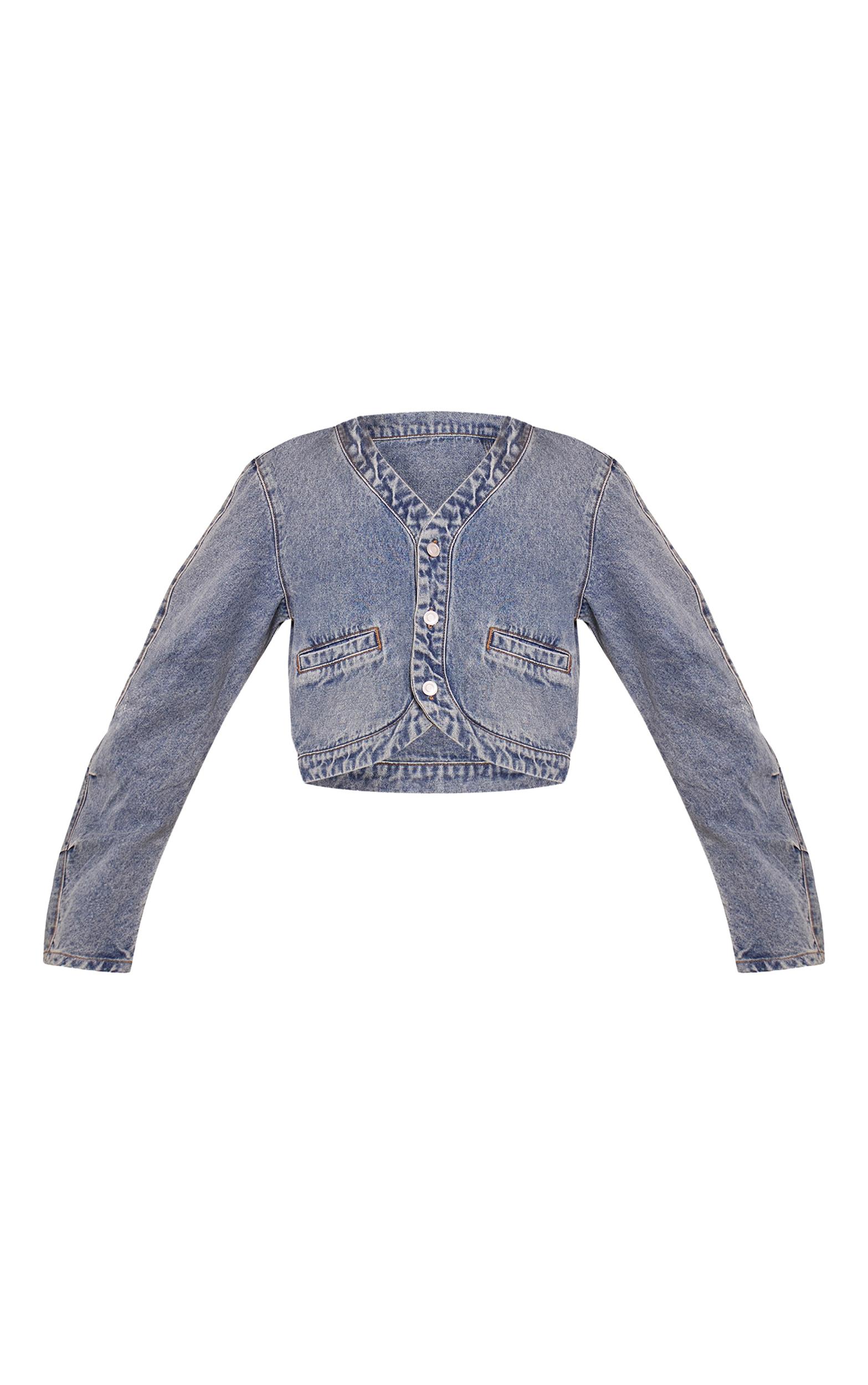Injecting a dose of vintage cool into your wardrobe, this piece stands apart. The tall vintage v neck curved hem cropped denim jacket in a versatile vintage wash features a distinctive V-neckline and a playful curved hem, creating an assured cropped silhouette that instantly elevates any look. Its relaxed cut, complete with neat button-front fastening and functional chest pockets, lends a refined edge to classic denim. Wear it effortlessly over a simple Tank and tailored wide-leg pants for an elevated day ensemble, or contrast its relaxed form with a sleek midi dress. Finish the look with some confident chunky boots to nail the aesthetic, adding a touch of polish with subtle gold earrings. This is an essential for mastering confident, considered style.Length approx 42cm/16.5inch (Based on sample size US 4)Model wears size UK 8/ EU 36/ AUS 8/ US 4Model Height - 5ft 10inchp]:!mb-4inch>Category: DenimProduct type: Cropped Denim JacketColor: Vintage WashMaterial: Rigid DenimDesign: PlainNeckline: CrewSleeves: LongOccasion: Day