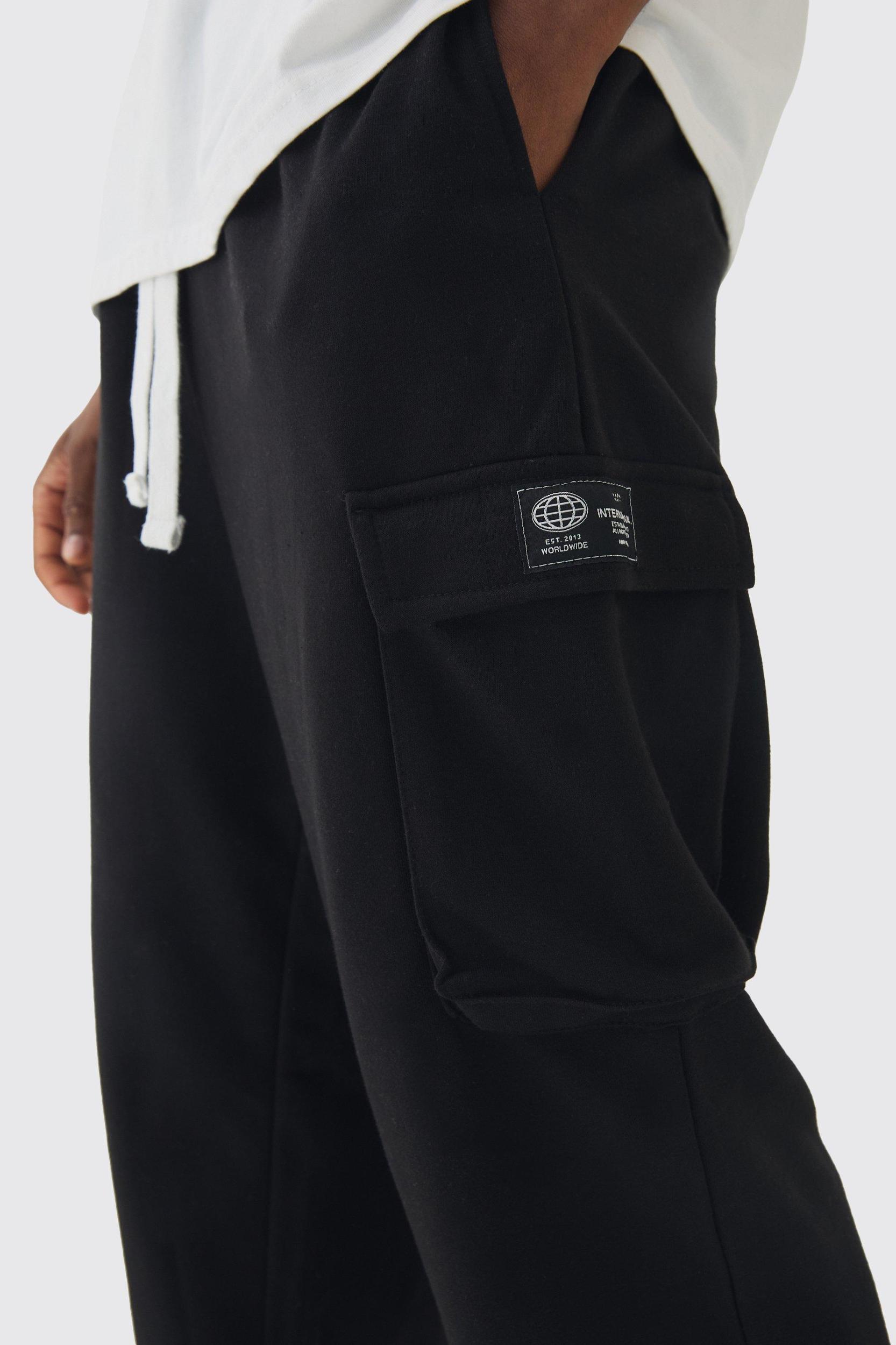 Mens Black Tall Woven Tab Oversized Fit Cargo Joggers - These comfy joggers for tall men are perfect for the sofa or the street. Say goodbye to chilly ankles with BoohooMANs range of tall joggers. Whether youre out pounding the pavement or keeping things cosy on the couch, youll stay warm and comfy in these fleecy trousers designed for extra-long legs. You dont have to compromise on style, either - choose slim, straight or regular fit with loose, split or elasticated hem to pair with your favourite trainers, or go for a cargo jogger if you need them to be a bit more heavy-duty. Team them up with any t-shirt or hoodie for endless loungewear combos.